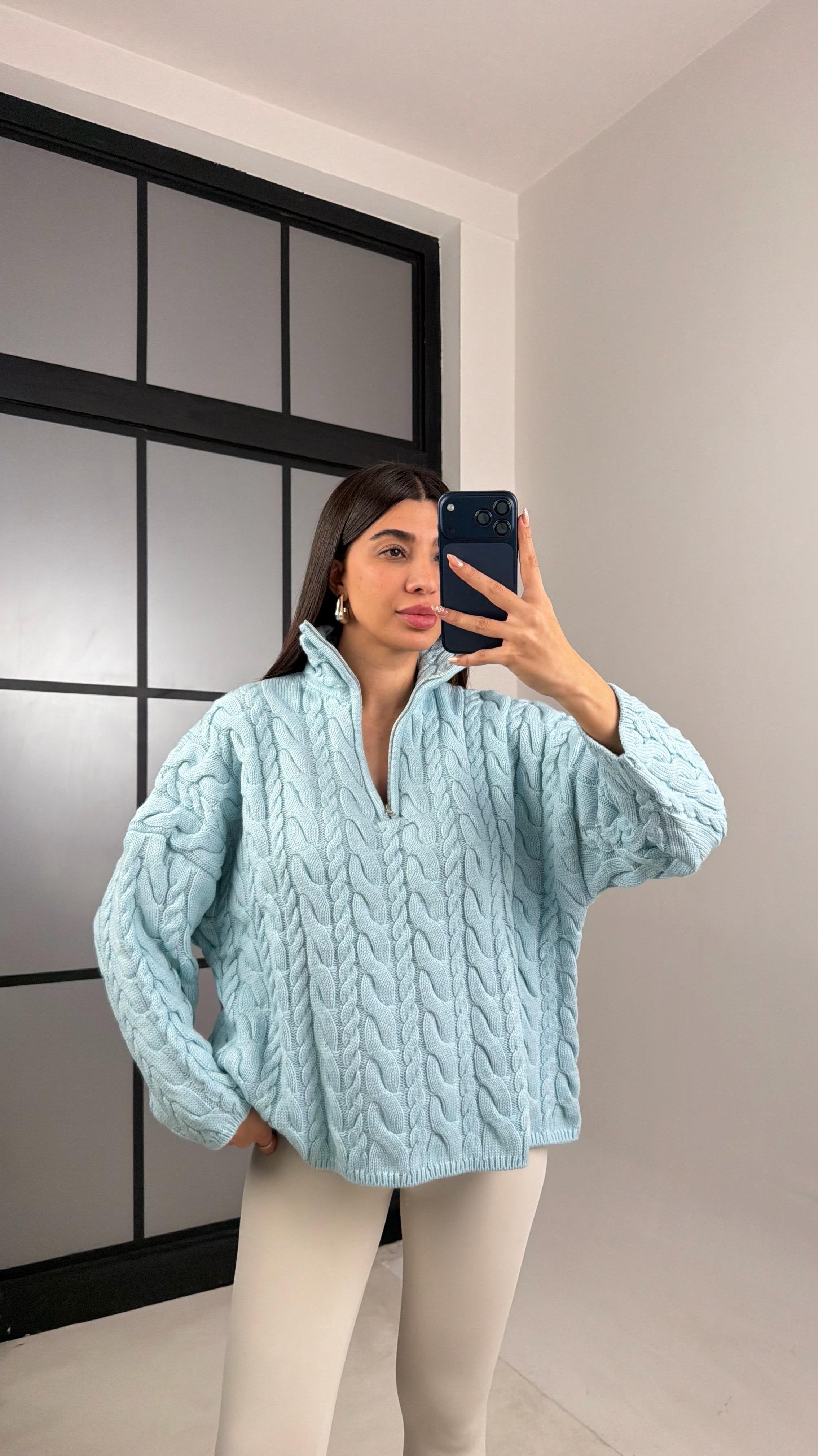 Açık Mavi Fermuarlı Saç Örgülü Kazak GAUS-00855