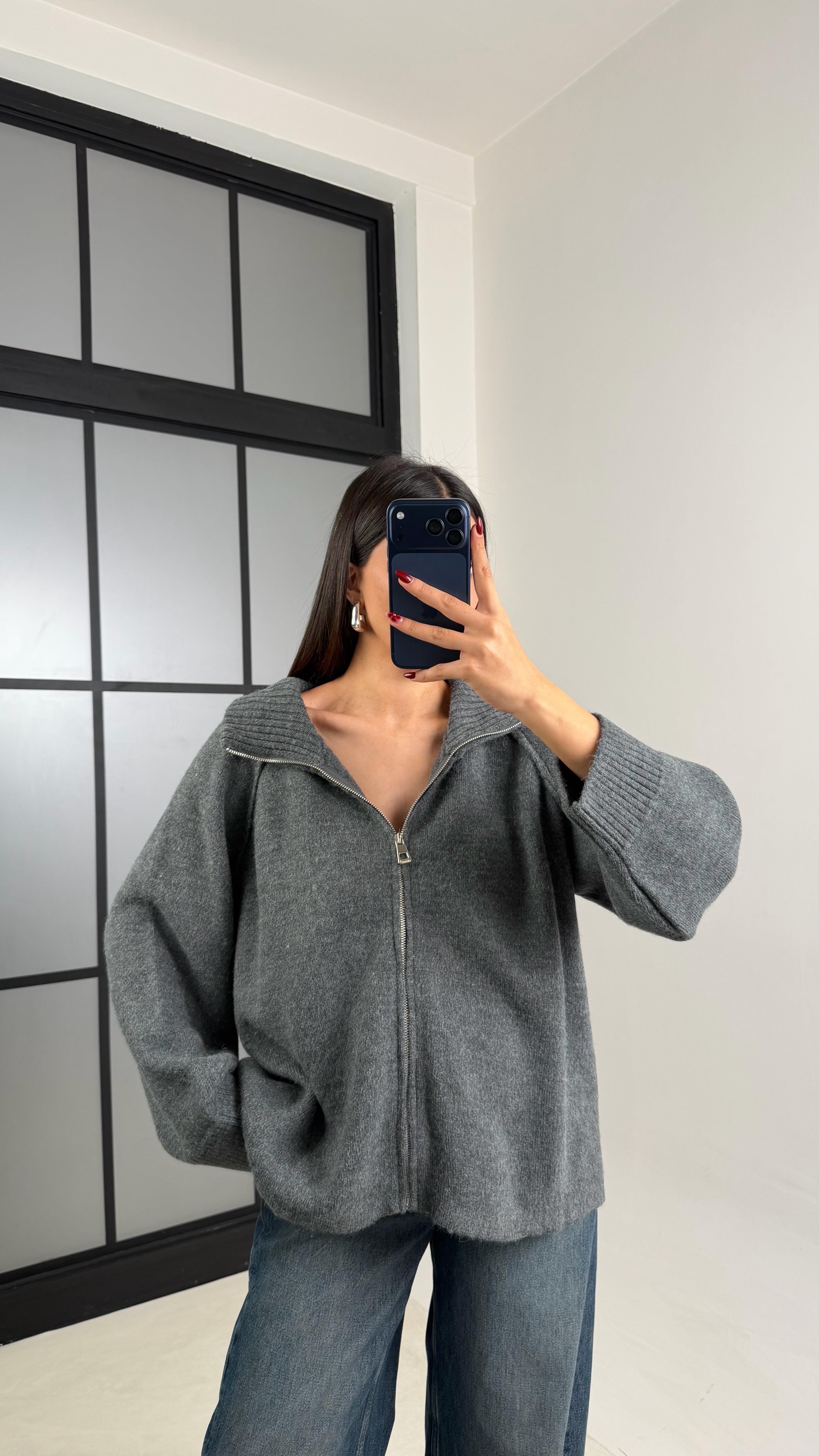 Antrasit Fermuarlı Ters Dikiş Detaylı Hırka GAUS-00760