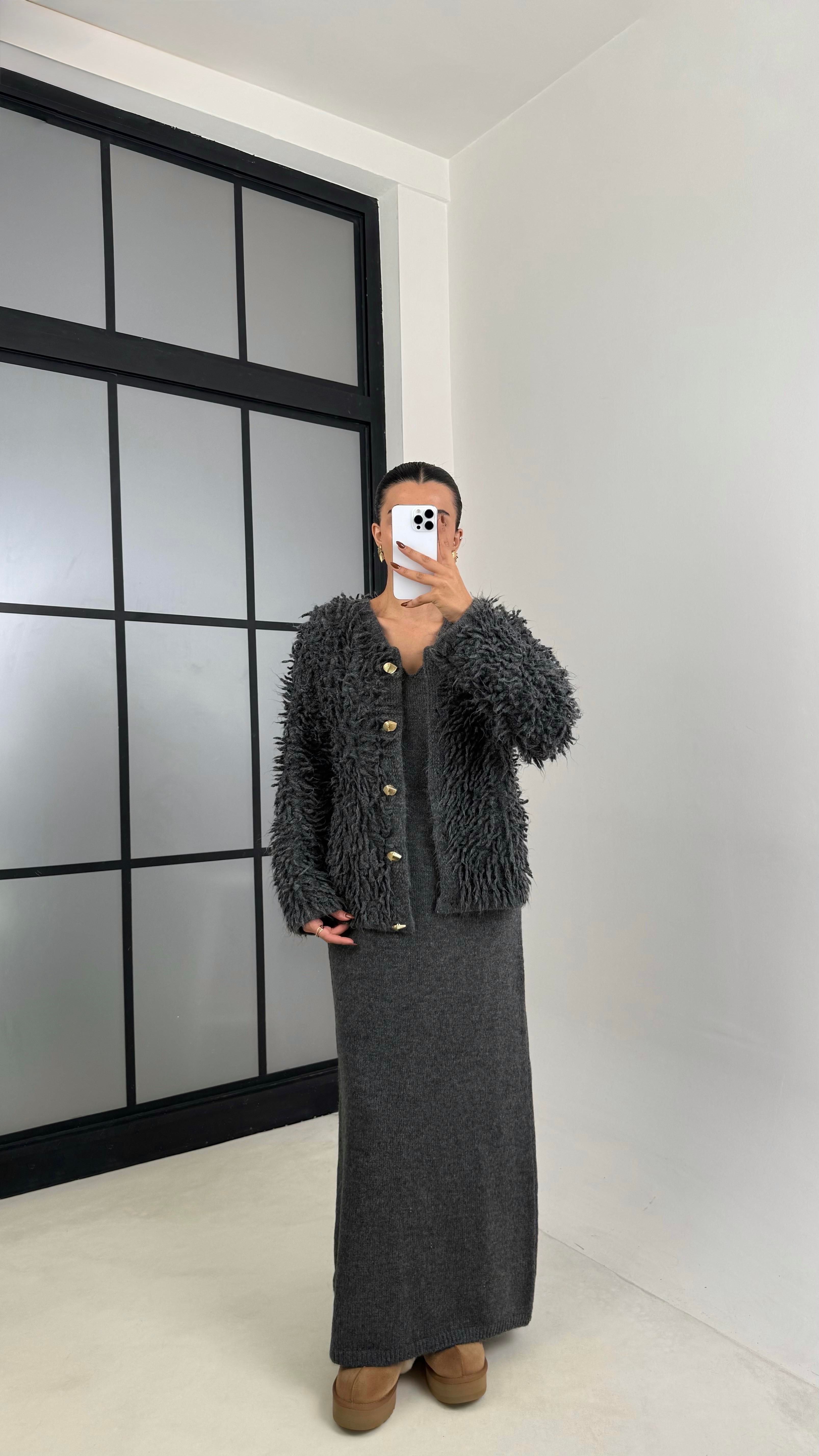 Antrasit Saçaklı Hırka Elbise 2'li Triko Takım GAUS-00482