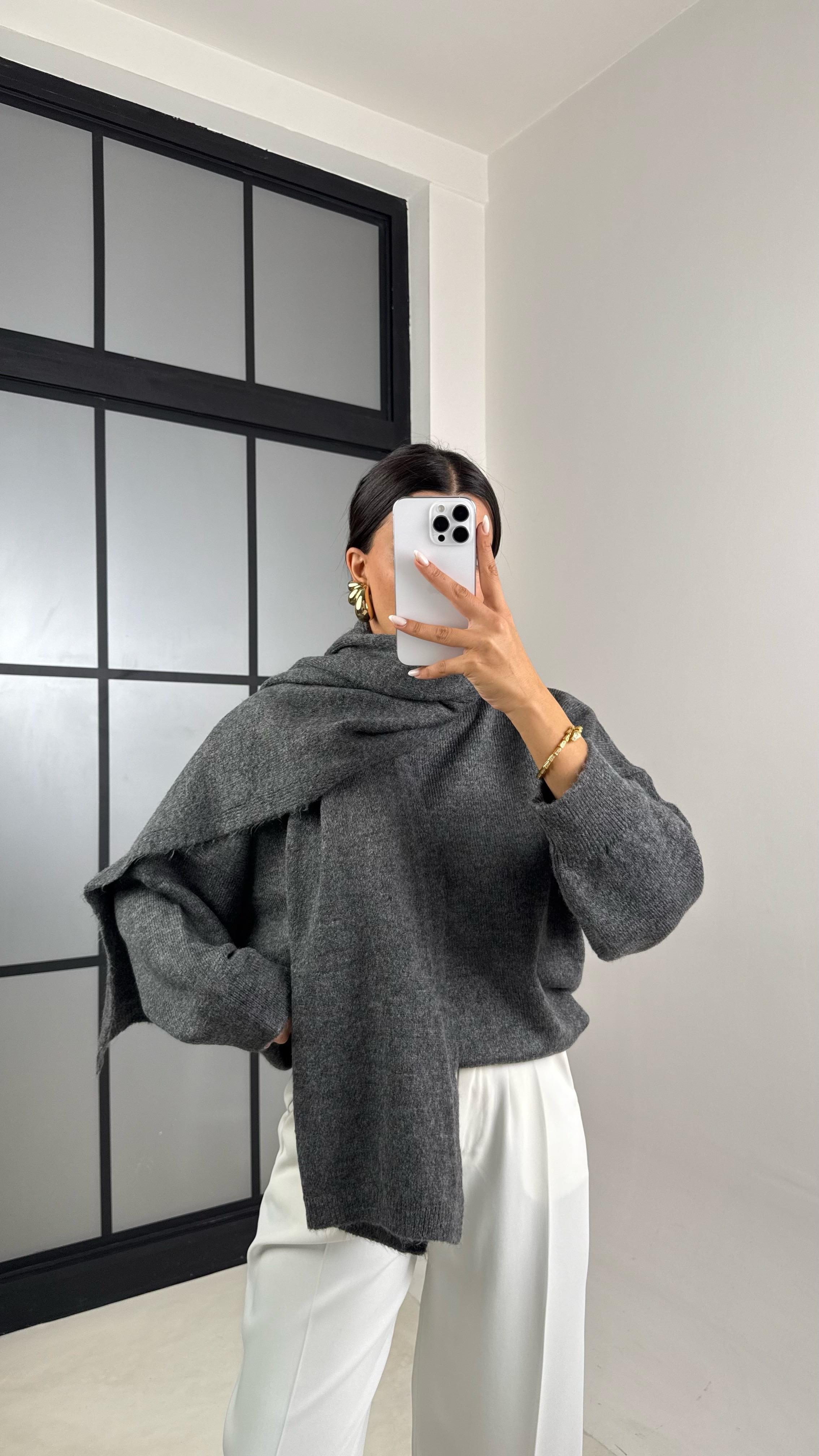 Antrasit Şal Detaylı Triko Kazak GAUS-00524