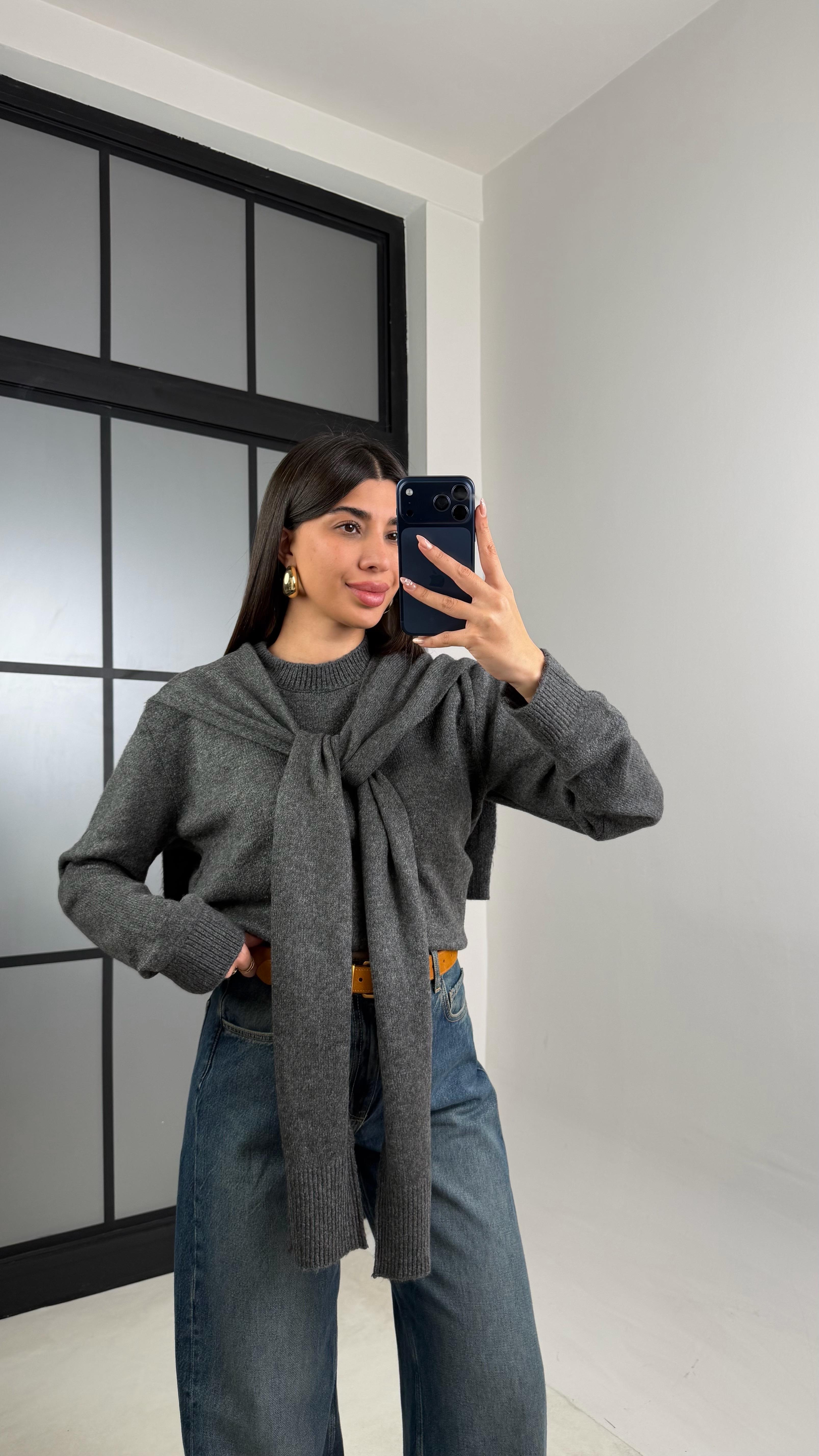 Antrasit Şal Detaylı Triko Kazak GAUS-00862