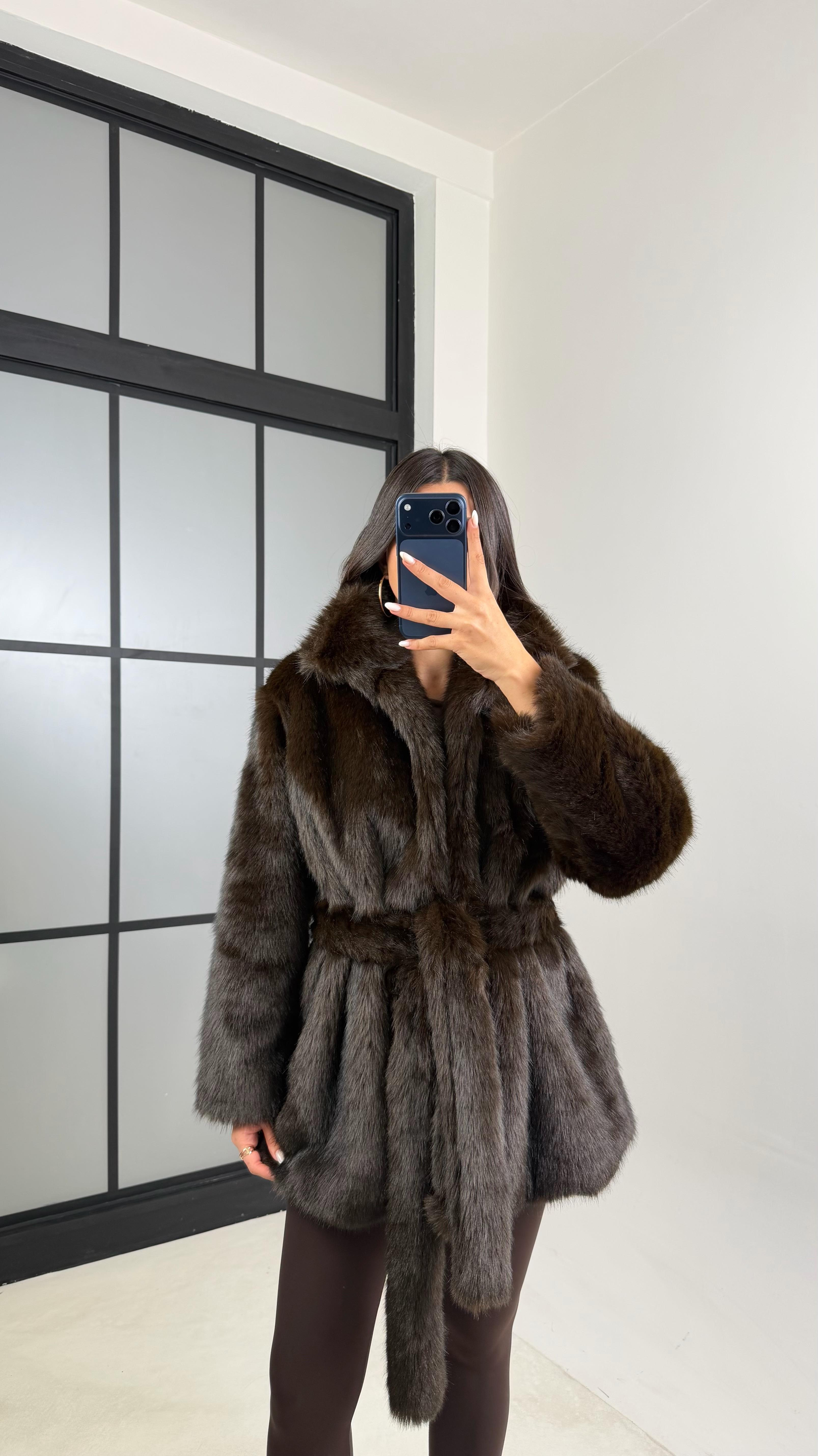 Acı Kahve Astarlı Kuşaklı Premium Kürk GAUS-00649
