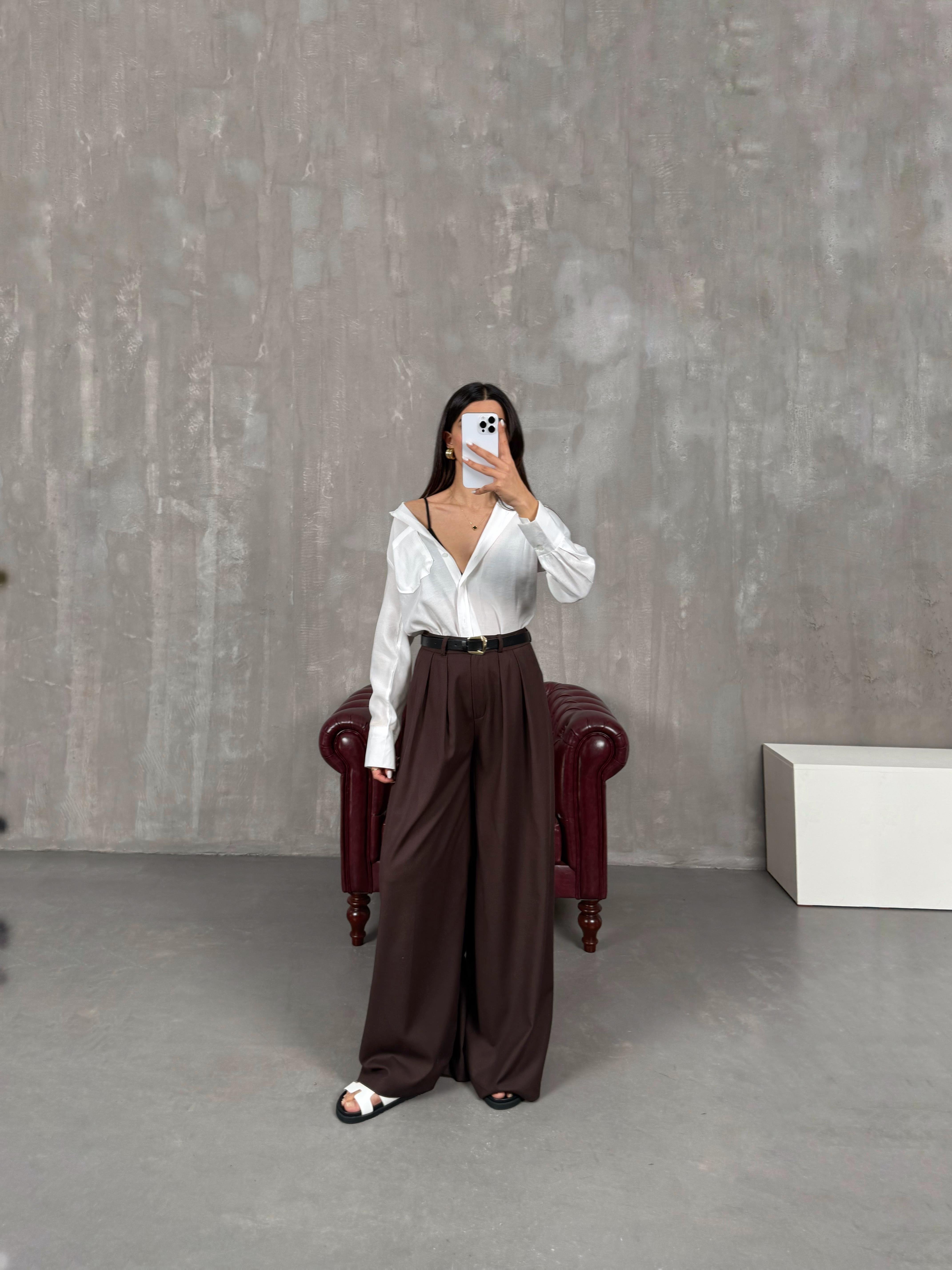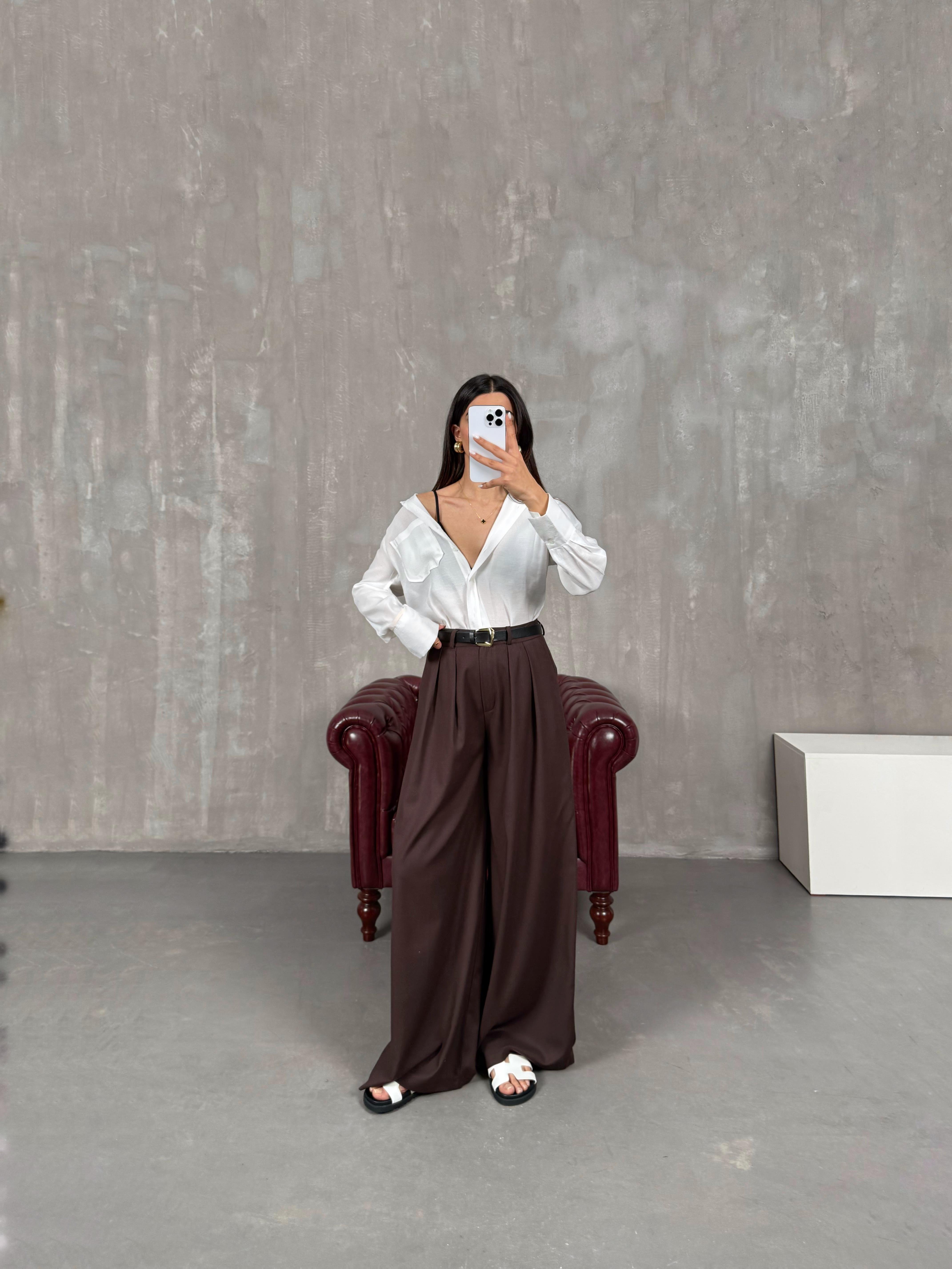 Acı Kahve Kemerli Bol Paça Pantolon Gaus00076