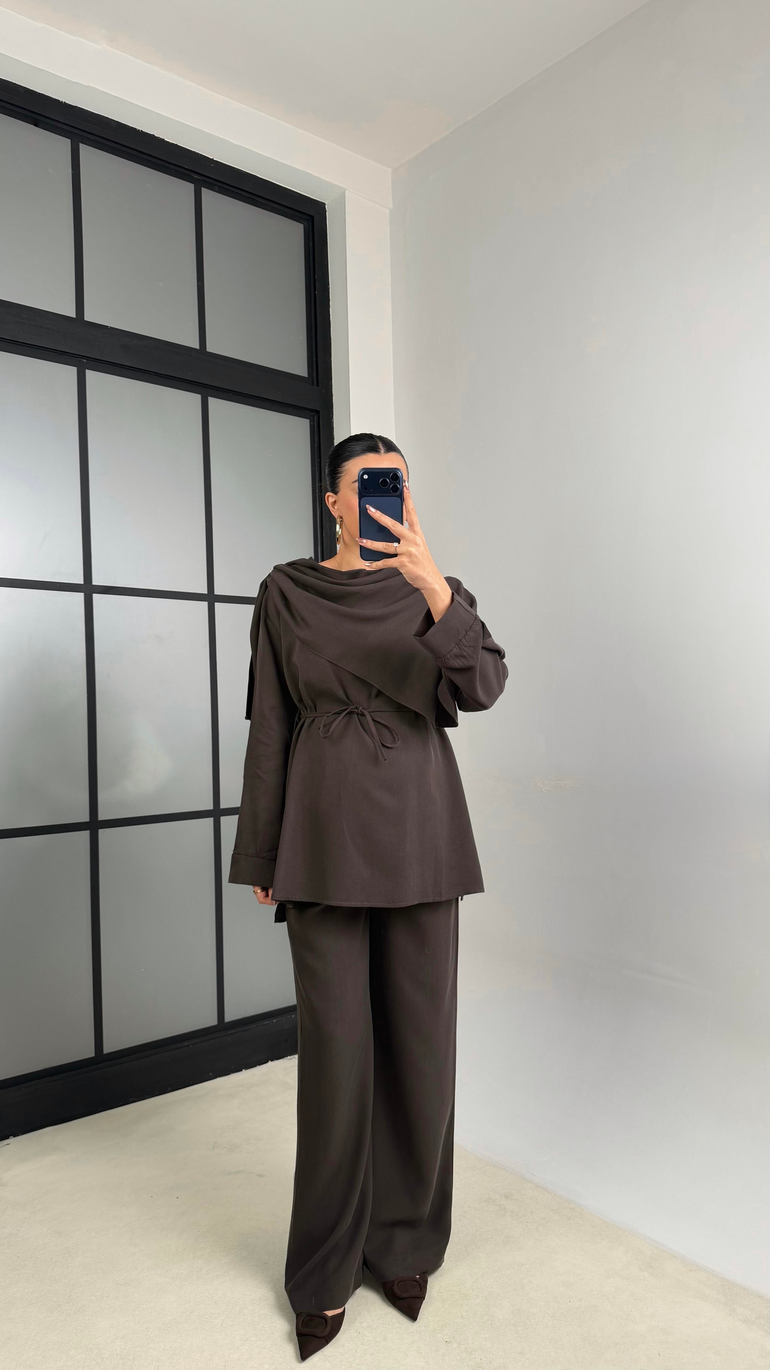 Acı Kahve Şal Detaylı Belden Kuşaklı Beli Lastikli İthal Kumaş İkili Takım GAUS-01154GAUSTAKIMGAUS-01154