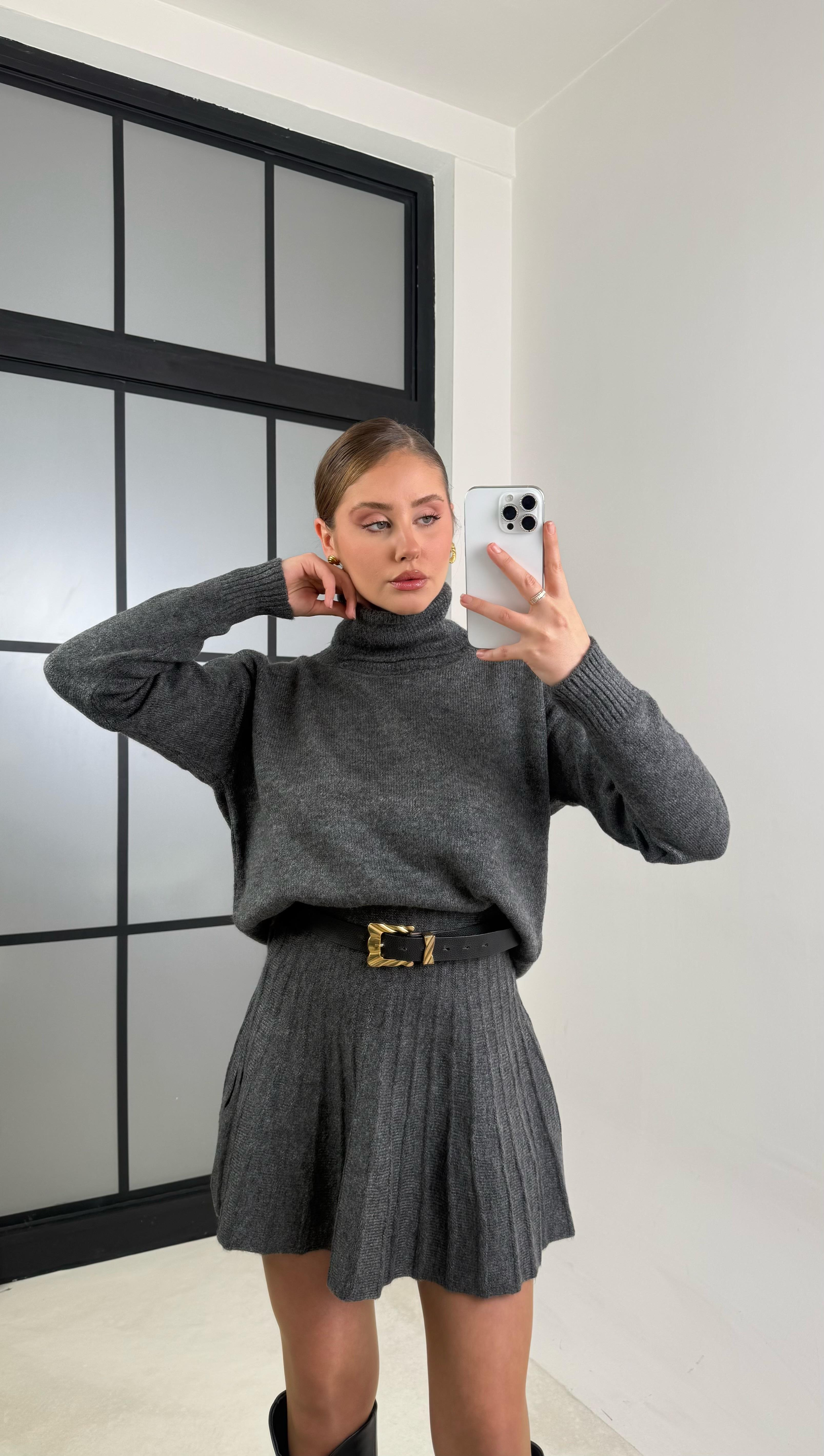 Antrasit Balıkçı Yaka Kazak Pileli Etek İkili Triko Takım GAUS-00708