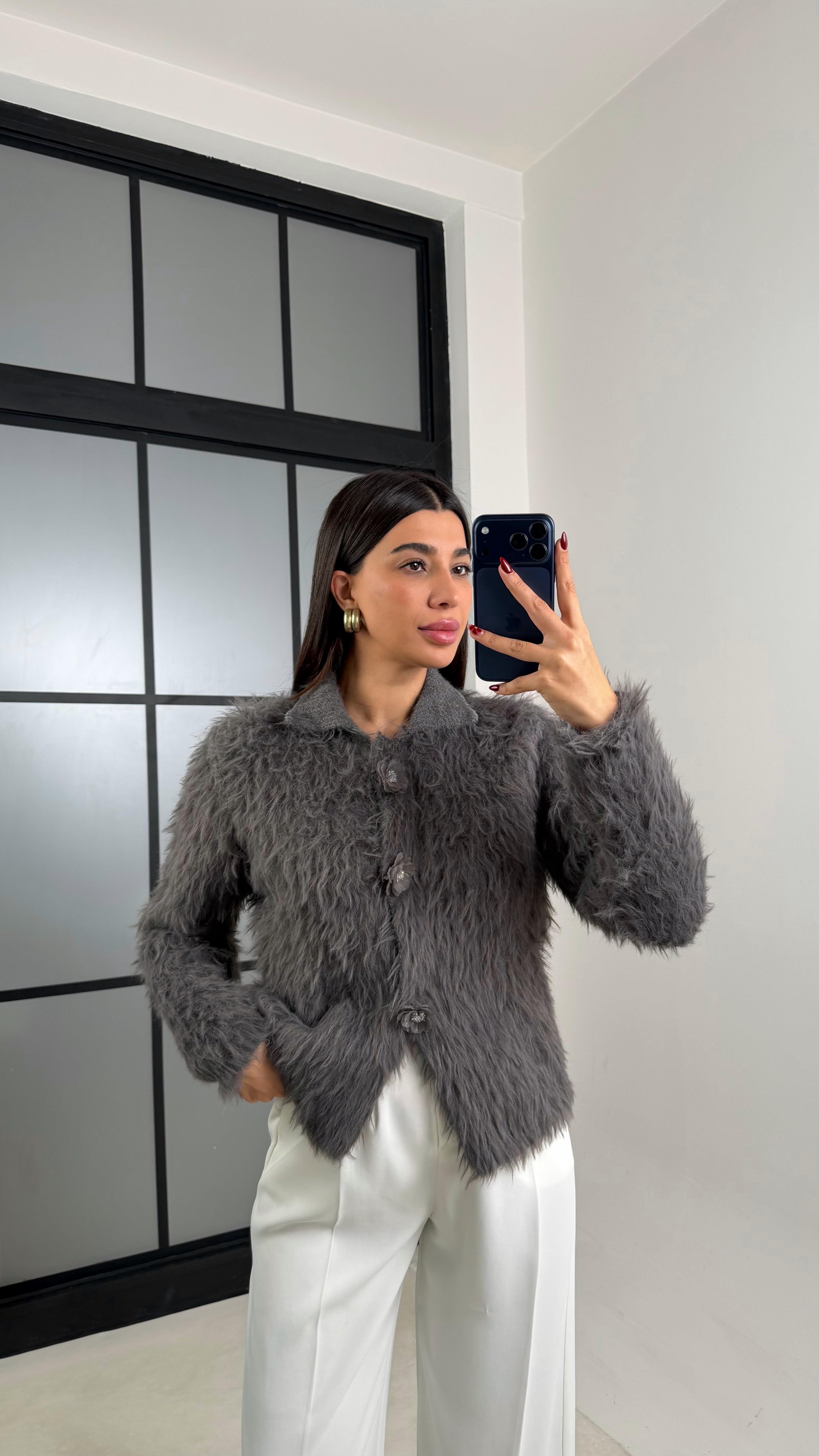 Antrasit Çiçek Düğmeli Sakallı Triko Hırka GAUS-00709GAUS الكارديغان  GAUS-00709