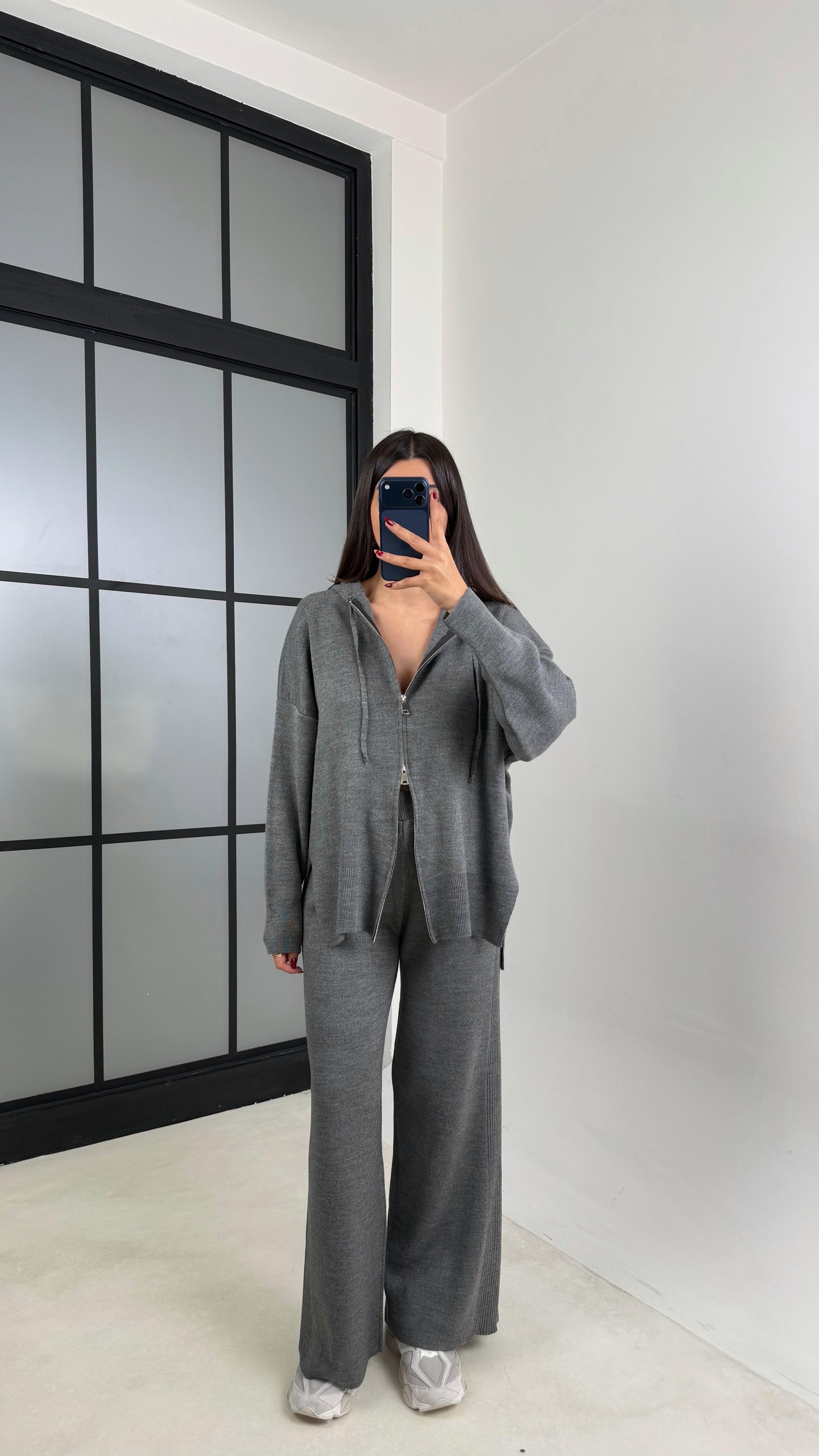Antrasit Çift Fermuarlı Kapüşonlu Hırka Beli Lastikli Pantolon İkili Triko Takım GAUS-00676GAUSTAKIMGAUS-00676
