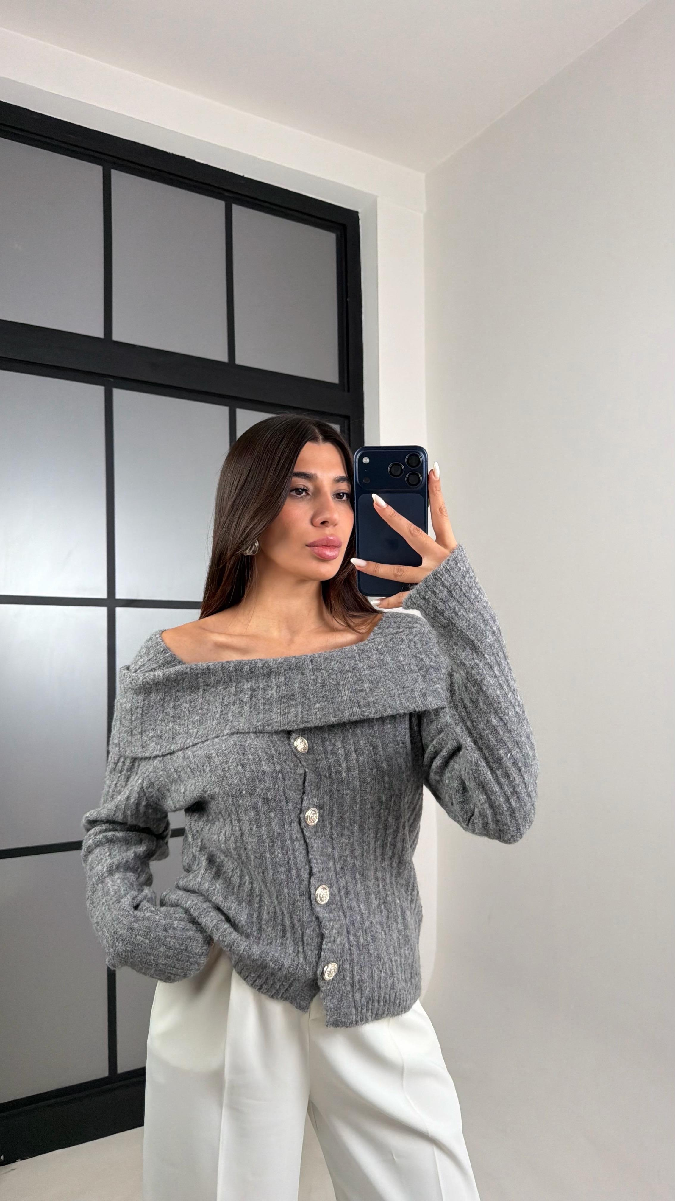 Antrasit Madonna Yaka Düğmeli Triko Kazak GAUS-00612GAUS الكنزات GAUS-00612