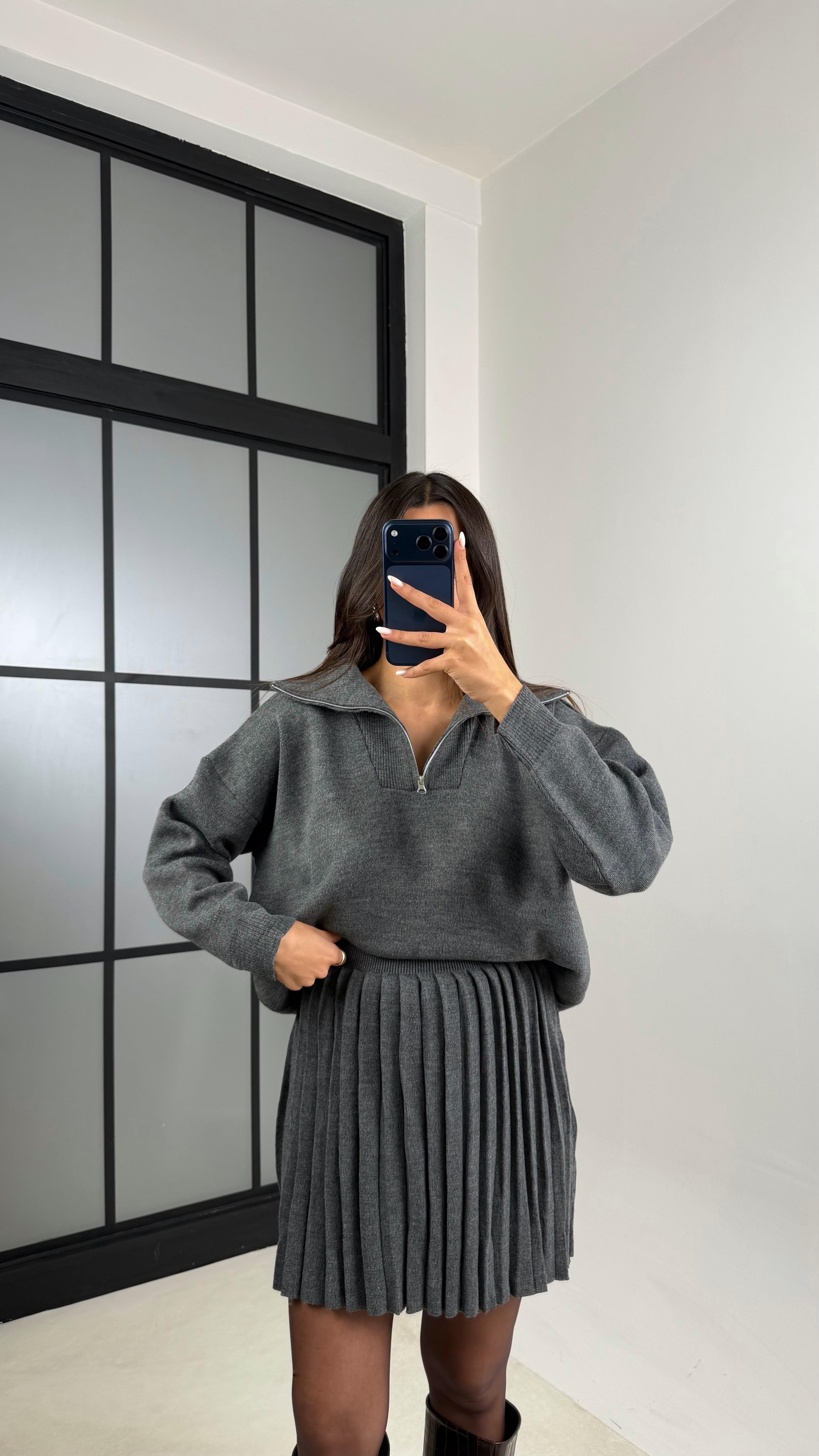 Antrasit Yakası Fermuarlı Kazak Beli Lastikli Pileli Etek Triko Takım GAUS-00204
