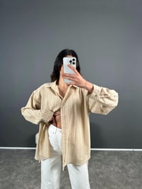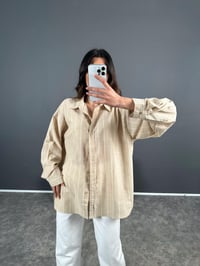 Bej Çizgili Oversize Keten Gömlek