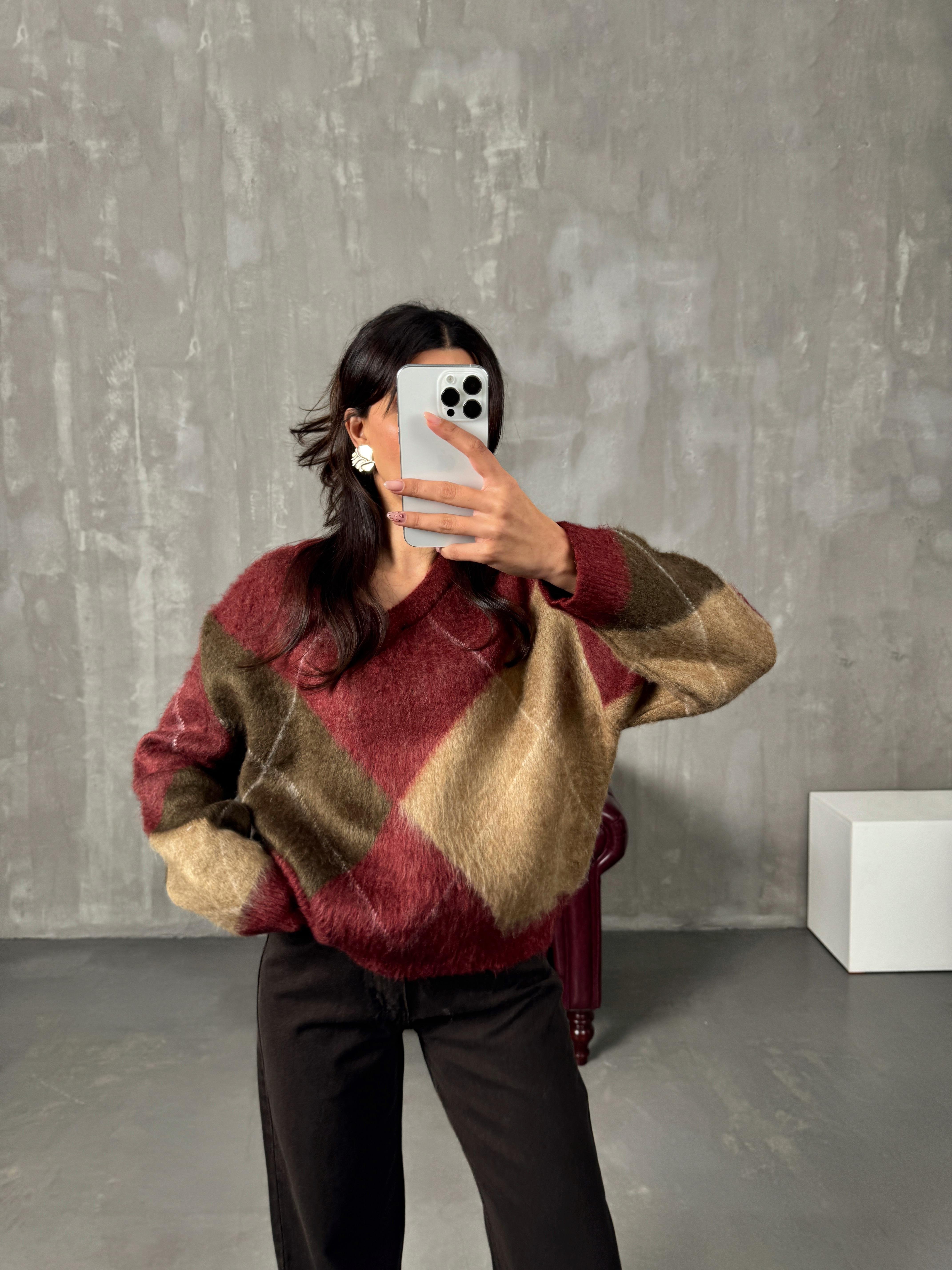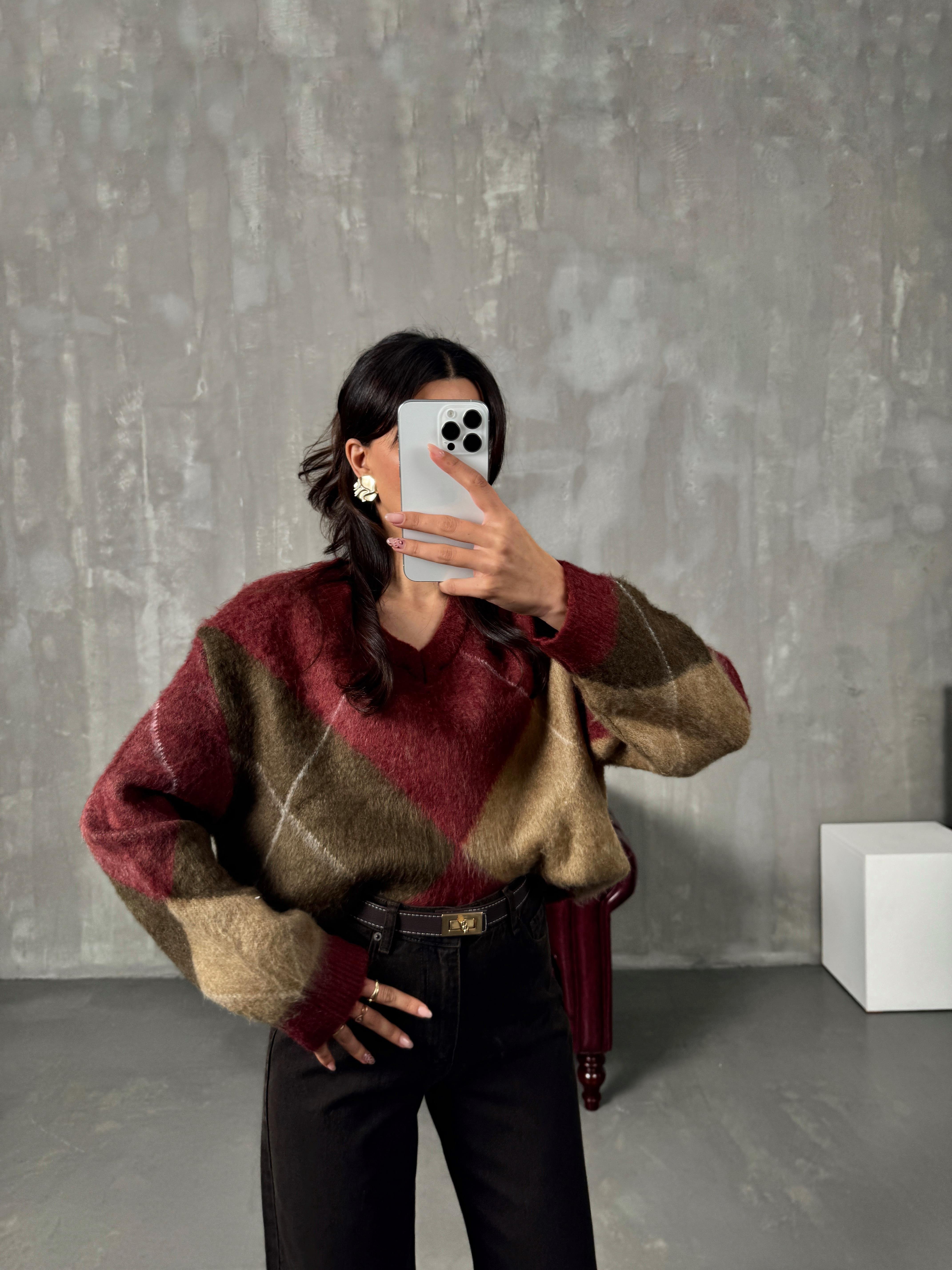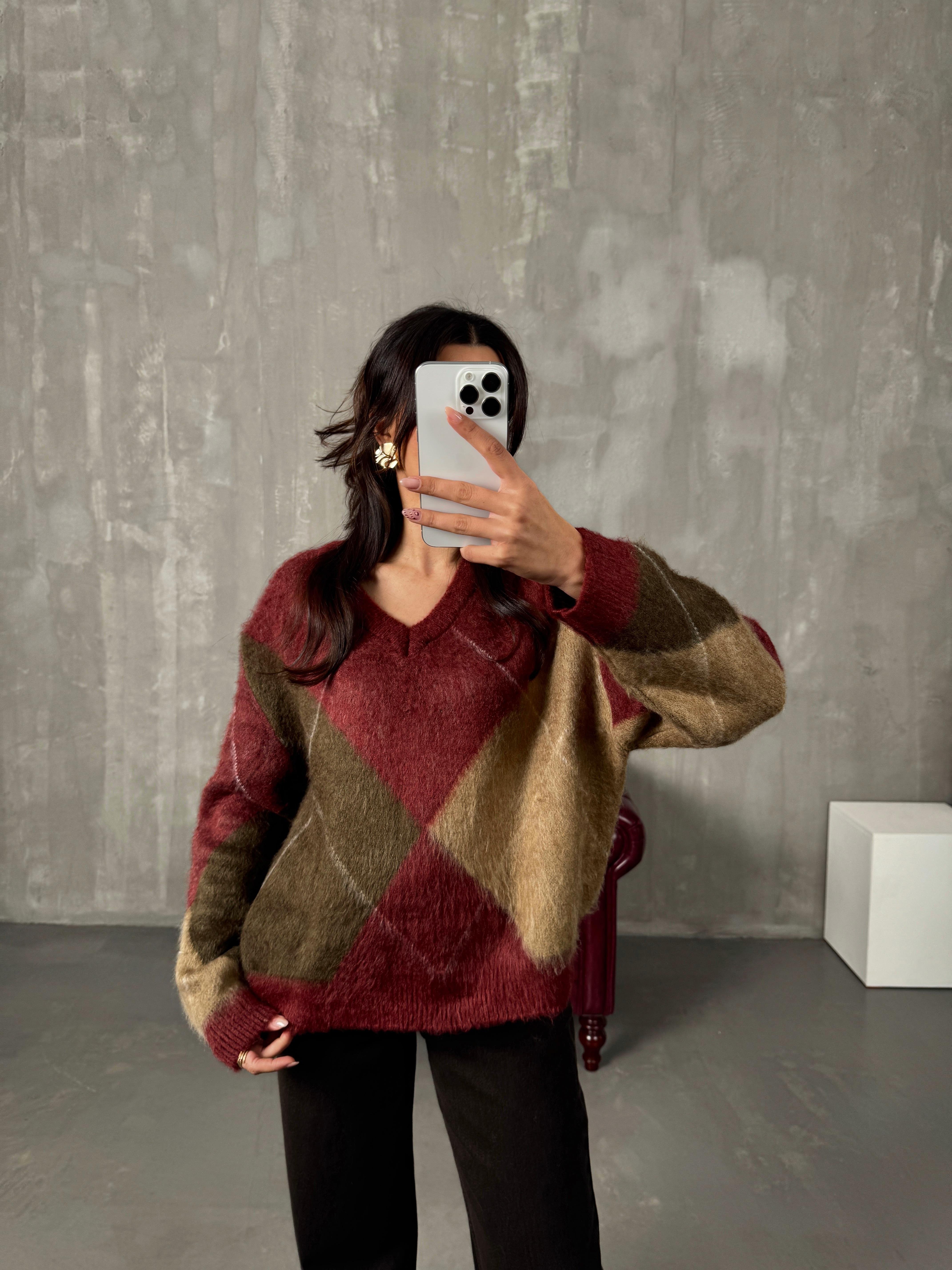 Beji Bordo Kahve Sakallı Baklava Desenli V Kazak