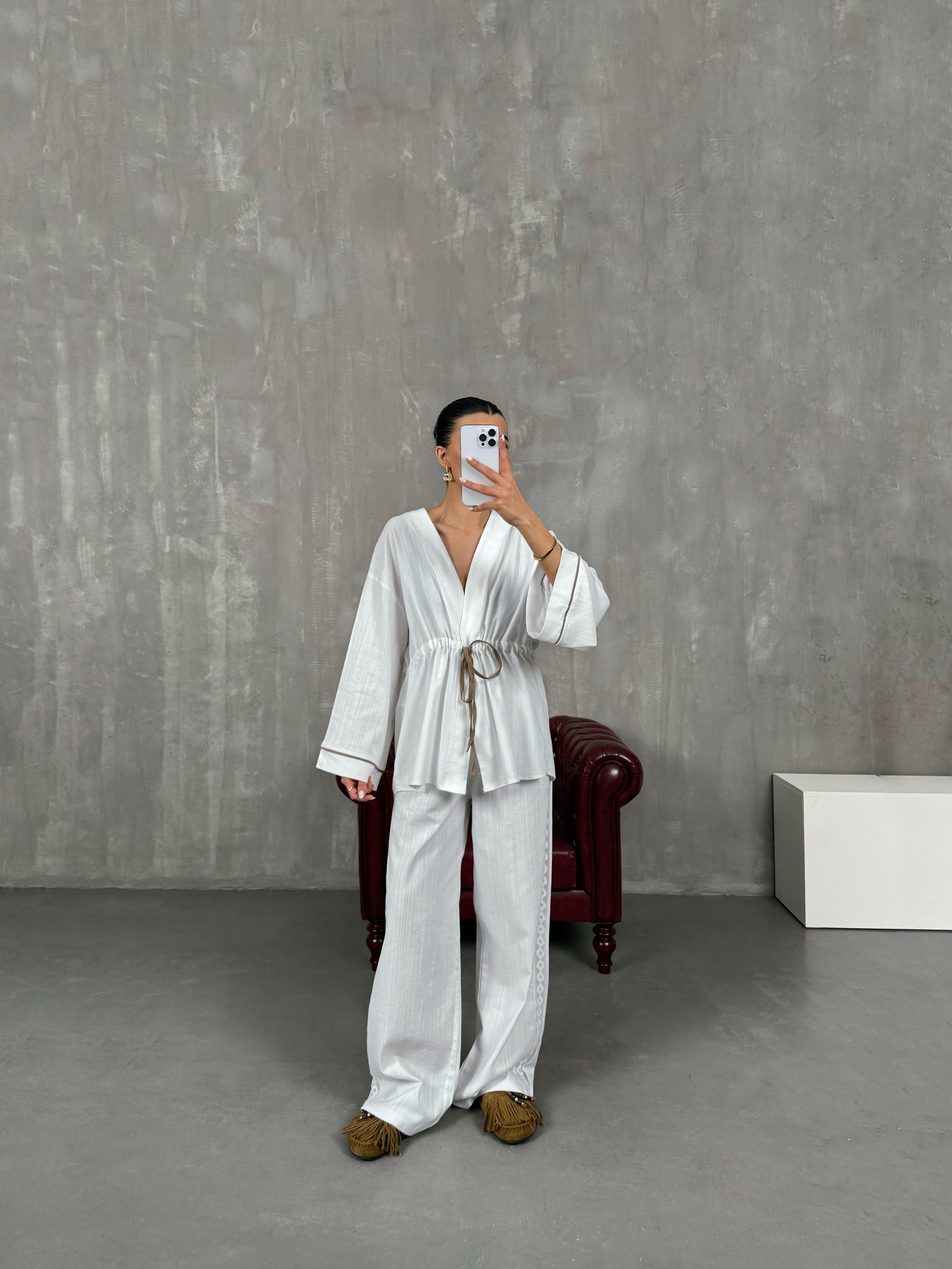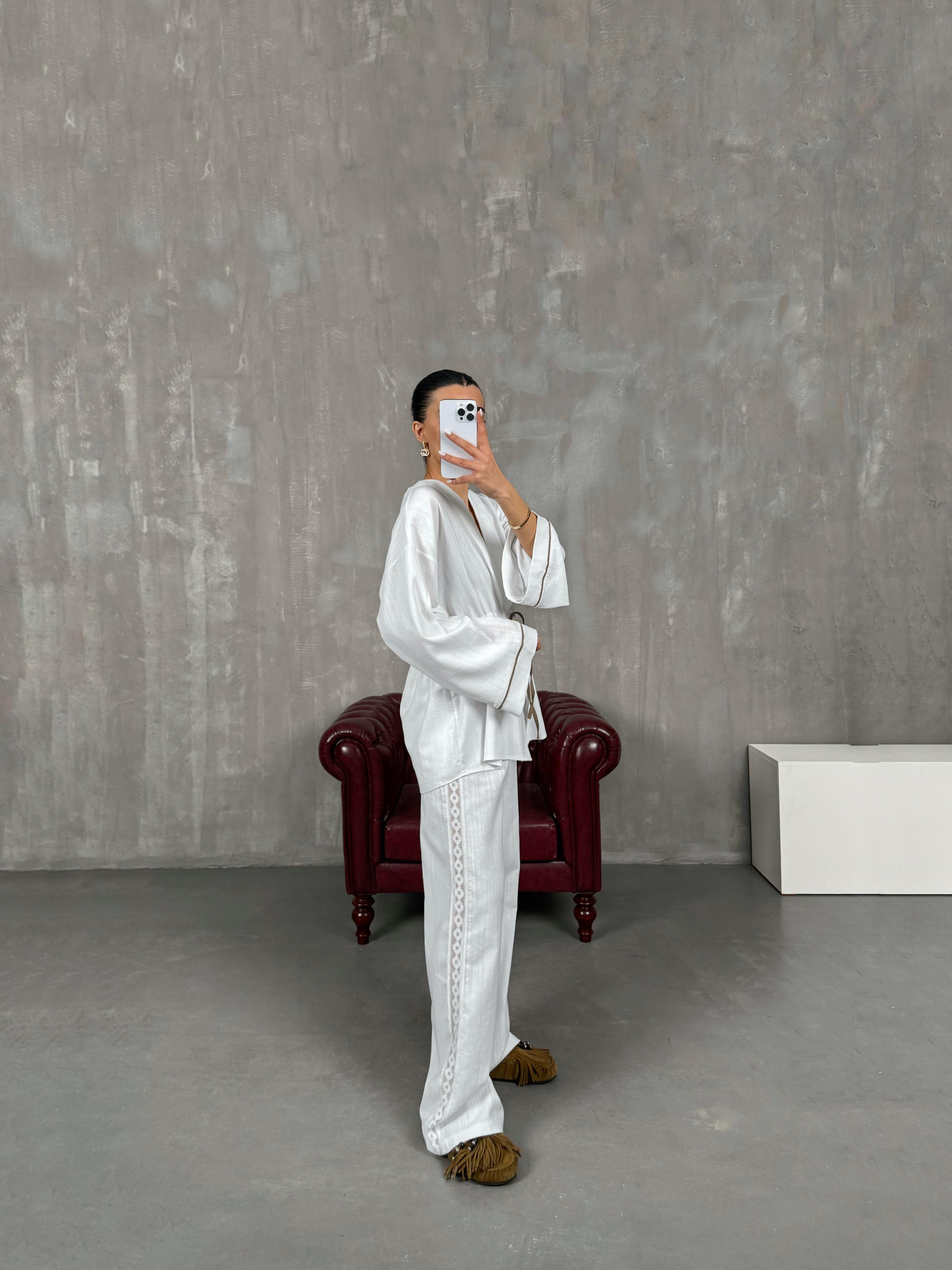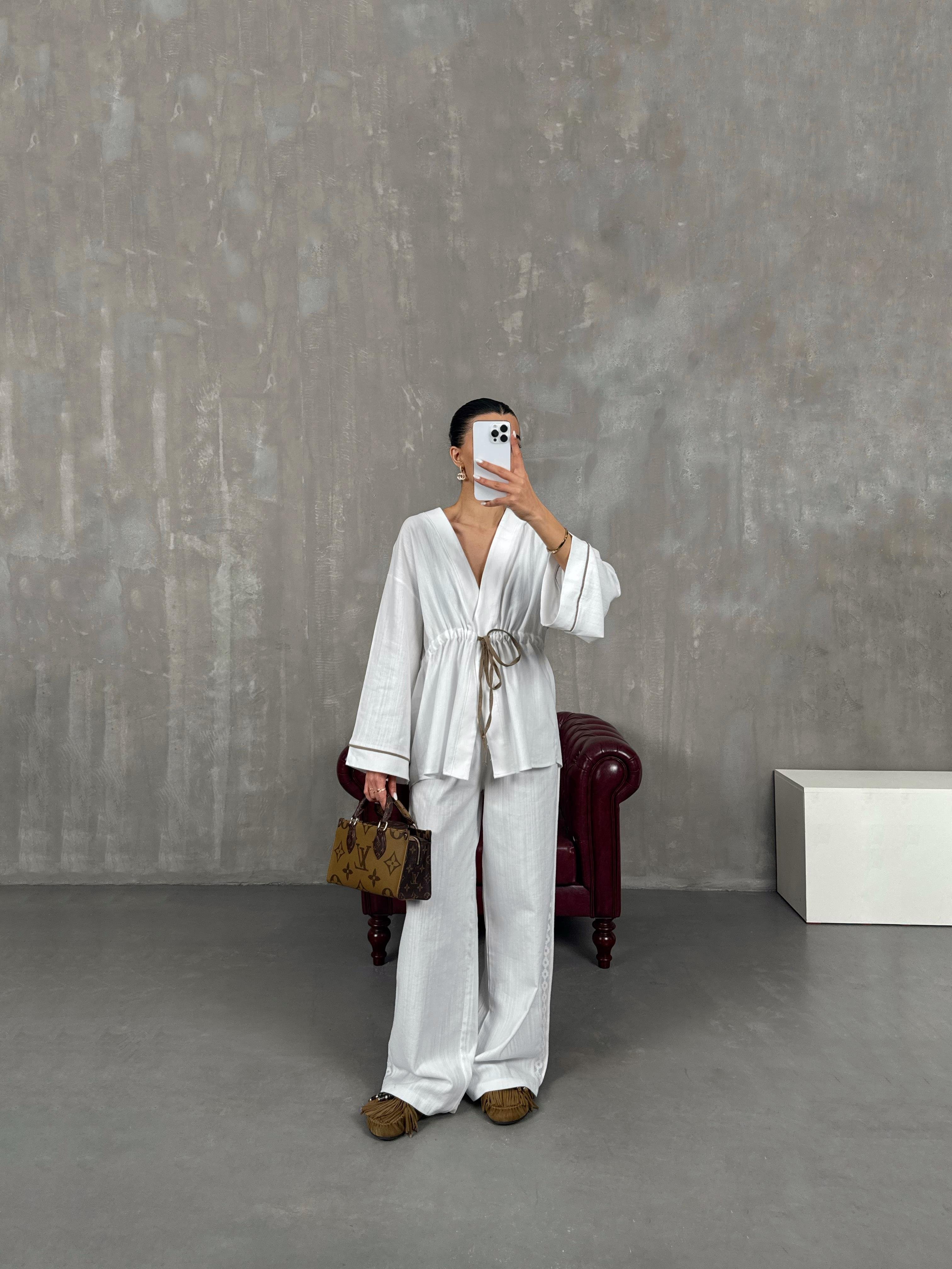 طقم كيمونو كتان أبيض بربّاط Gaus00034