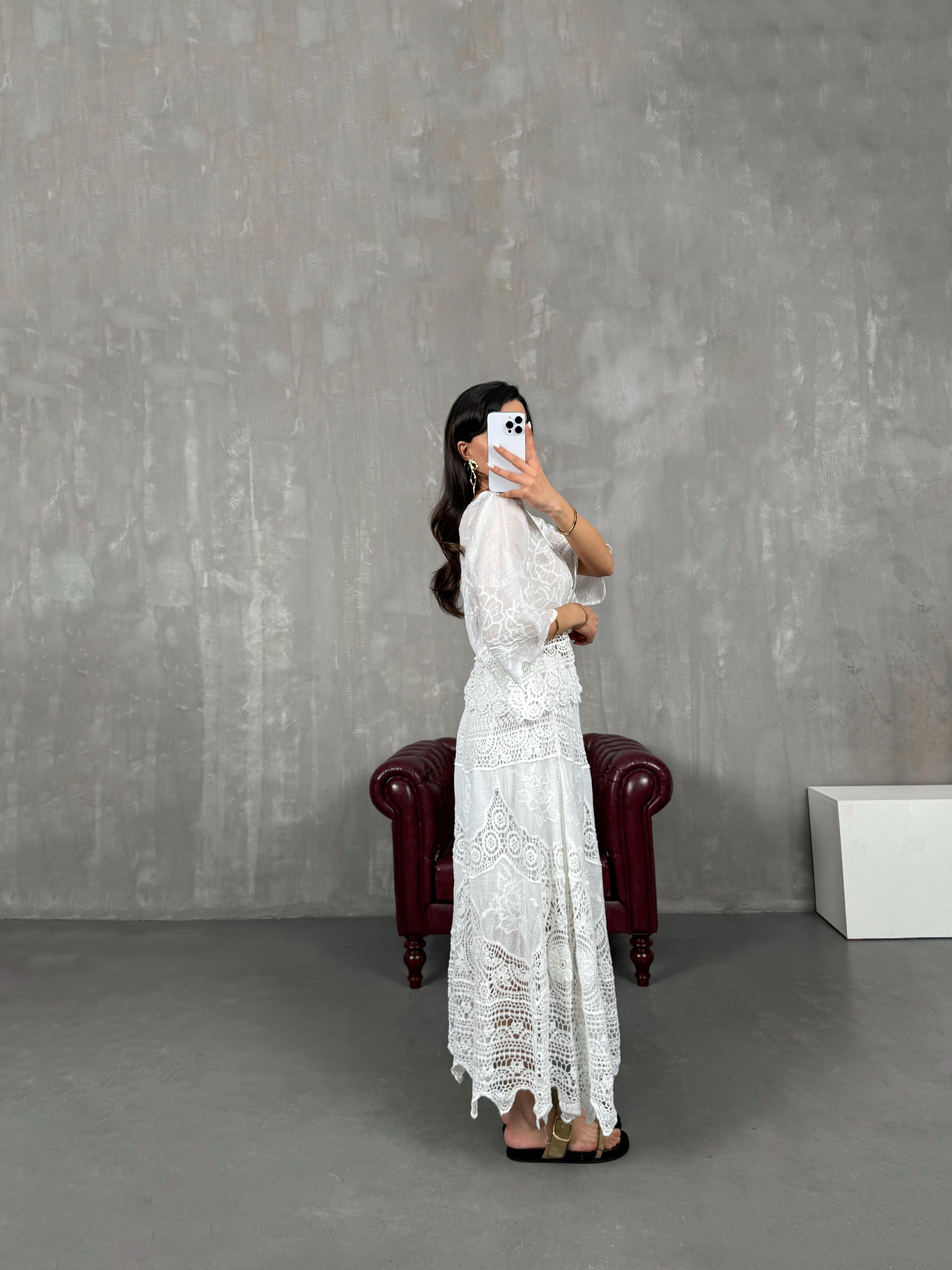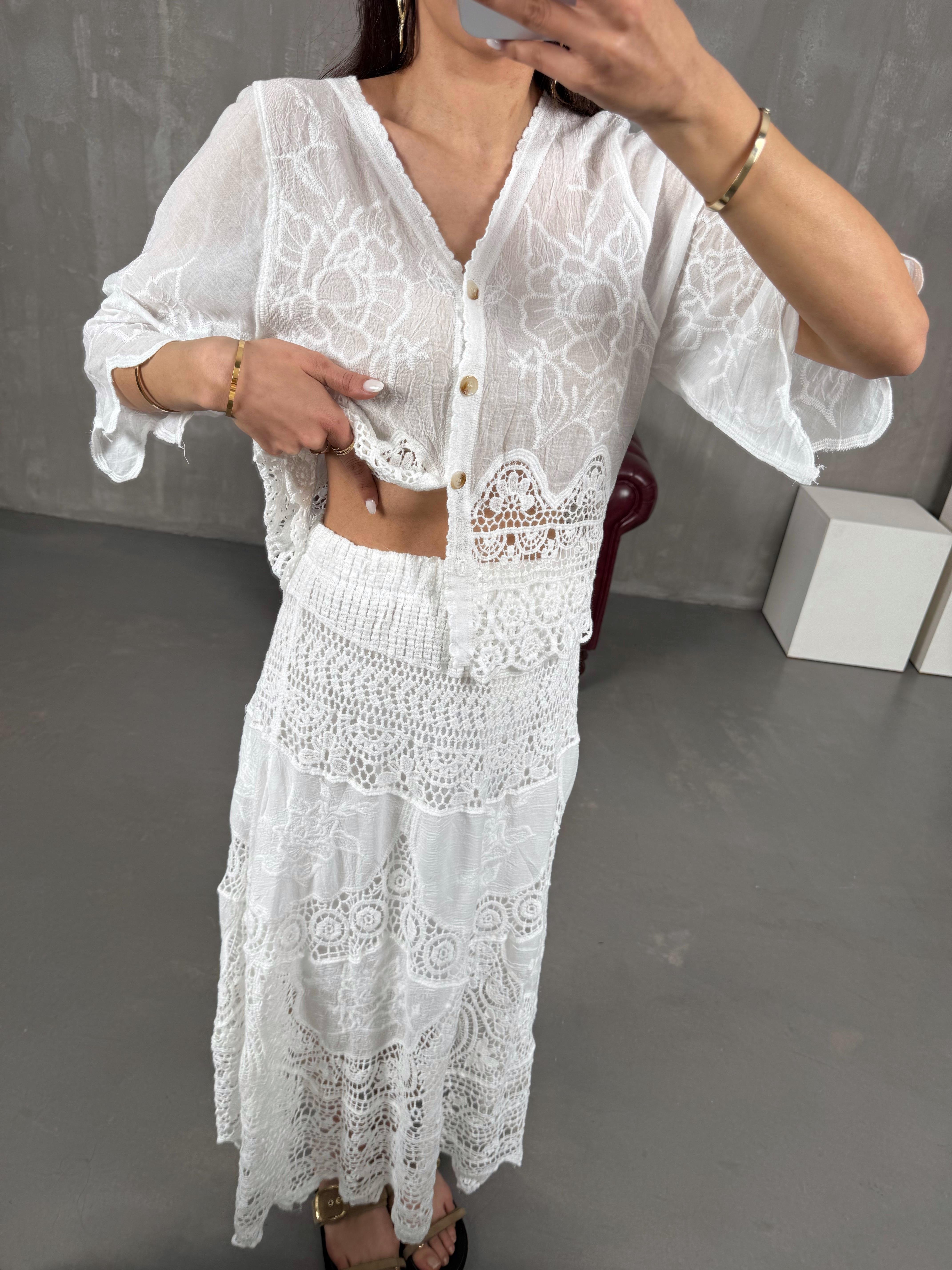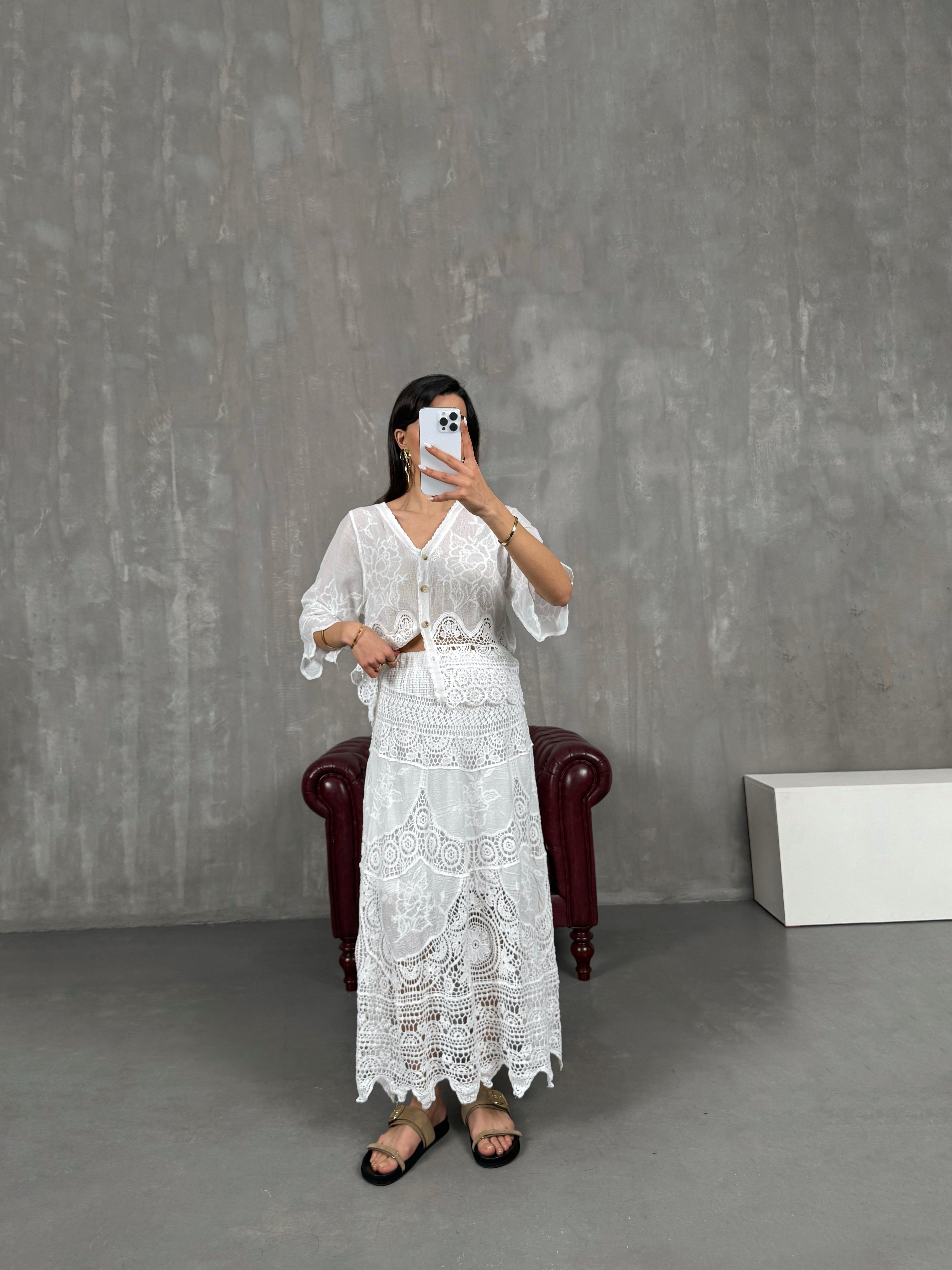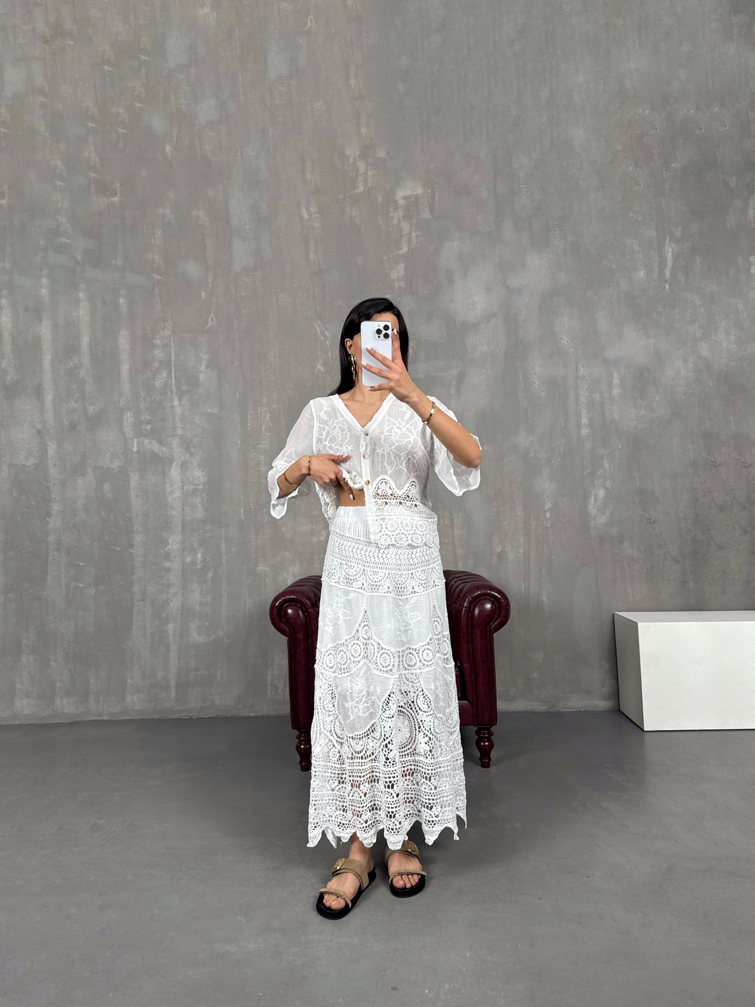 تنورة لون أبيض مبطّنة مزينة بتطريز فيستو ومزخرفة بالدانتيل Gaus00059