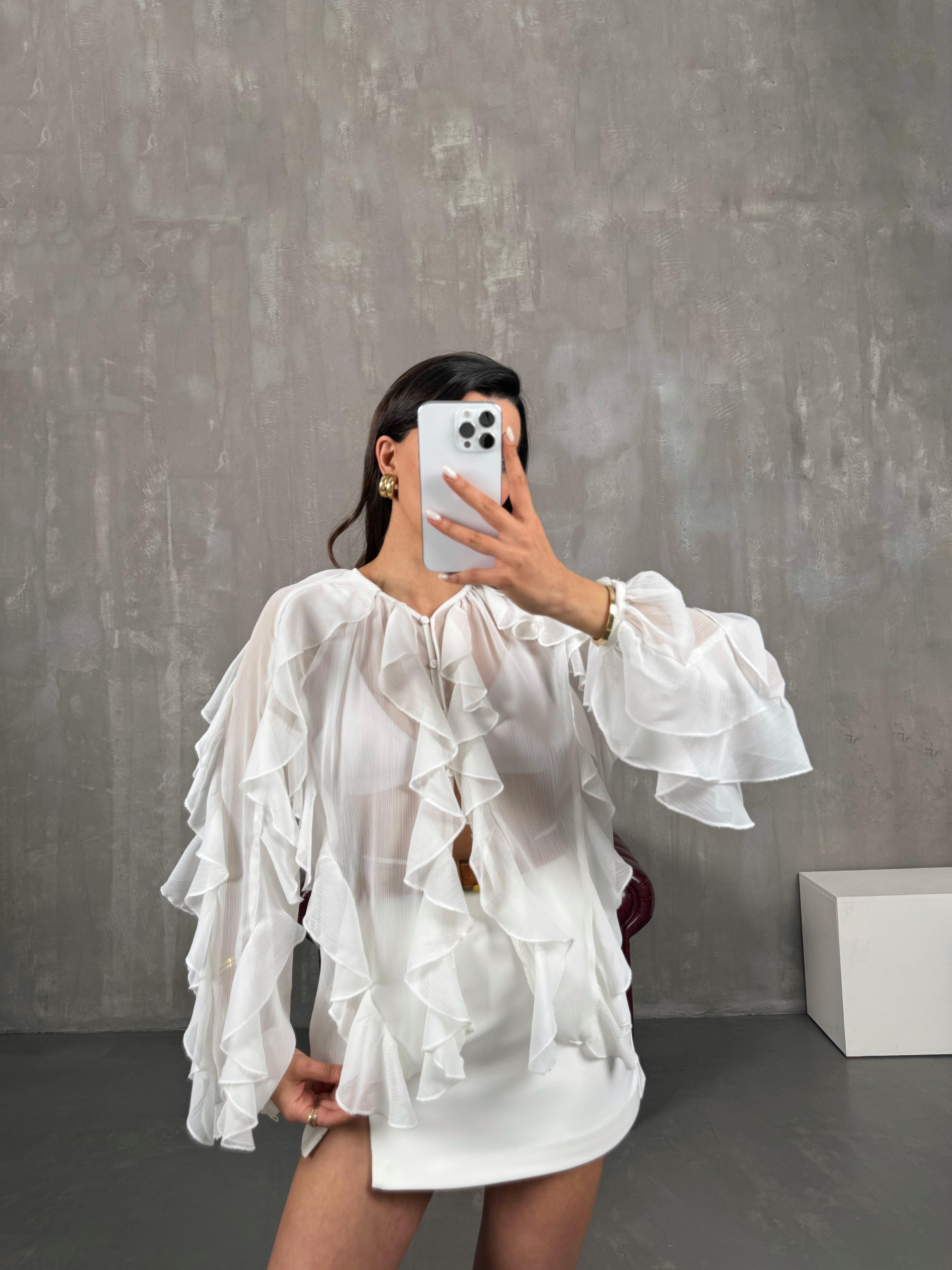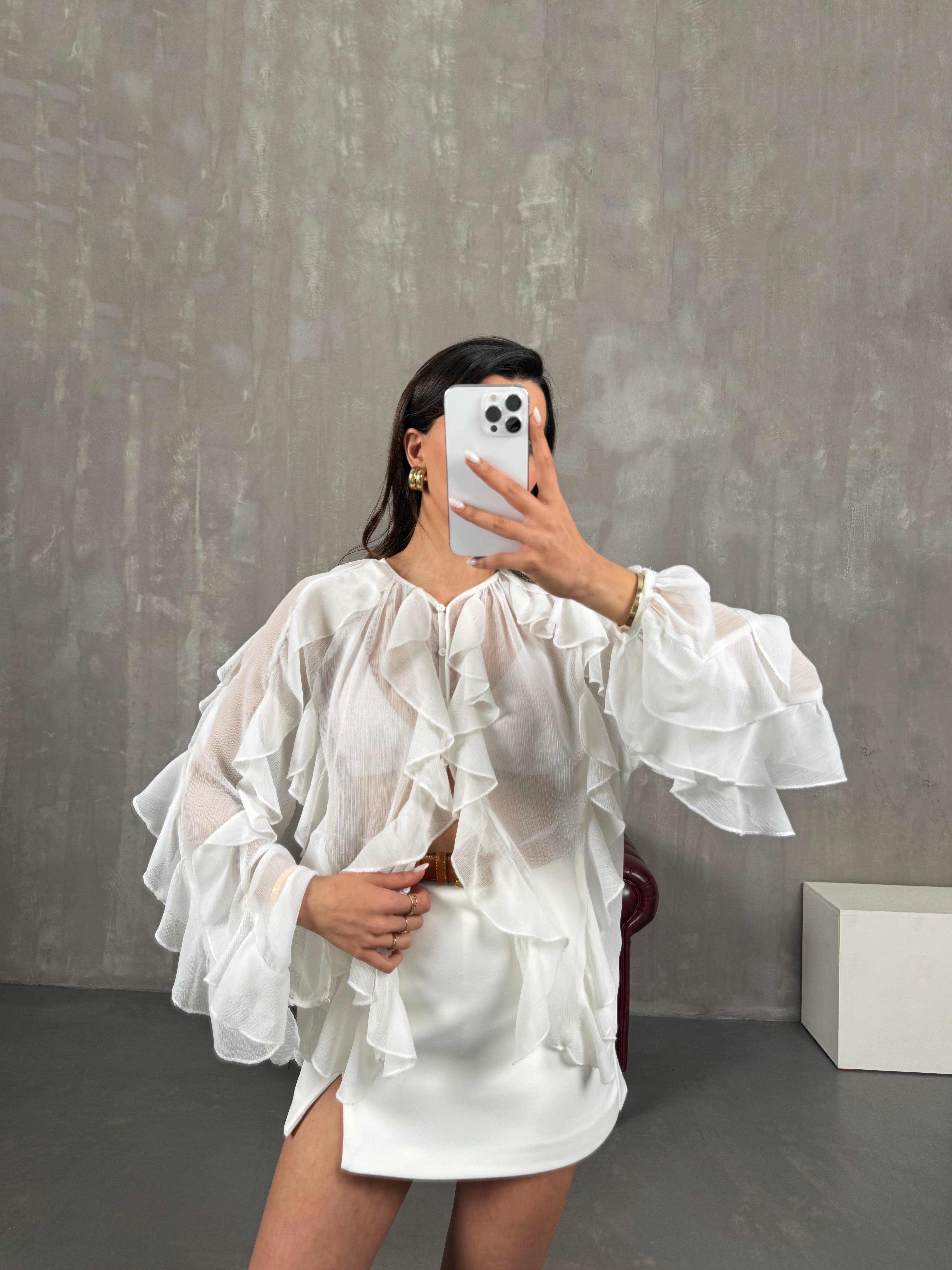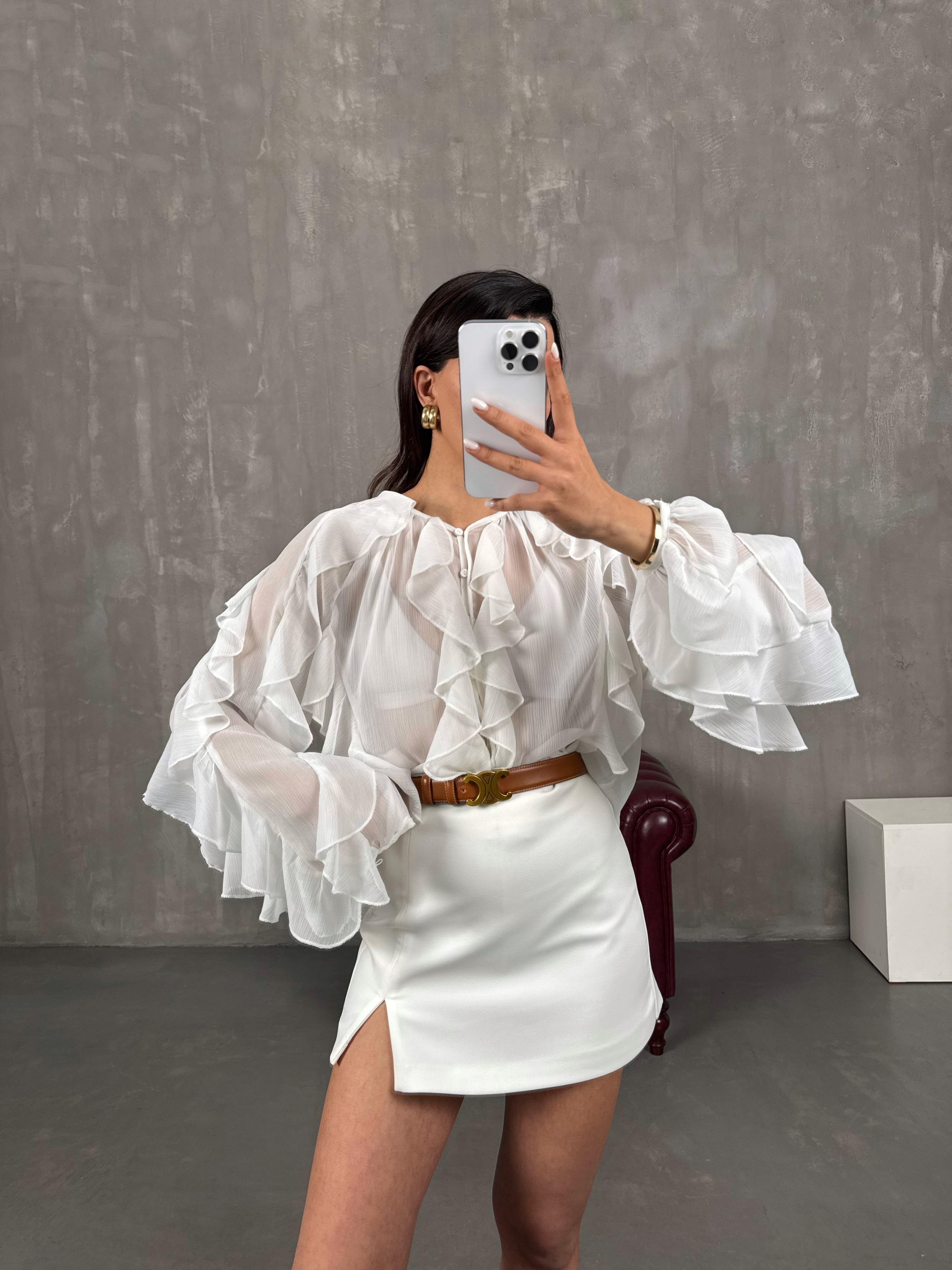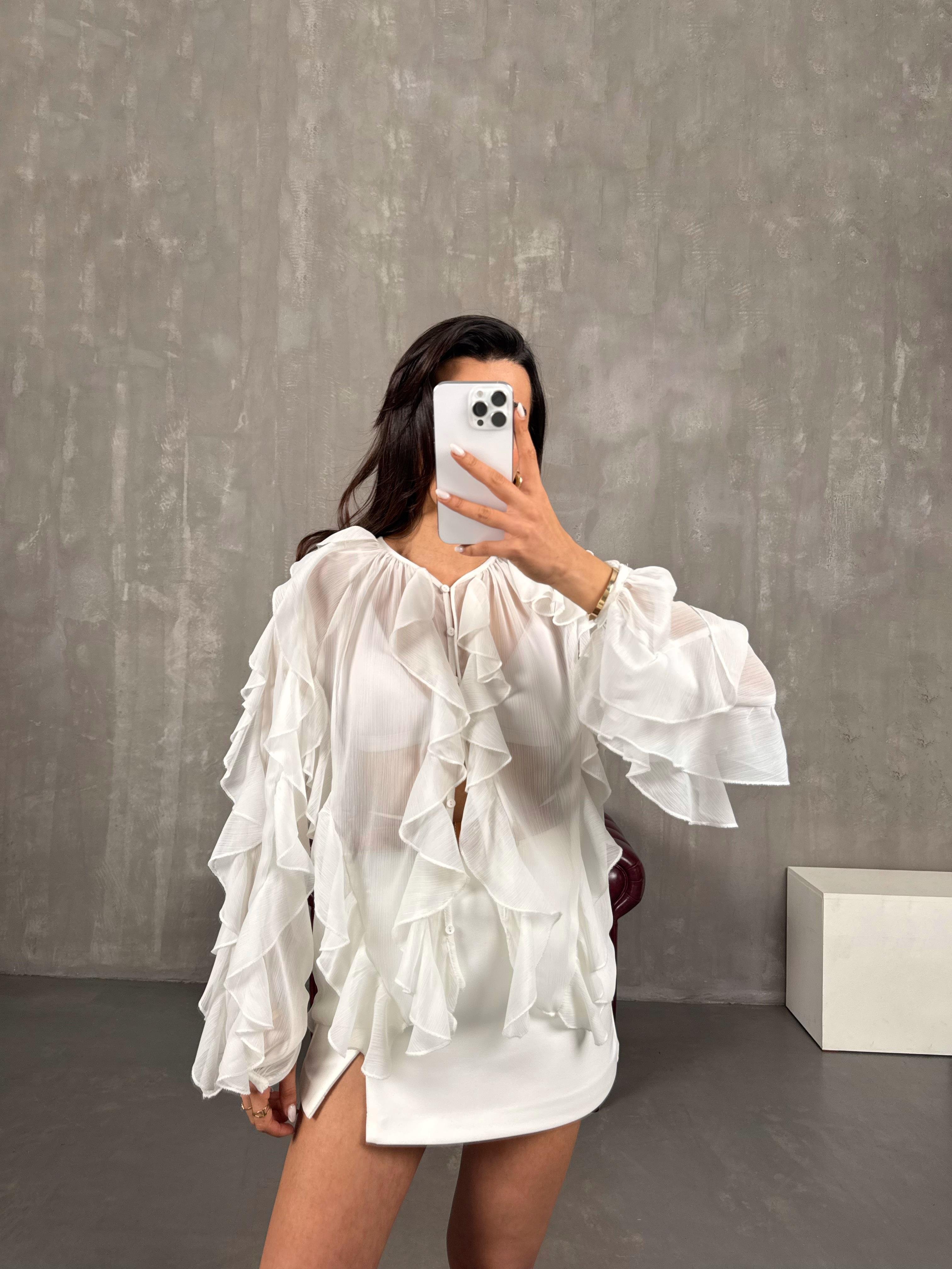 قميص أبيض قماش مزيج شيفون بأزرار كشكش Gaus00051