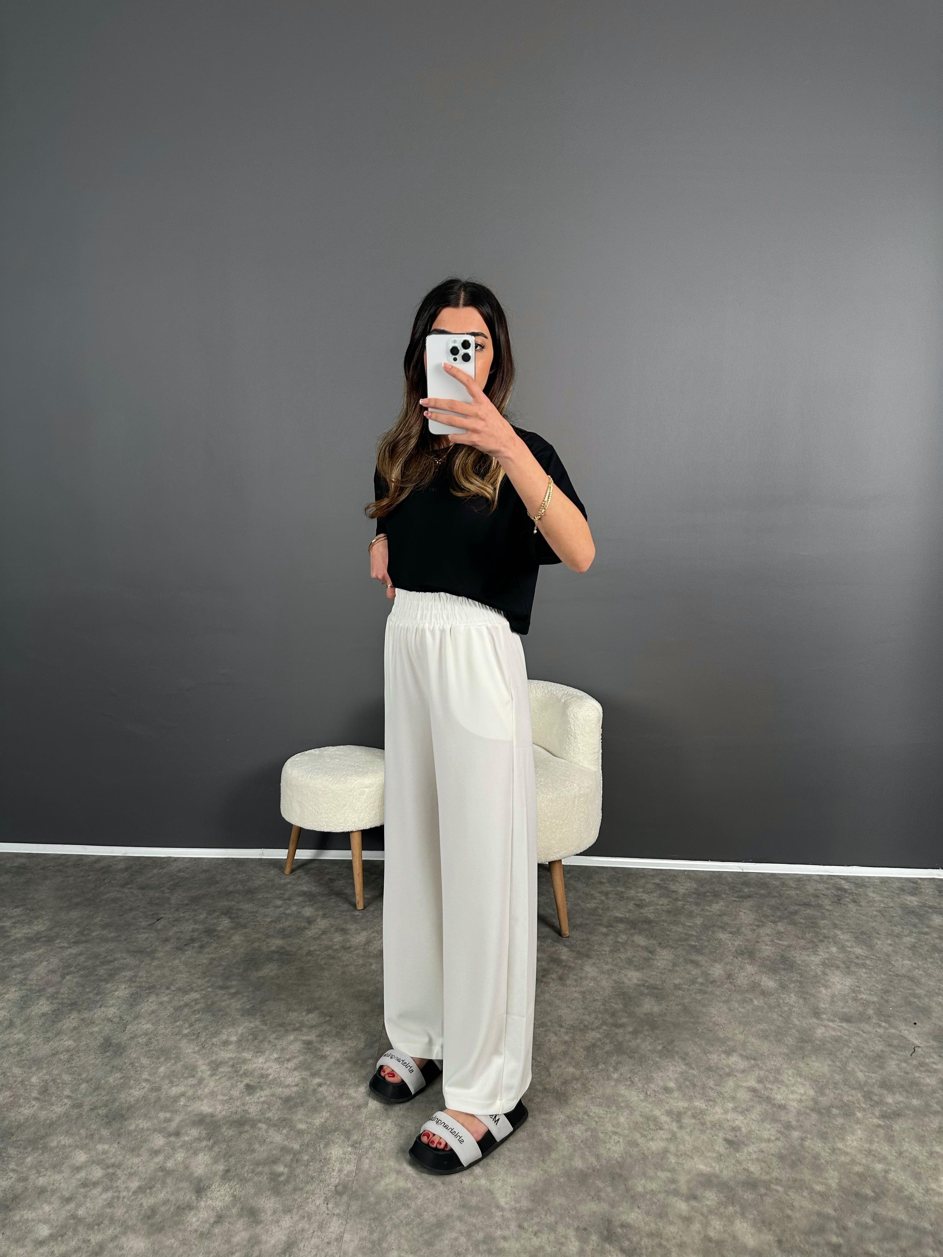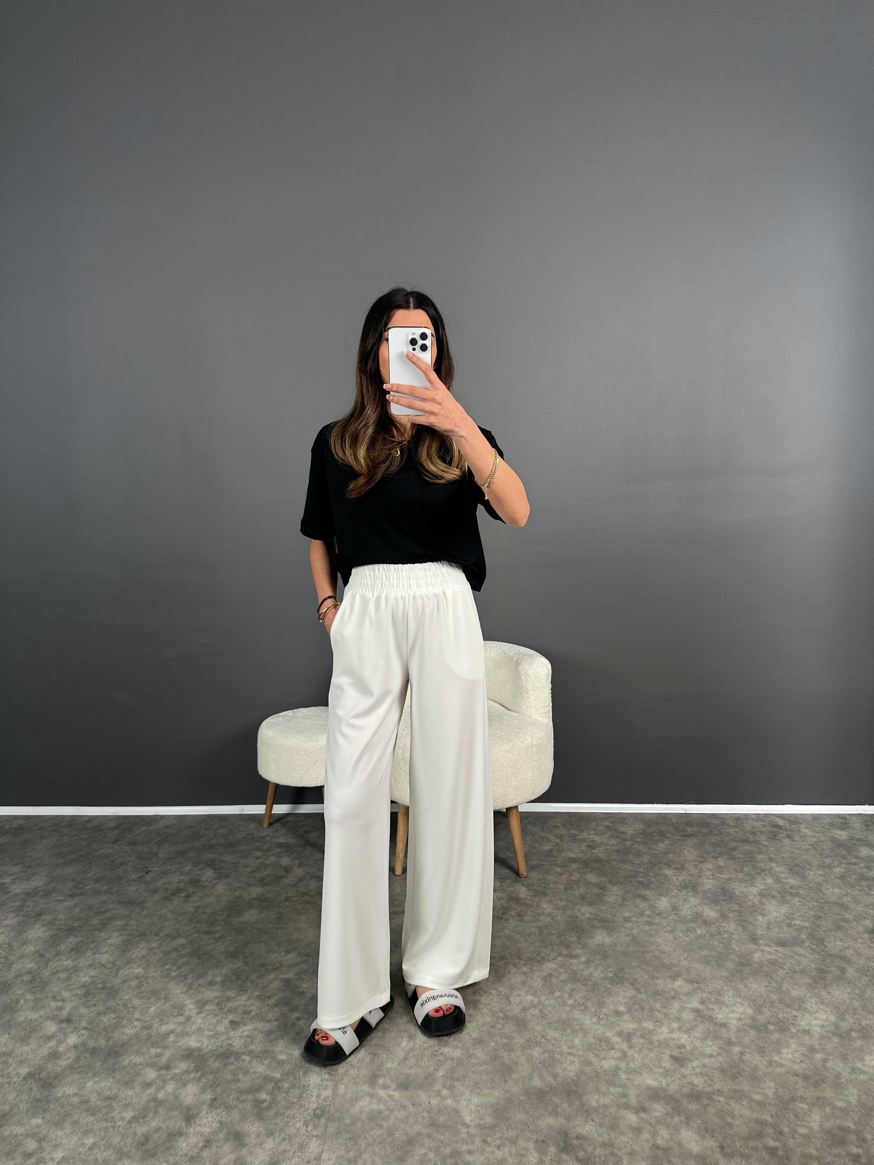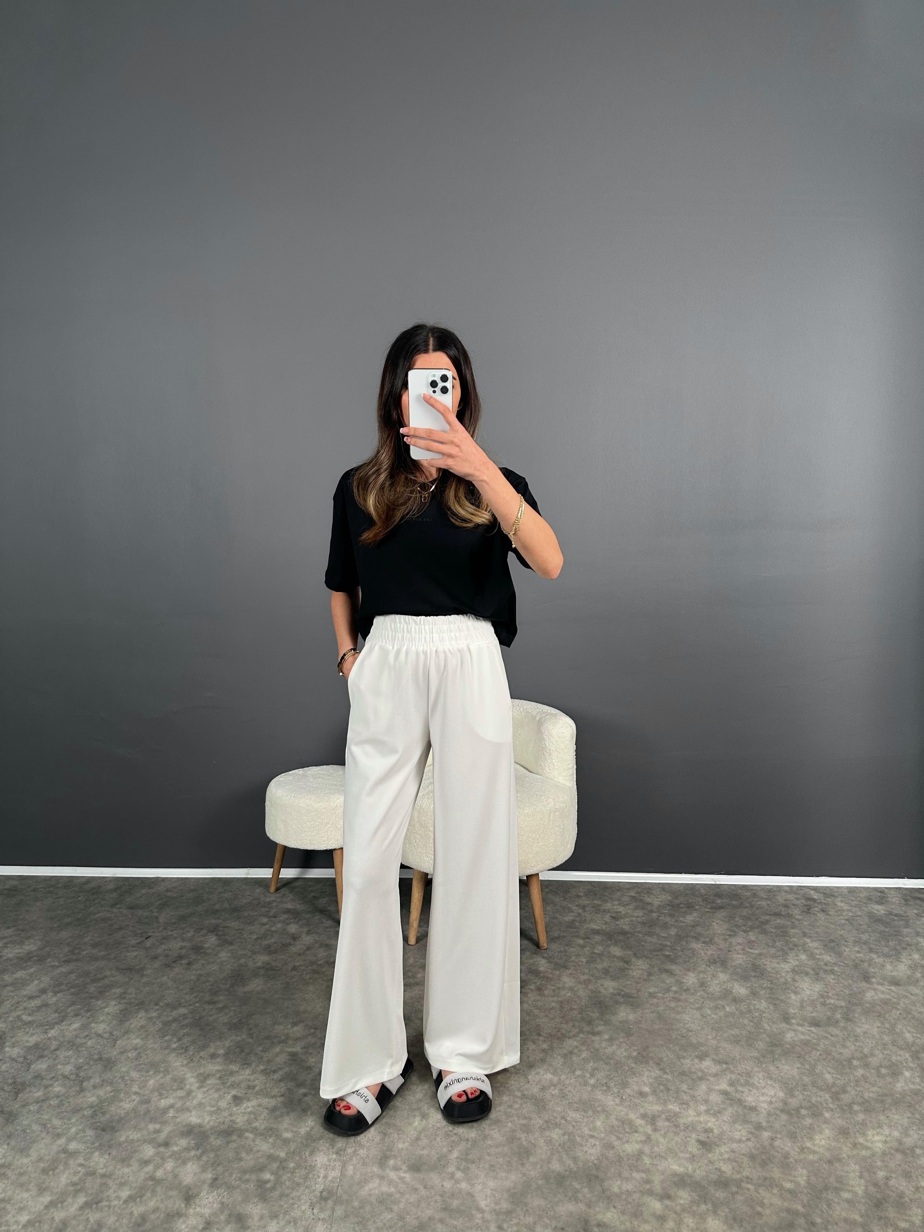 Beyaz Kalın Kemerli Beli Lastikli Pantolon