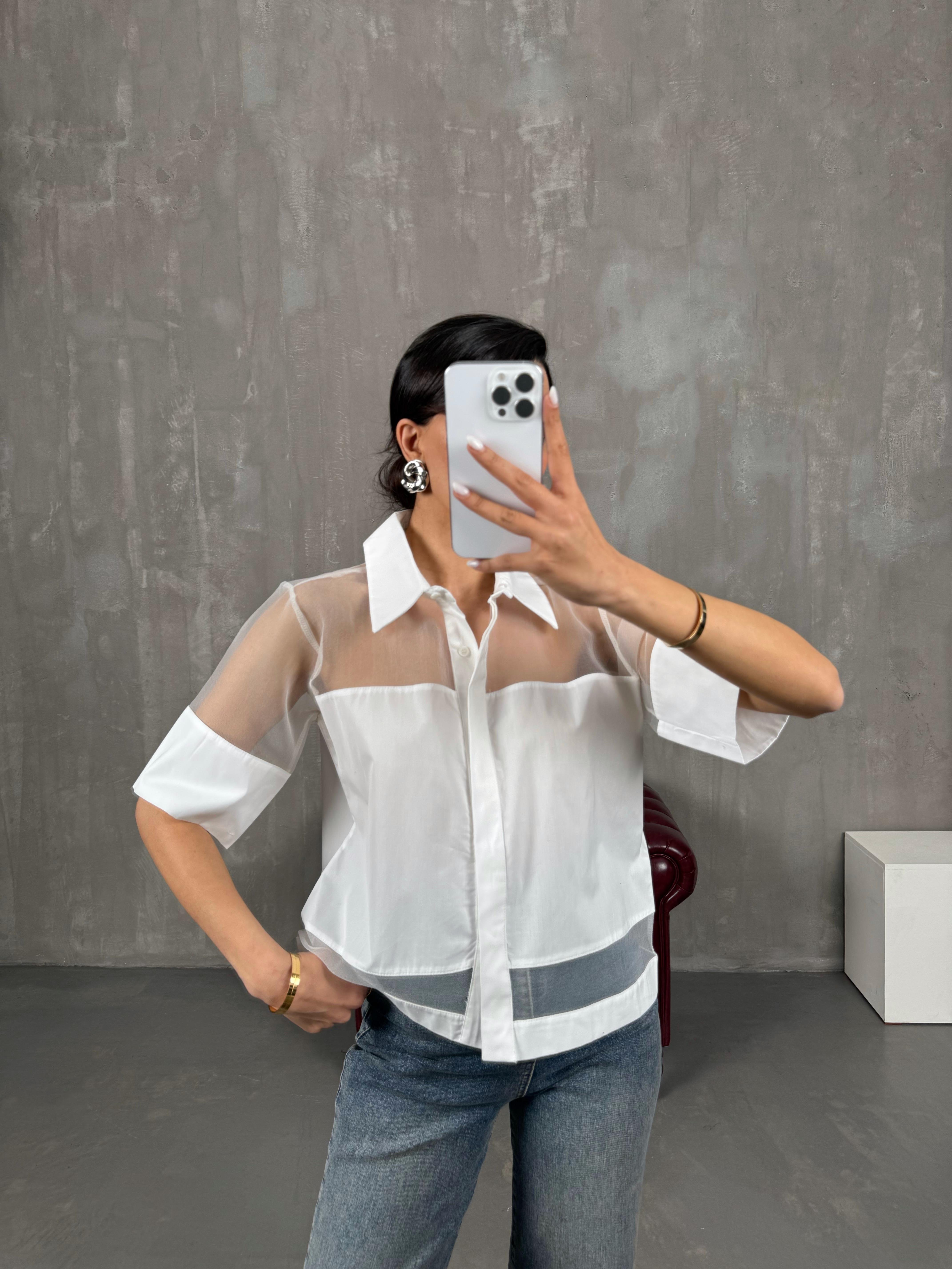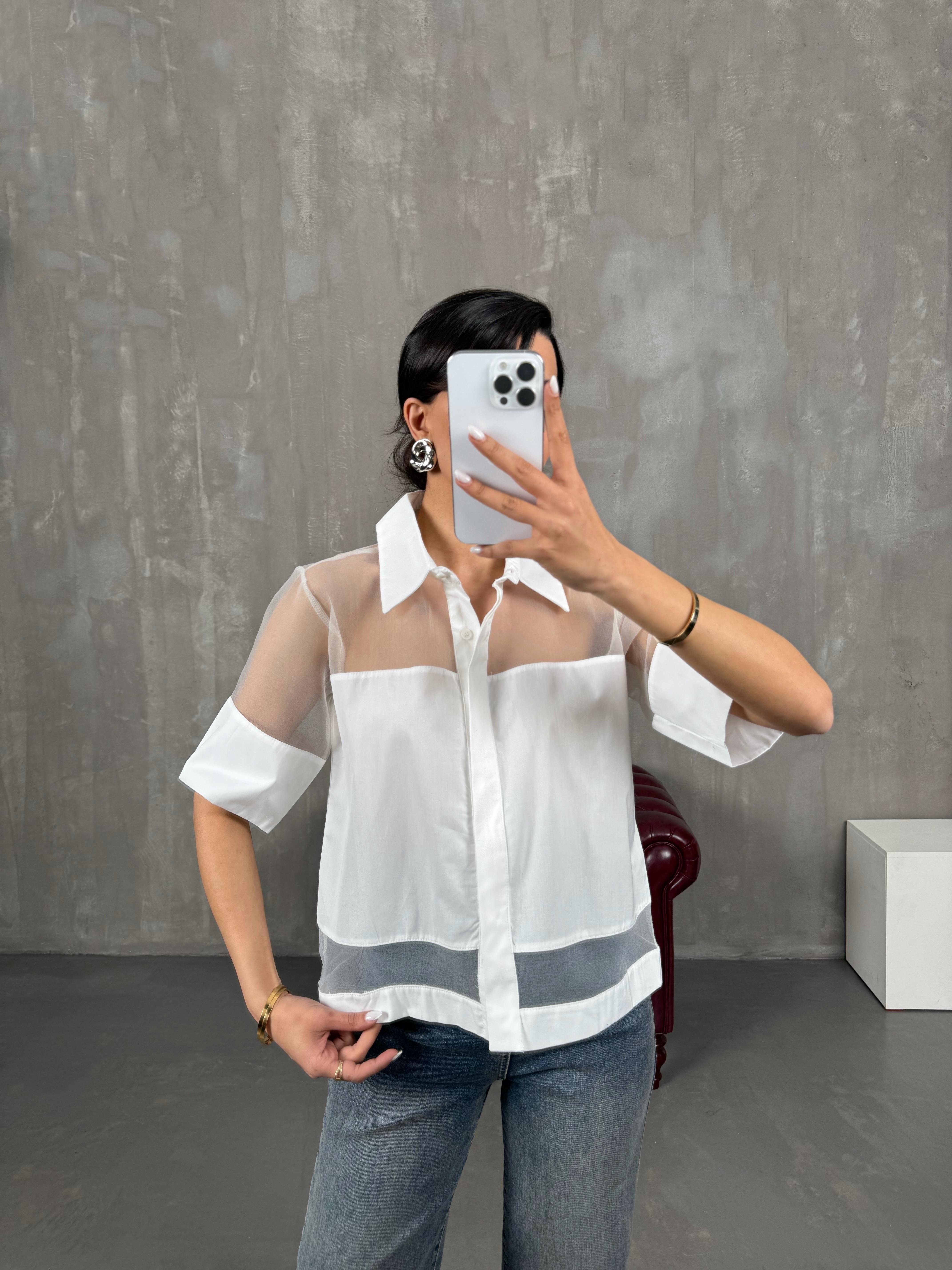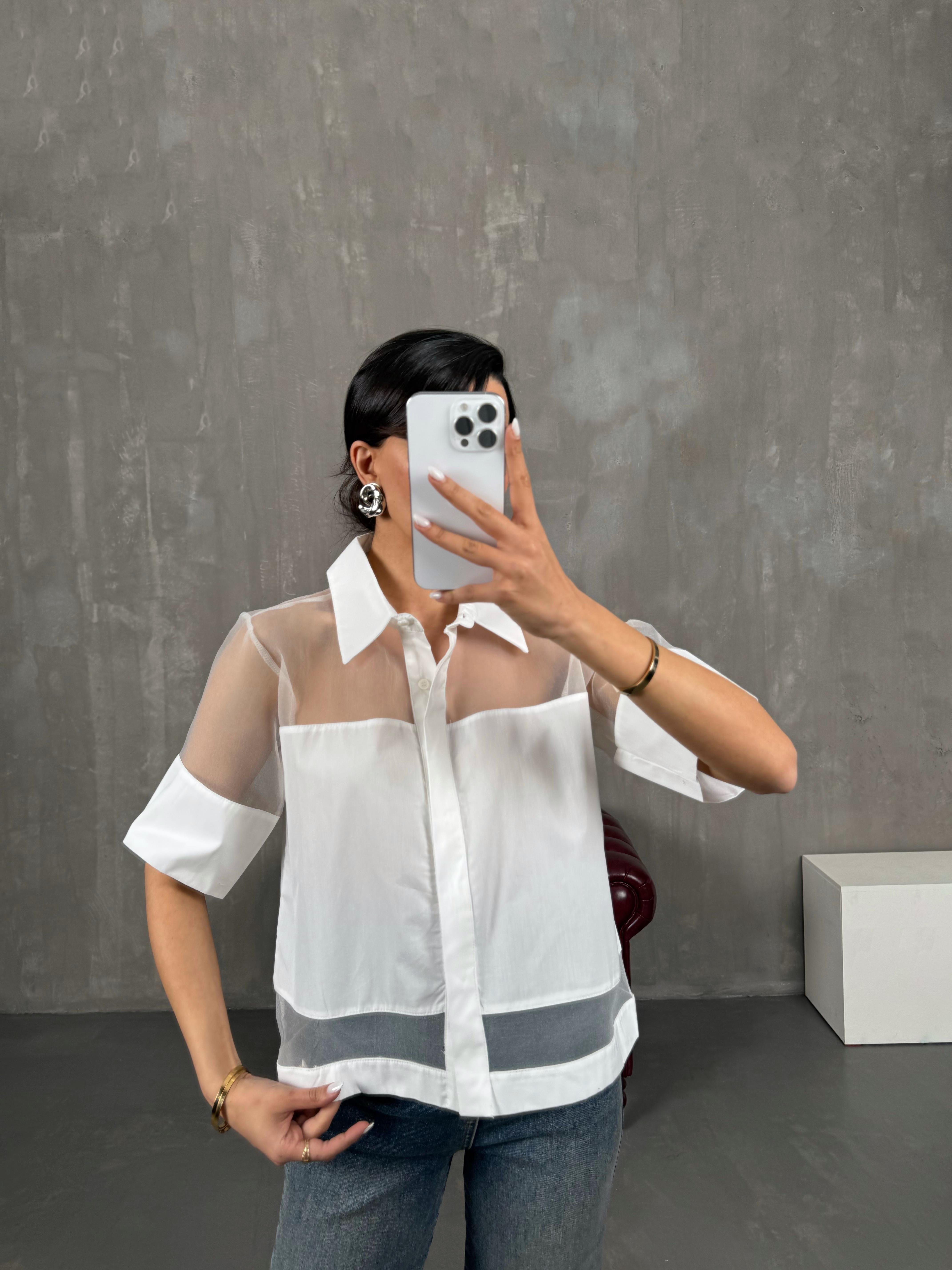 قميص أبيض بأكمام قصيرة وتفاصيل شفافة Gaus00040