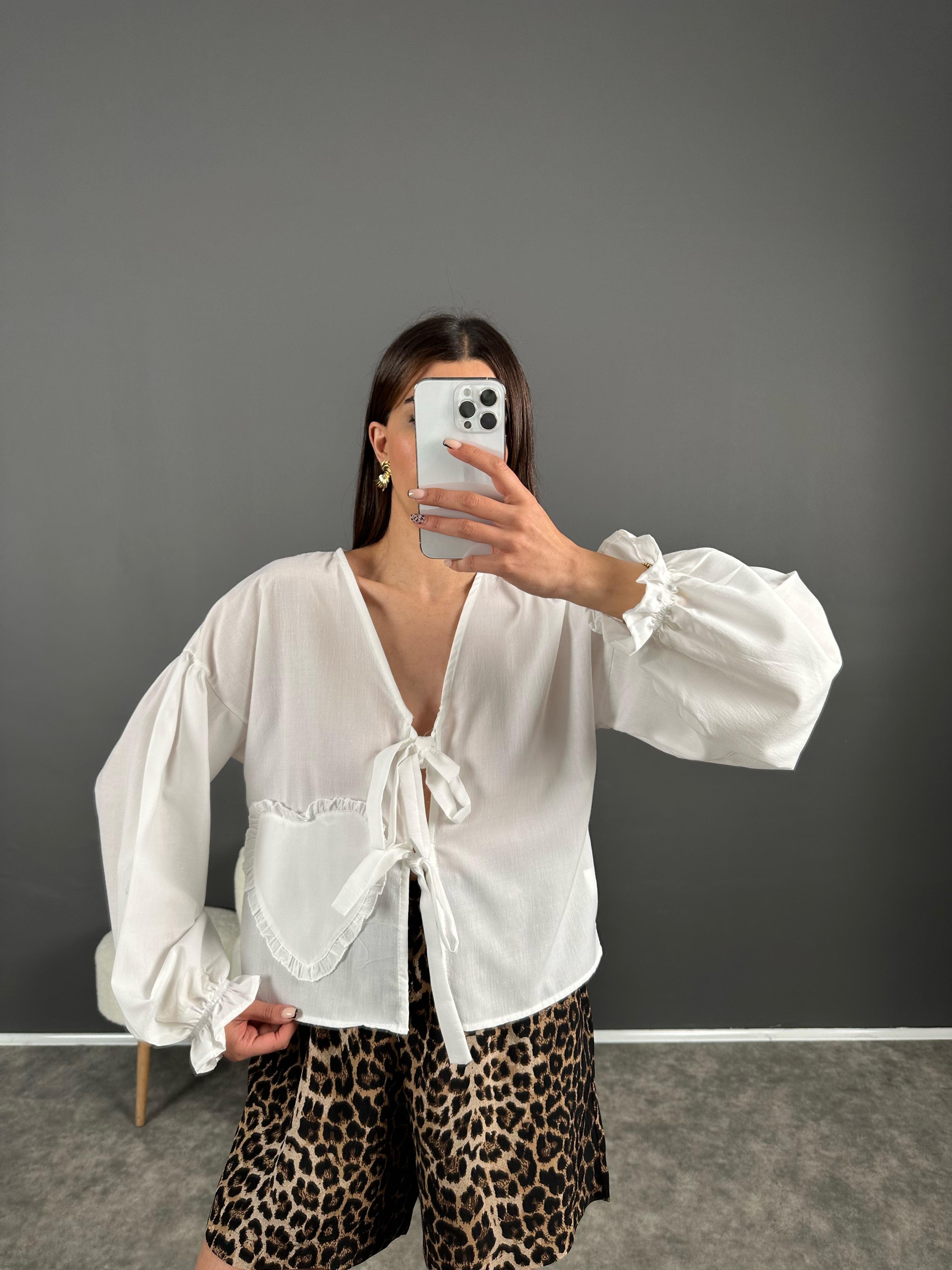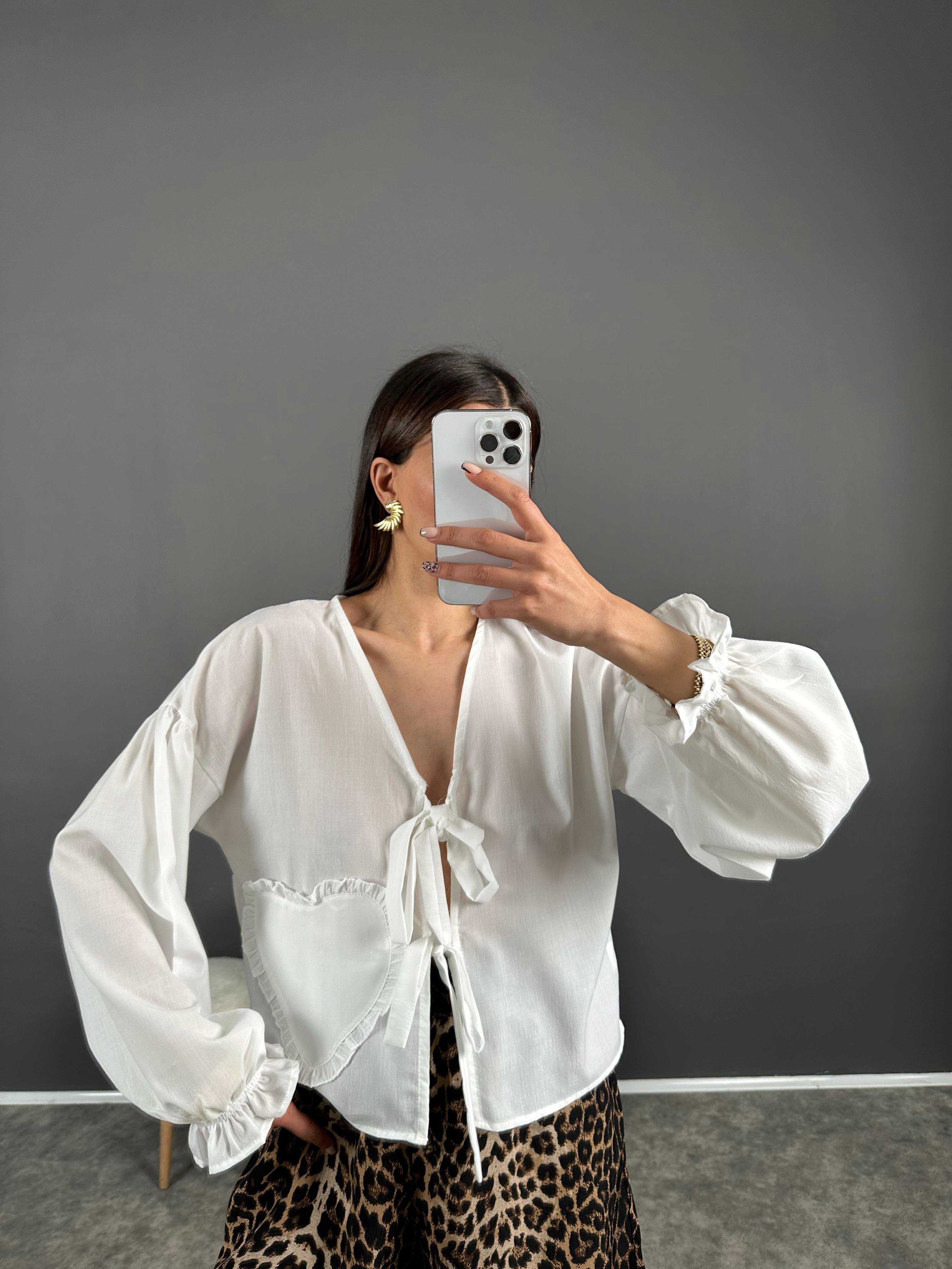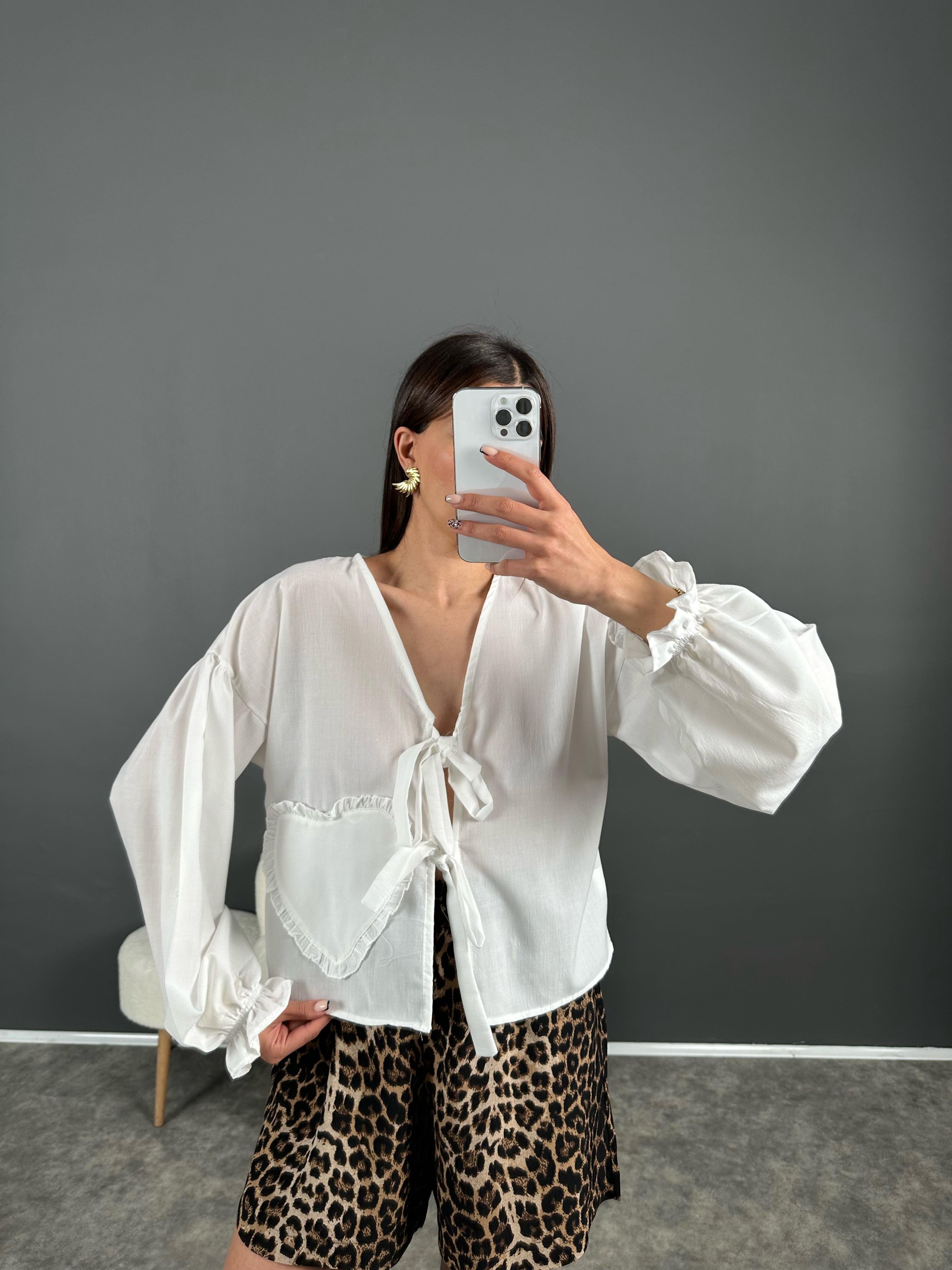 Beyaz Pinterest Kalp Detaylı Bağlamalı Gömlek