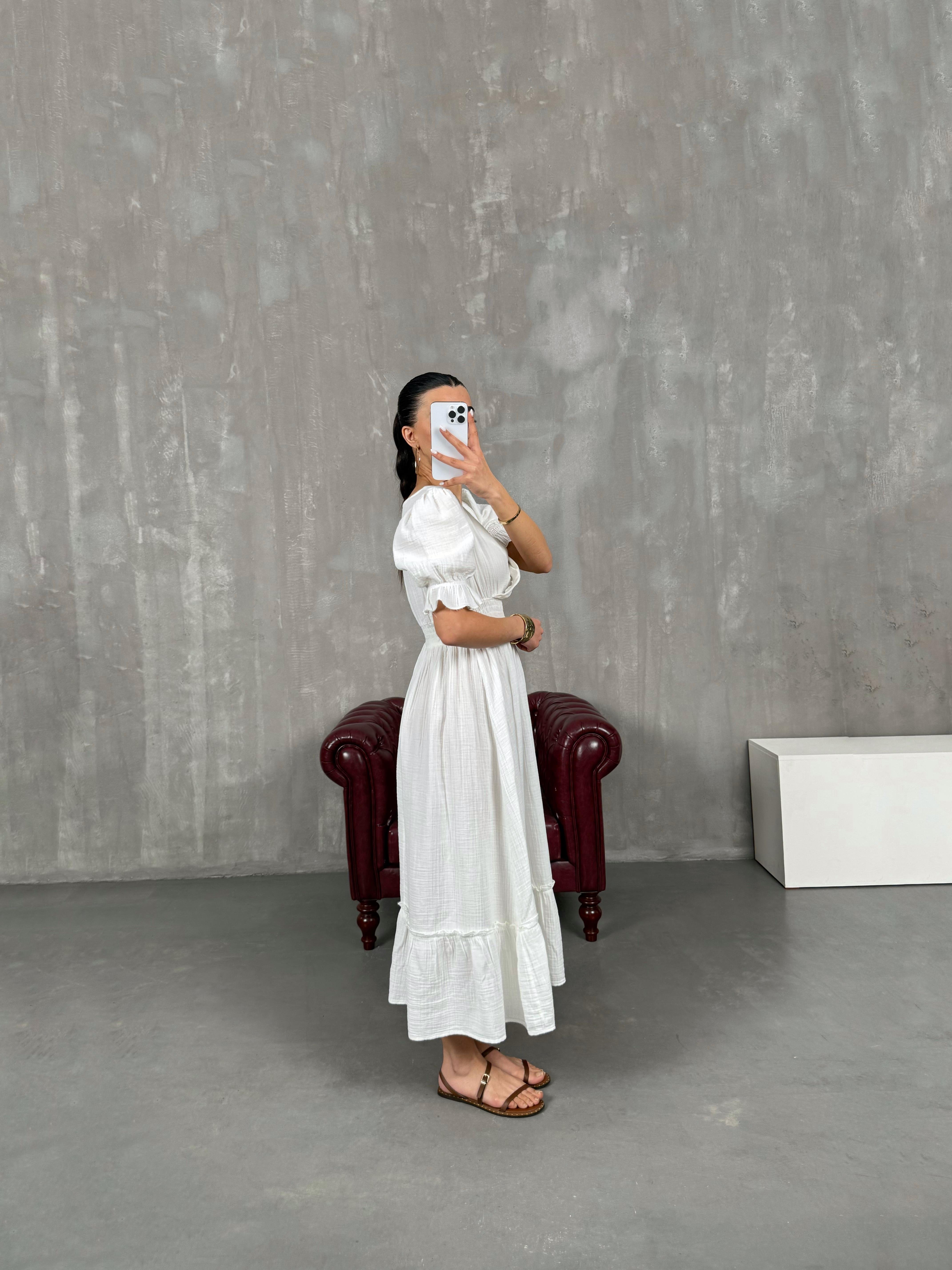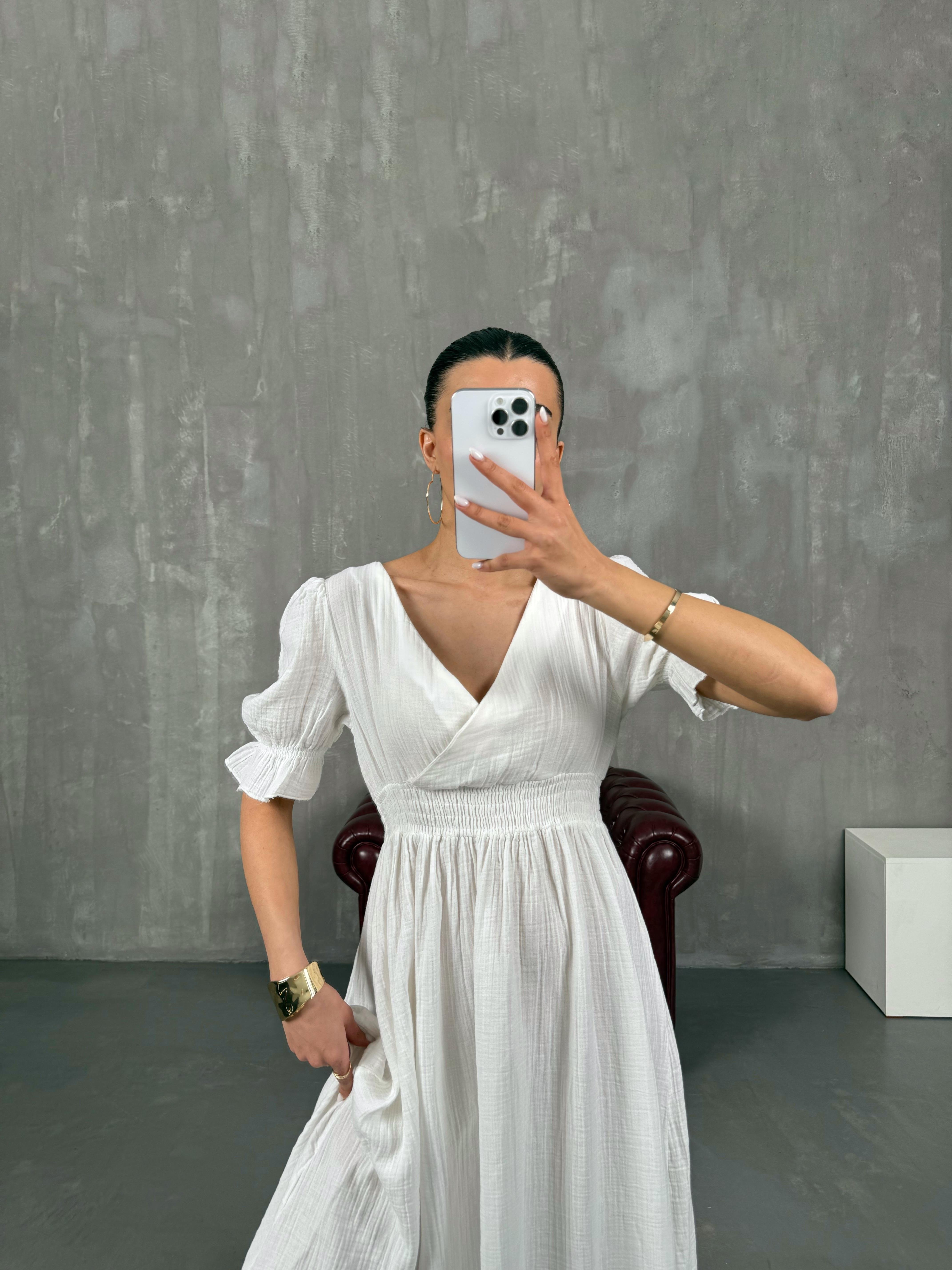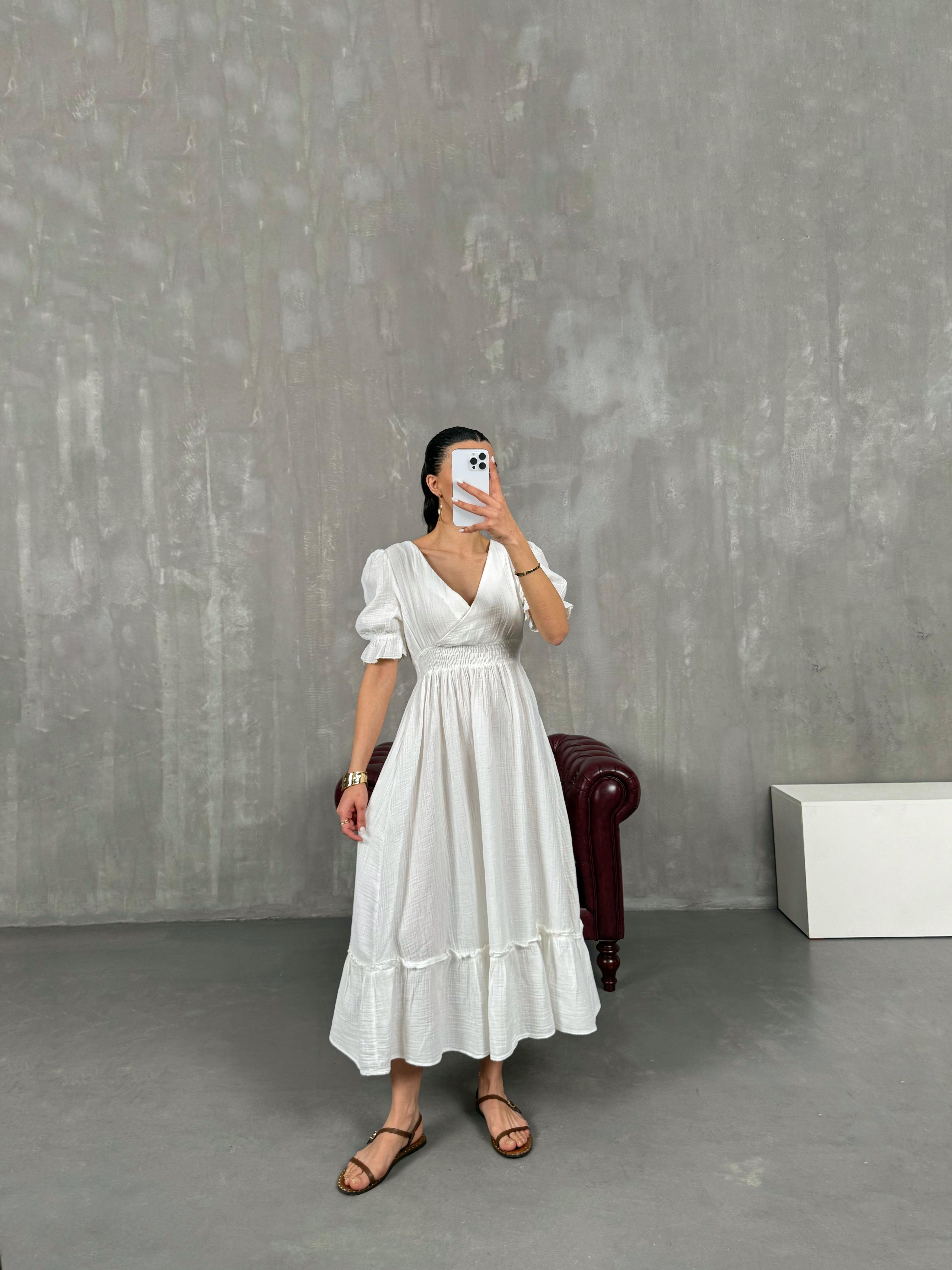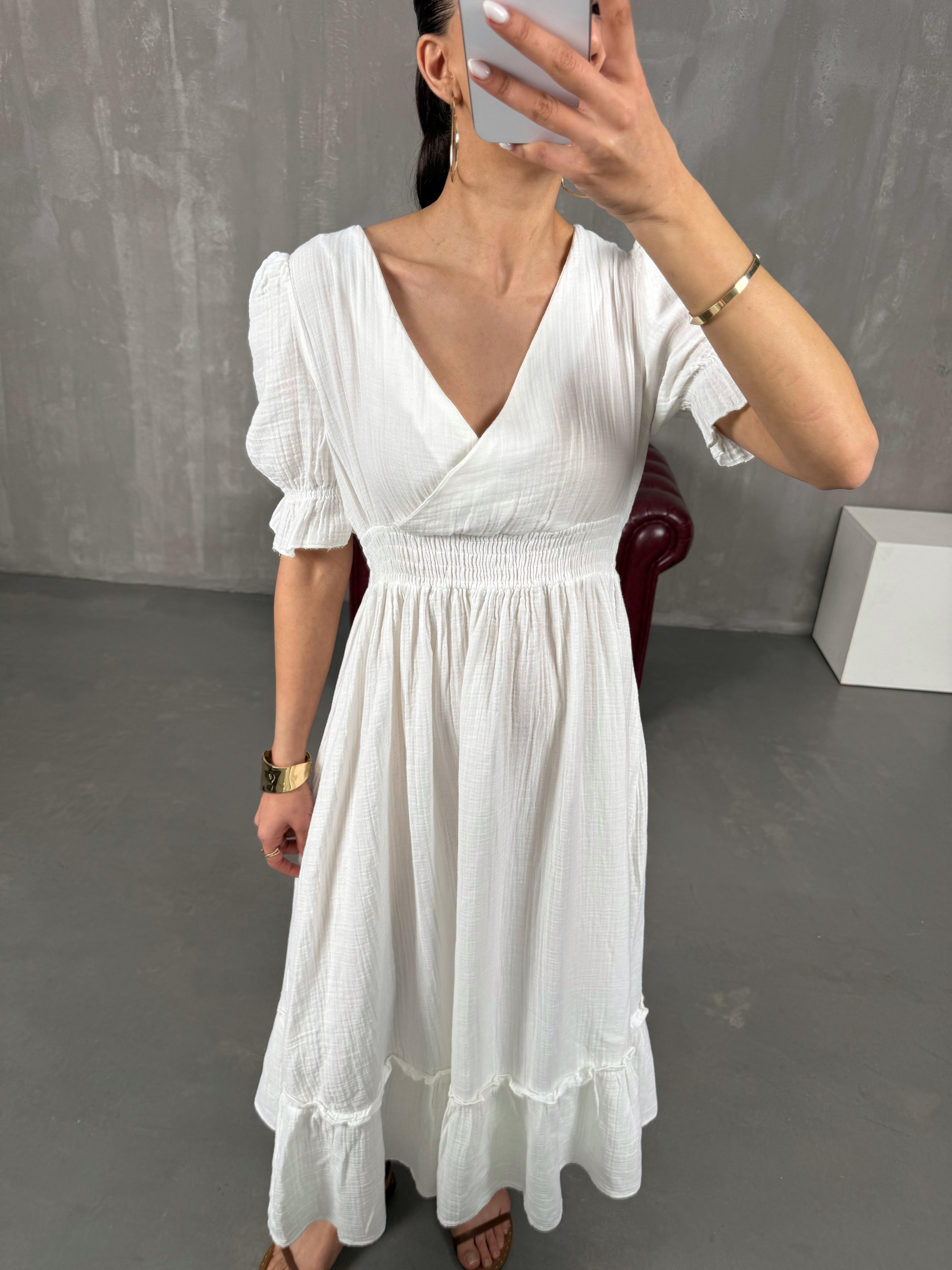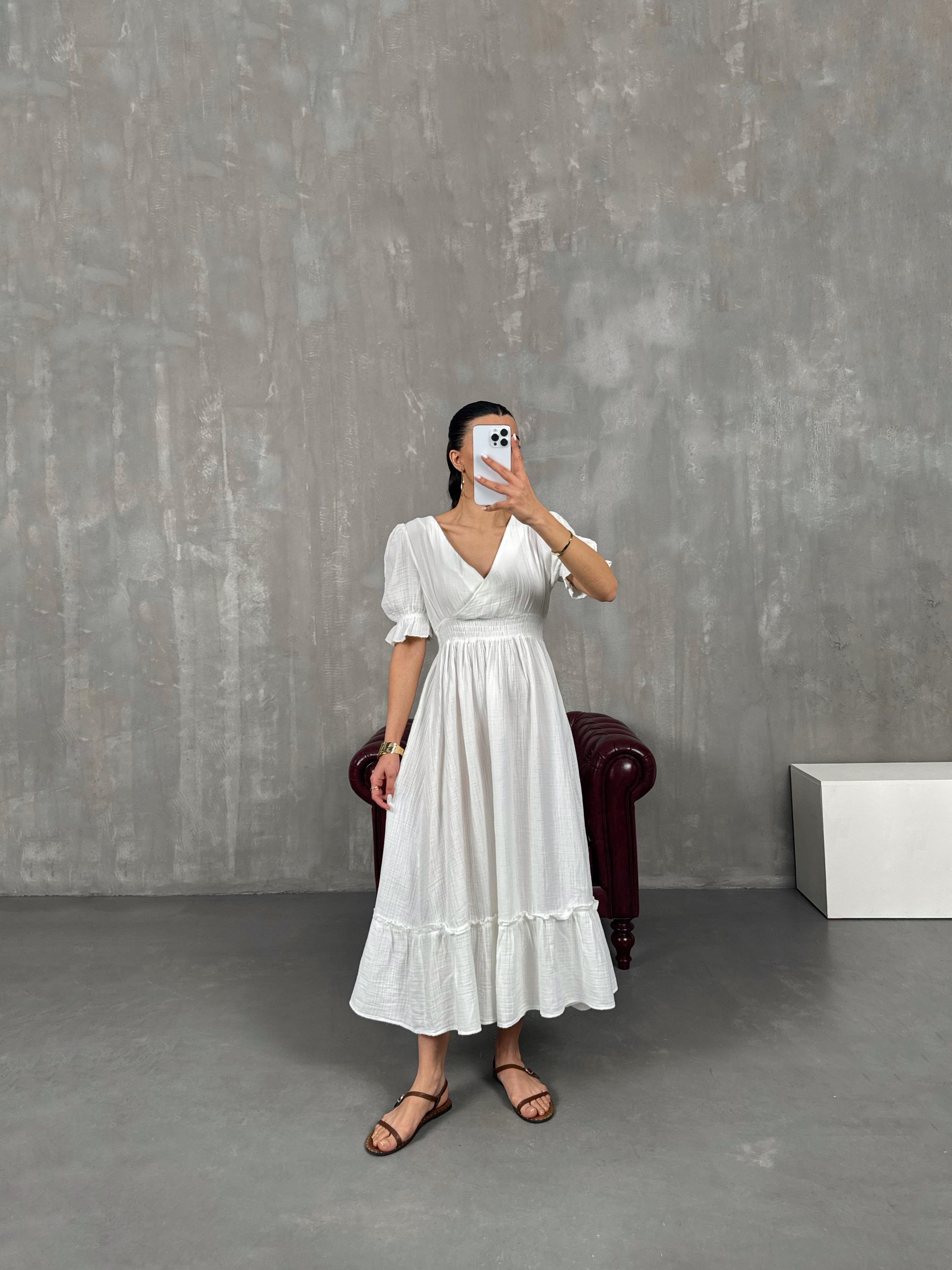 فستان بينتيريست أبيض قماش موسلين بثنيات مع خصر مطاطي وياقة شكل V Gaus00022