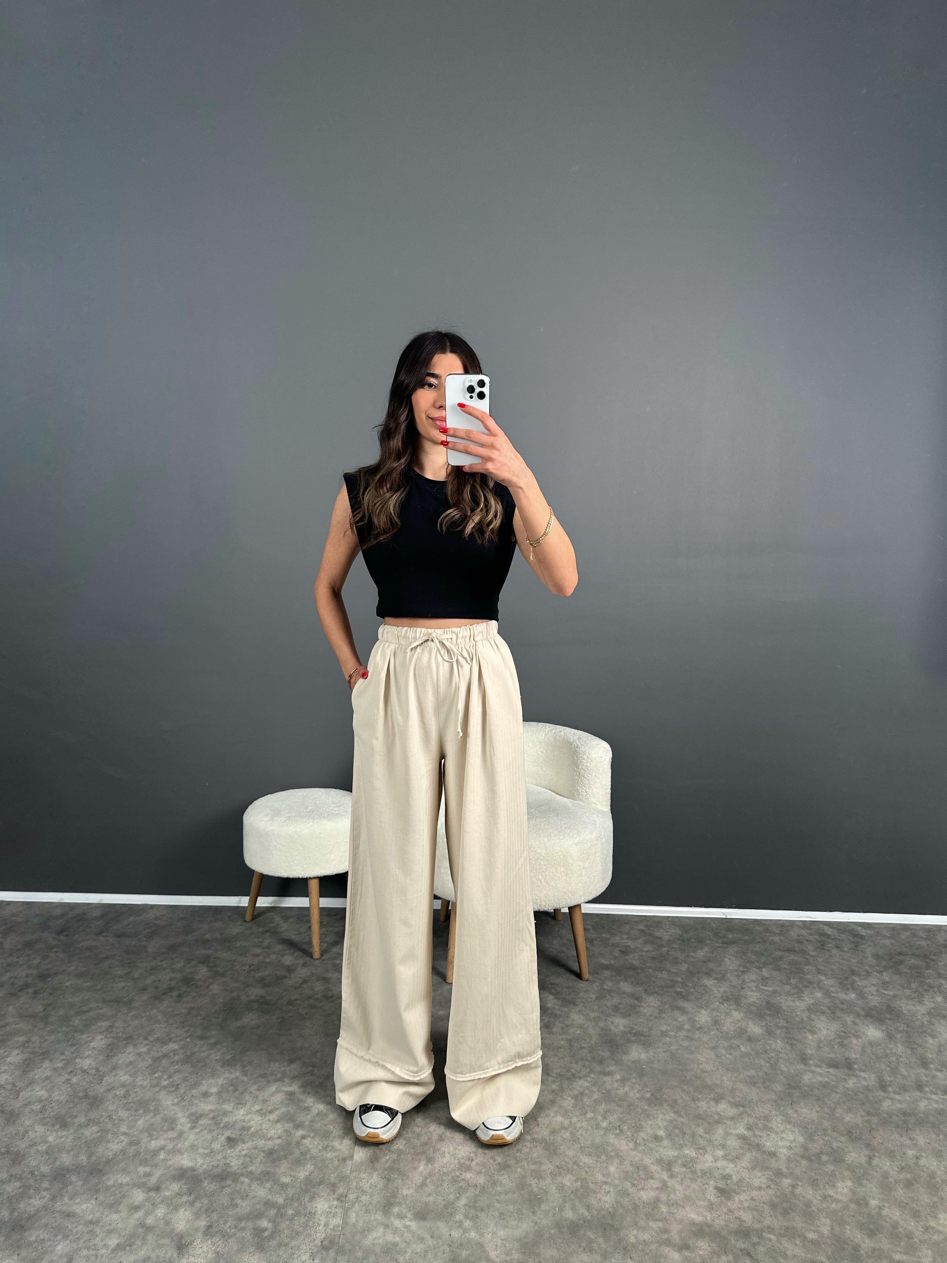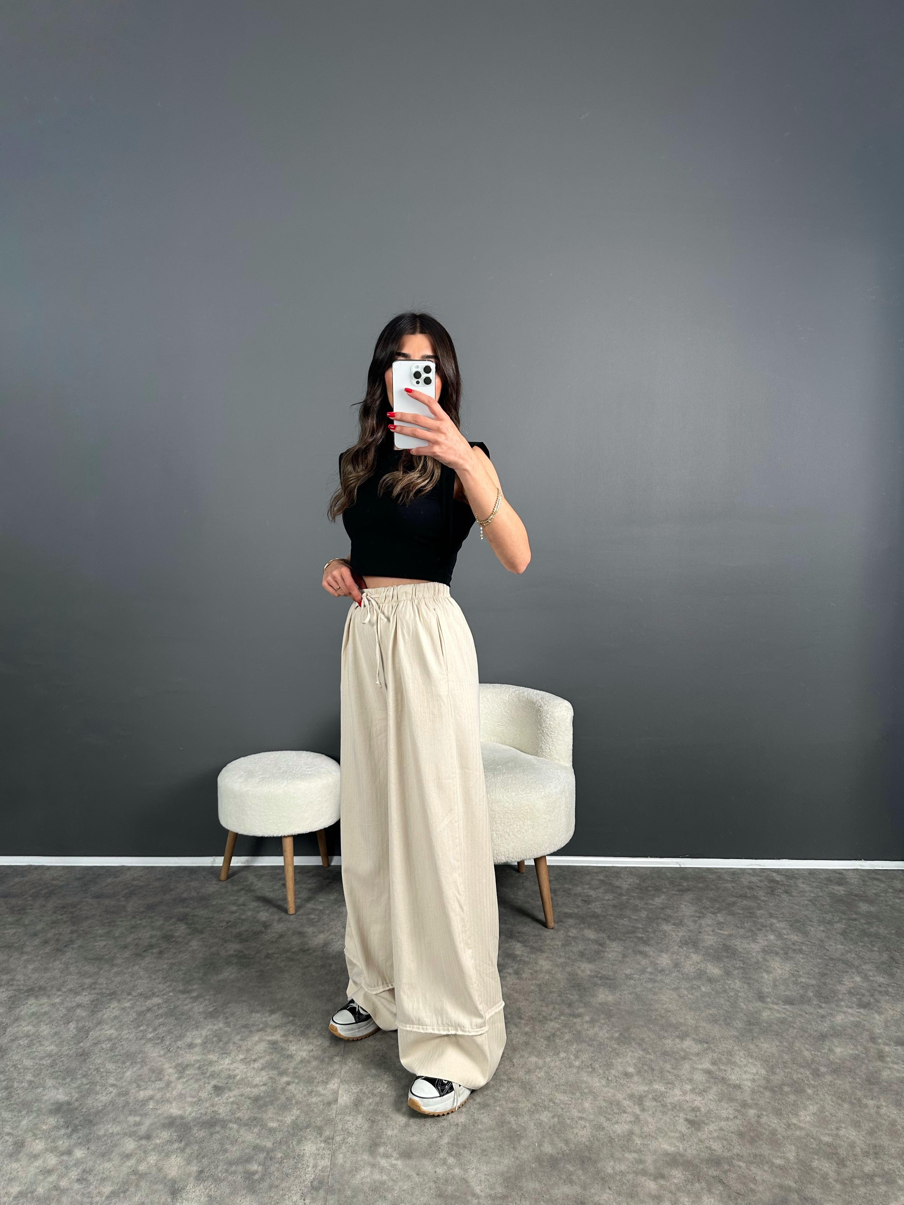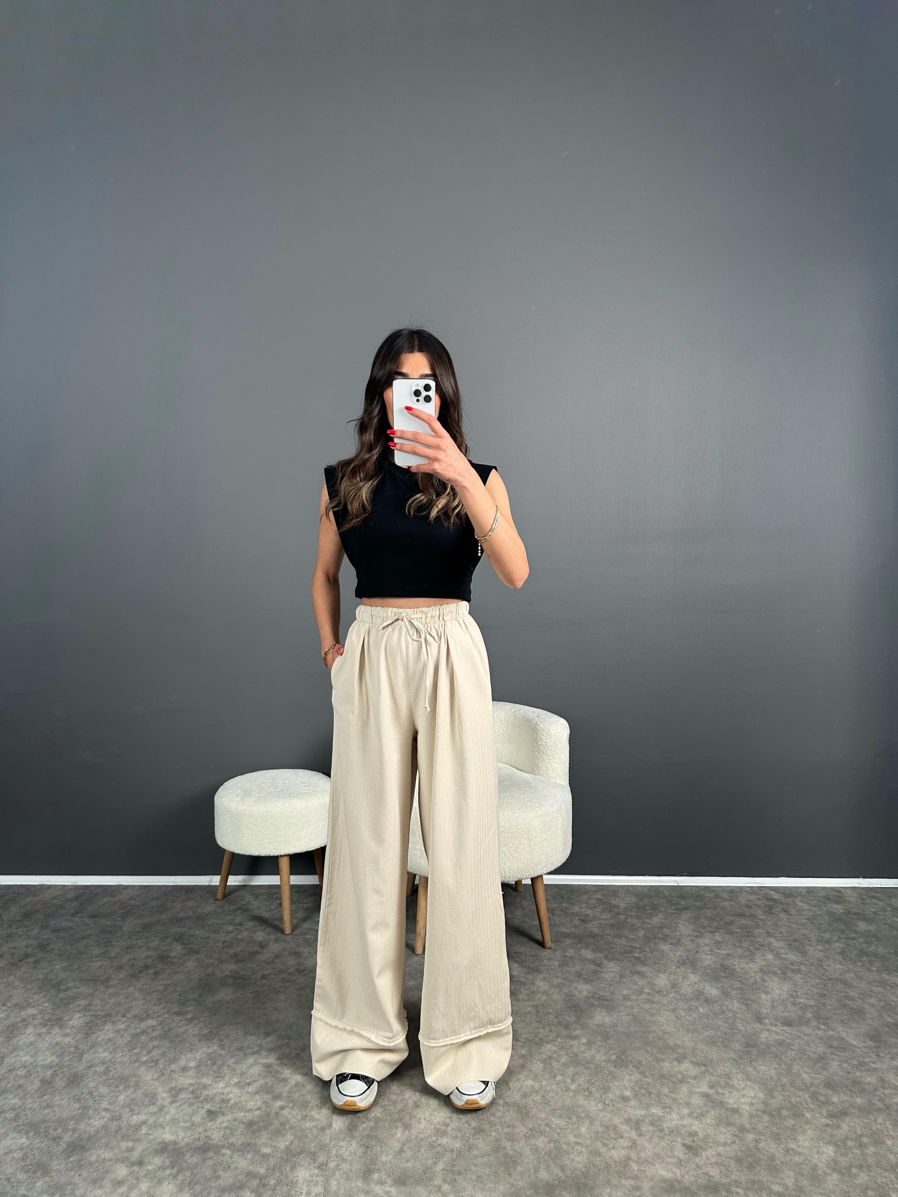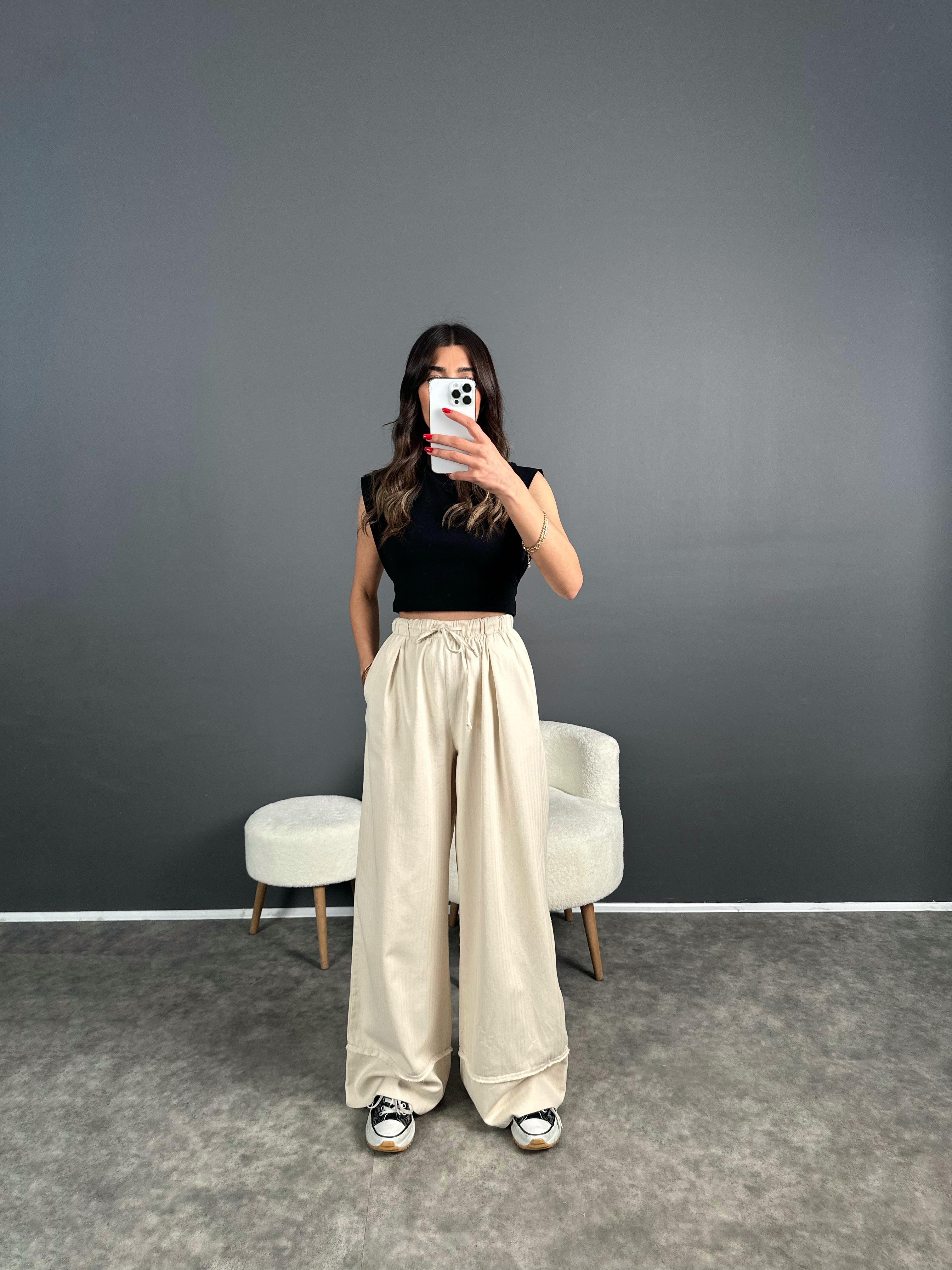 Bol Paça Detaylı Gabardin Beli Lastikli Pantolon