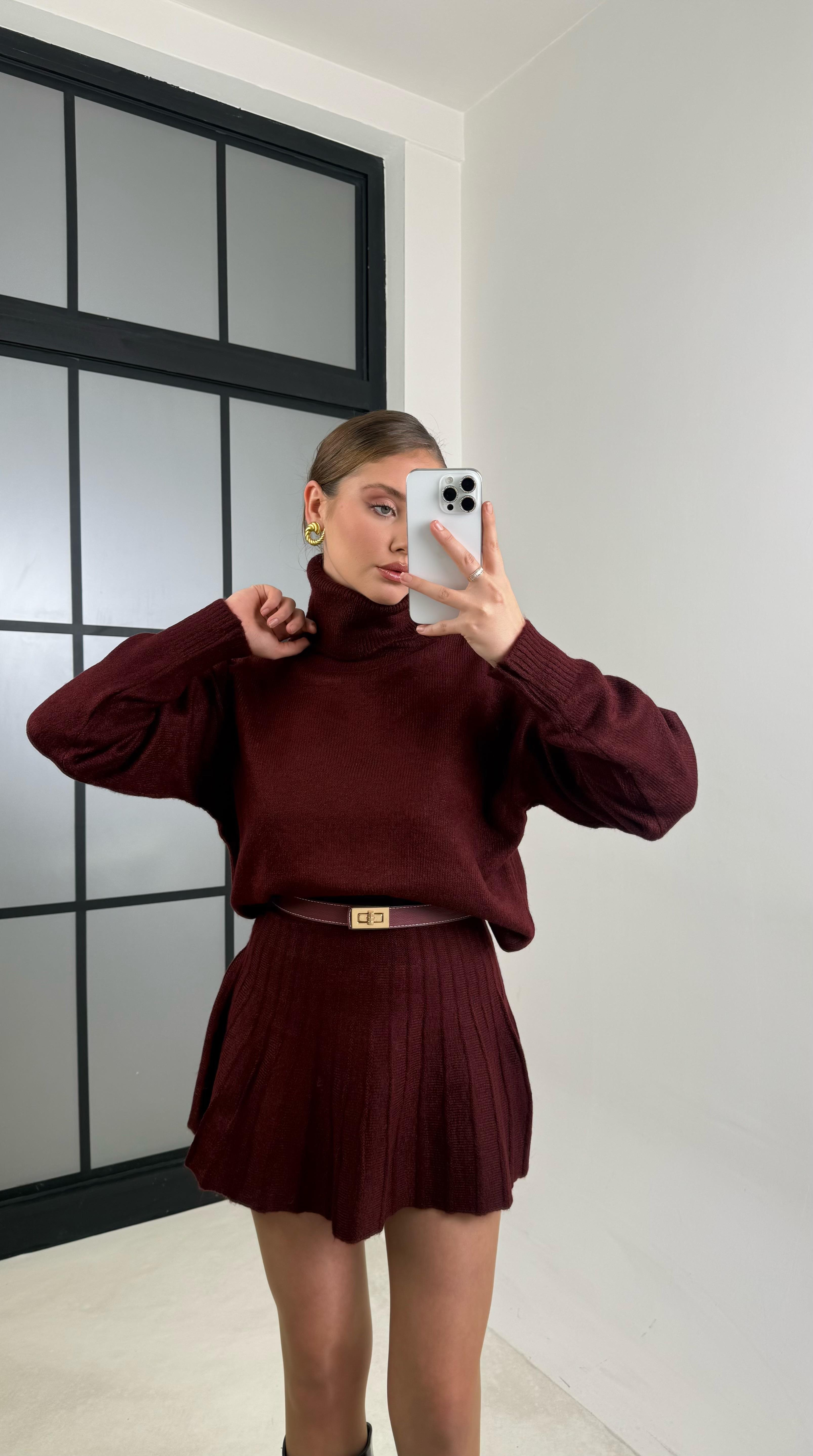 Bordo Balıkçı Yaka Kazak Pileli Etek İkili Triko Takım GAUS-00708