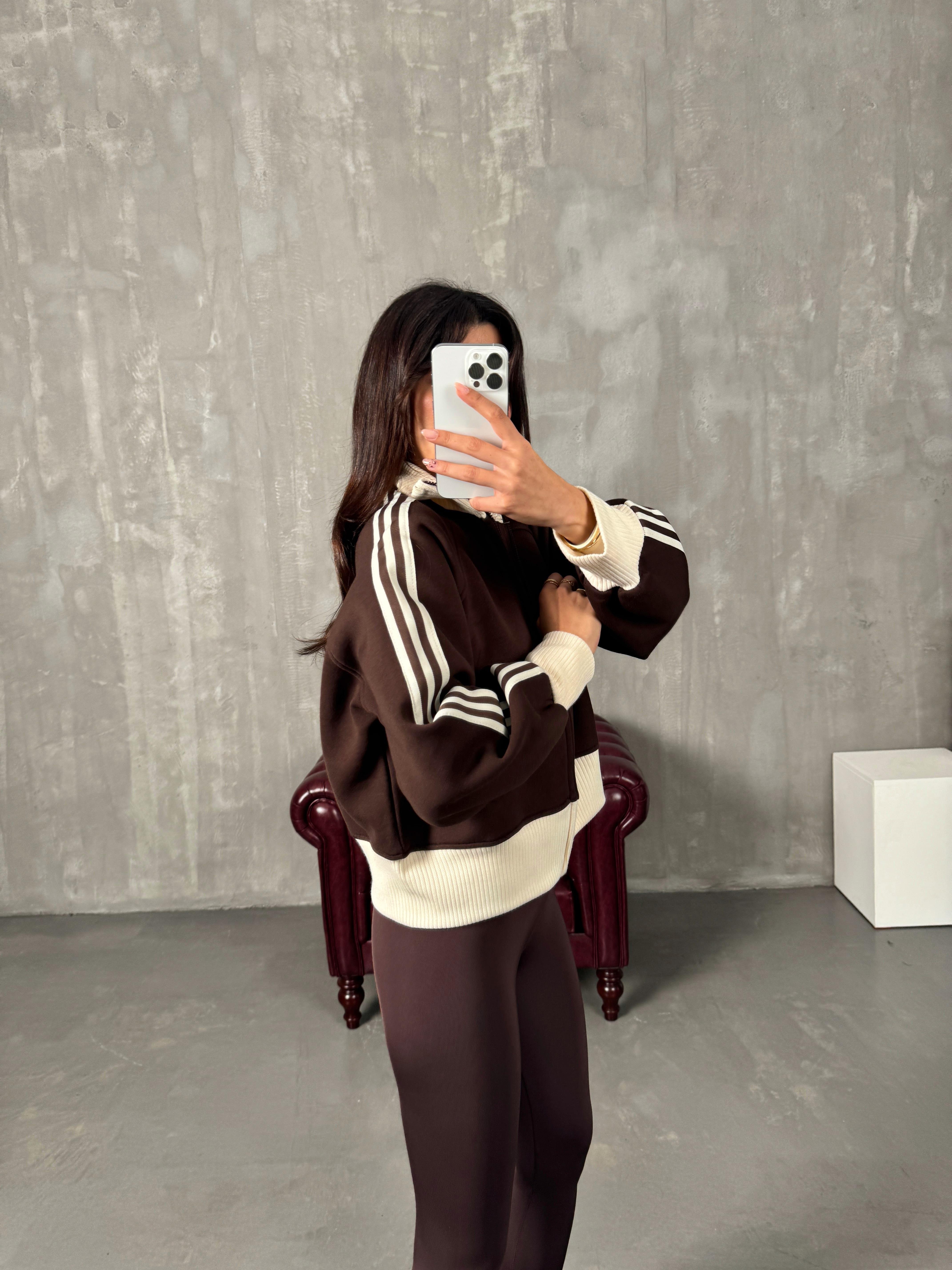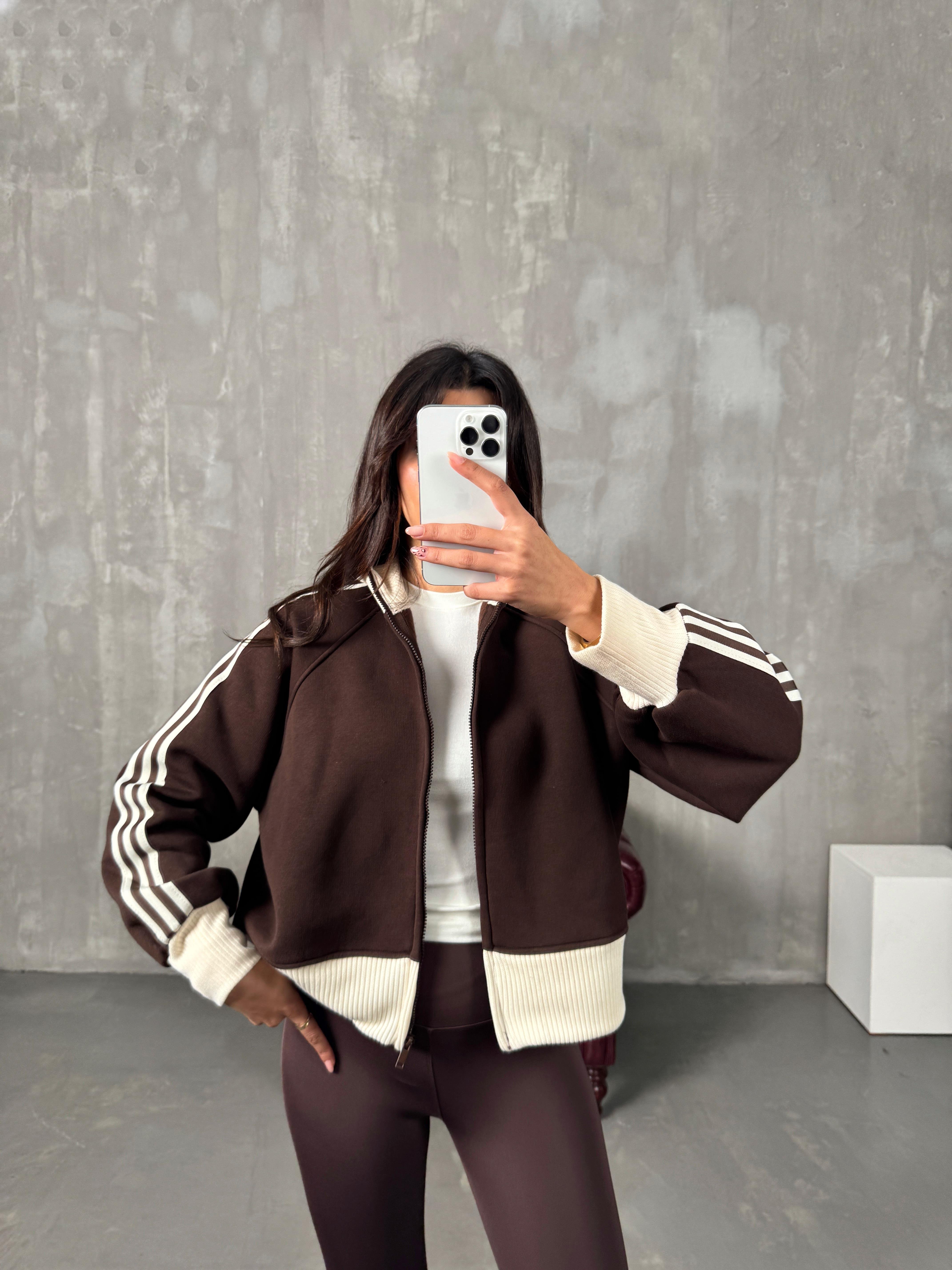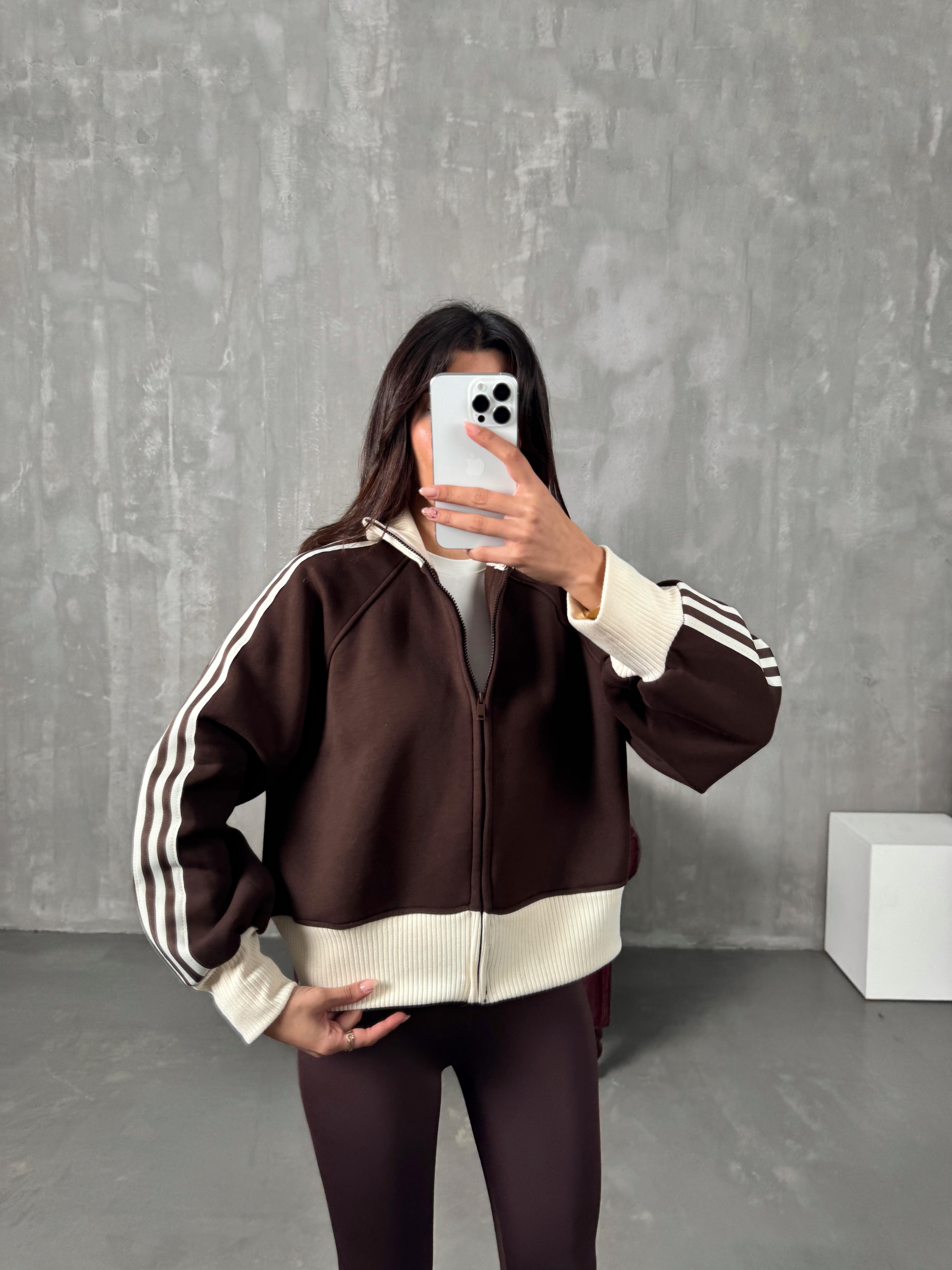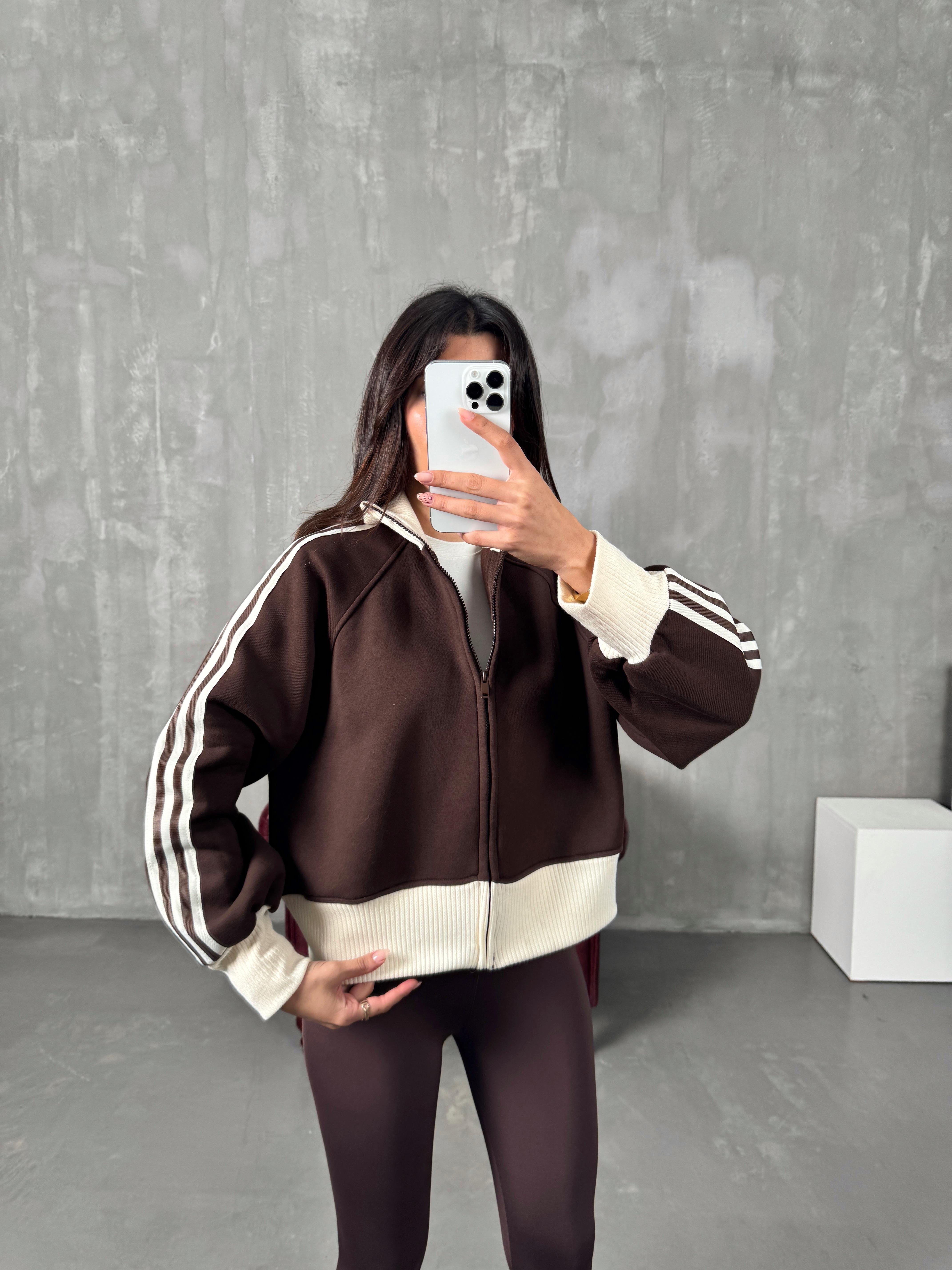 Brenda Kahve Üç İplik Şardonlu Ribanalı Fermuarlı Ceket