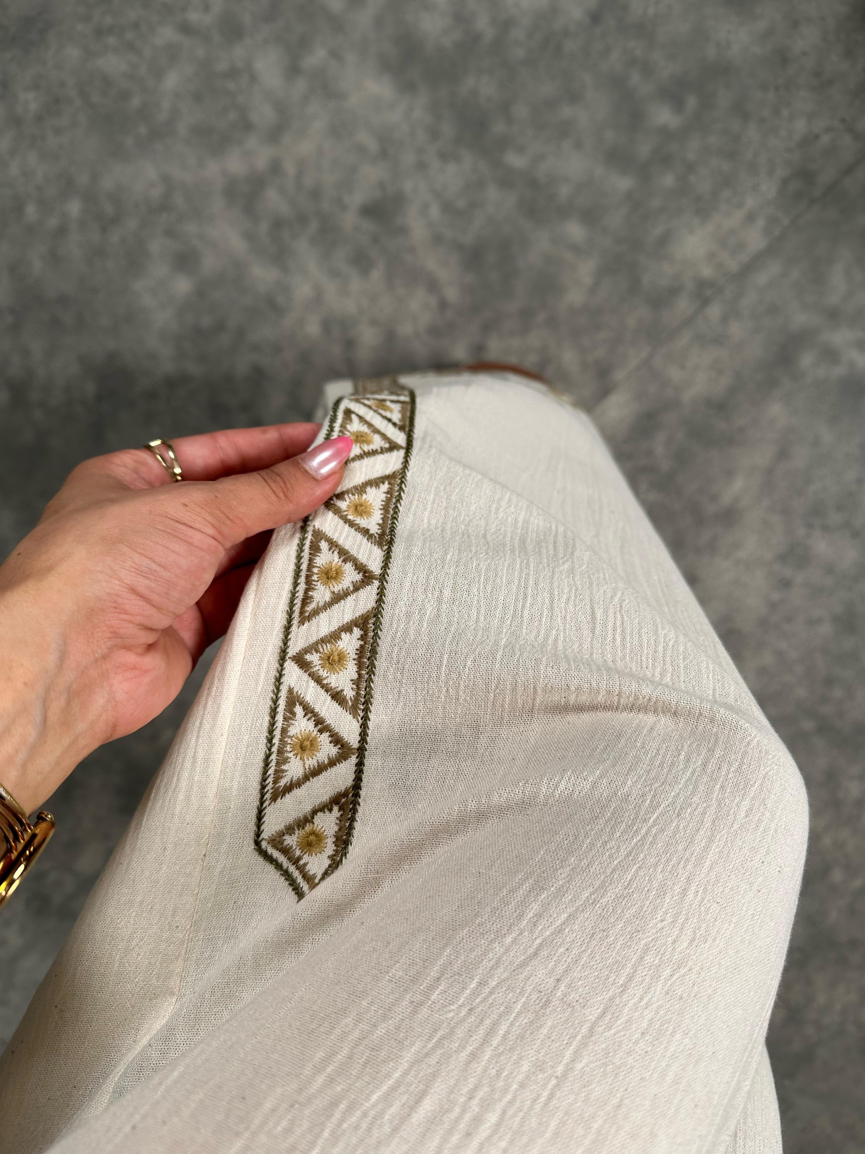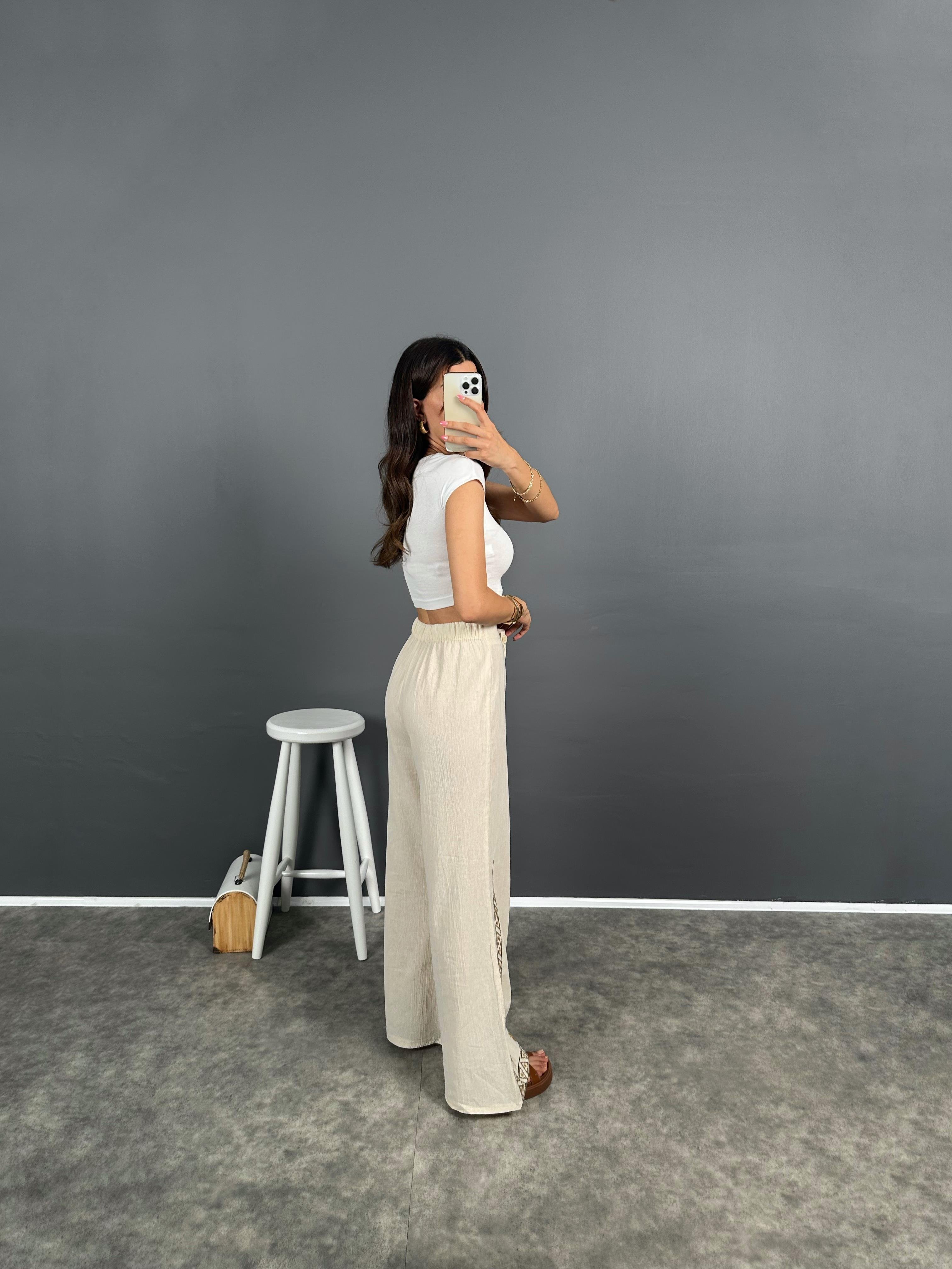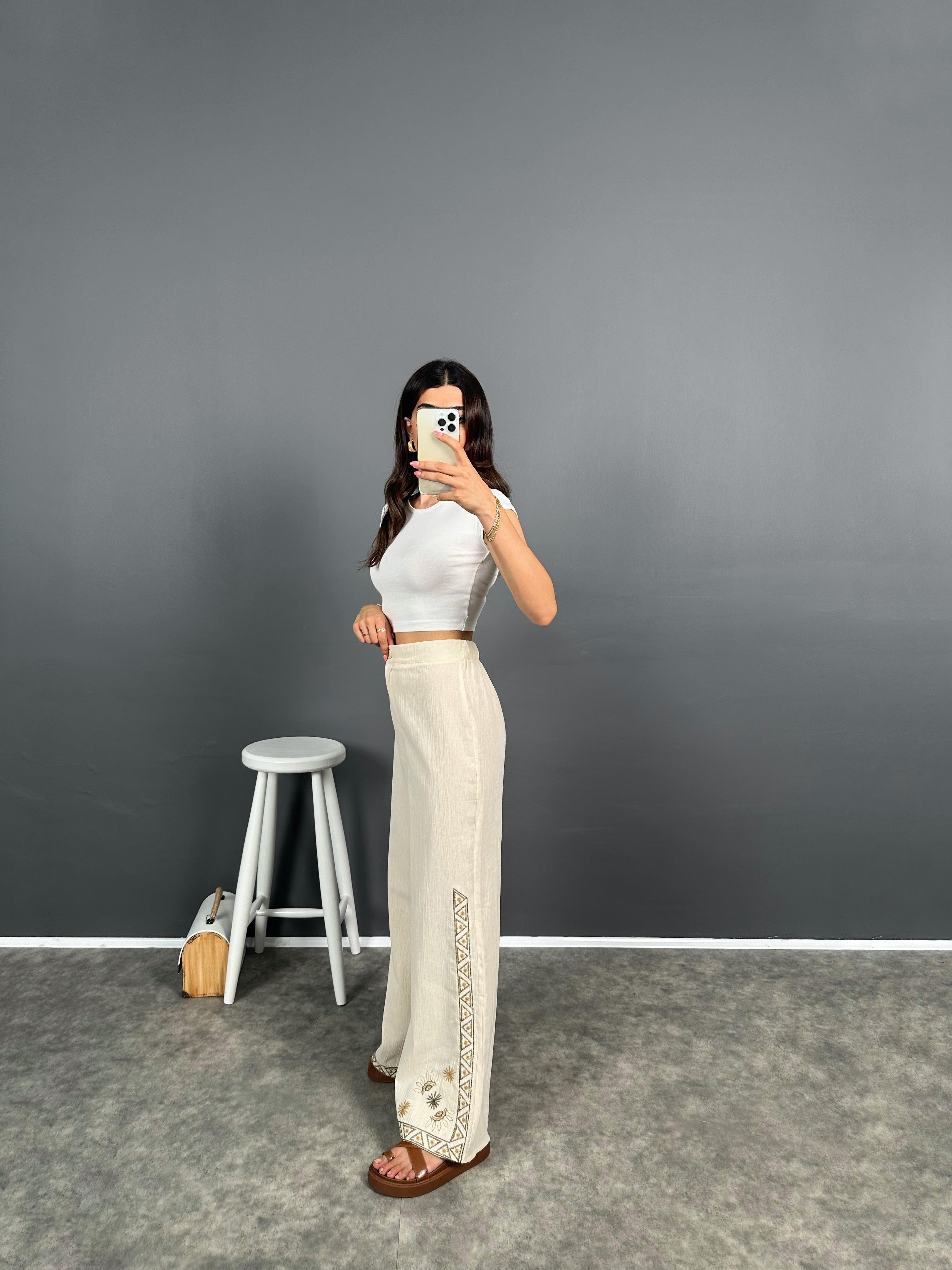 Cans Ekru Nakış İşlemeli Keten Karışımlı Bol Paça Pantolon