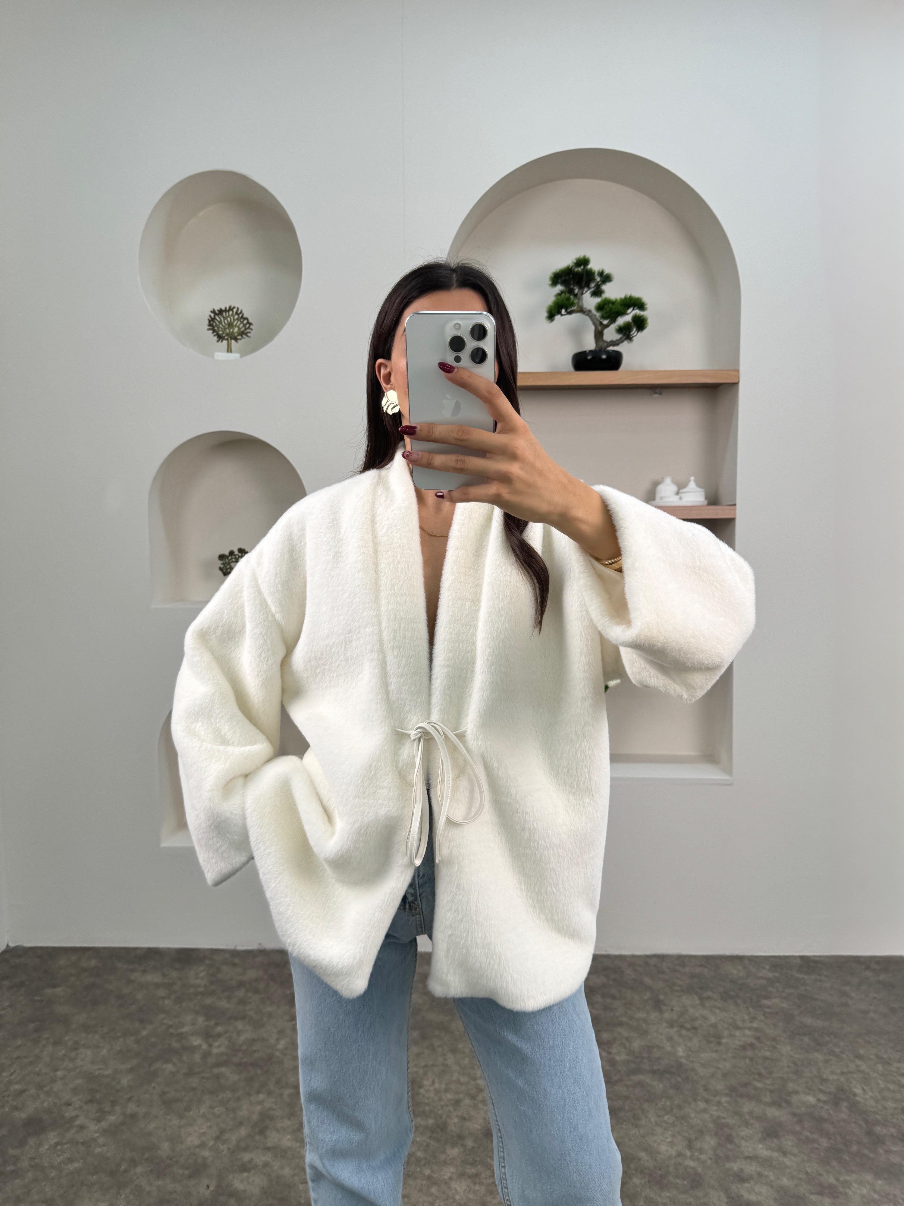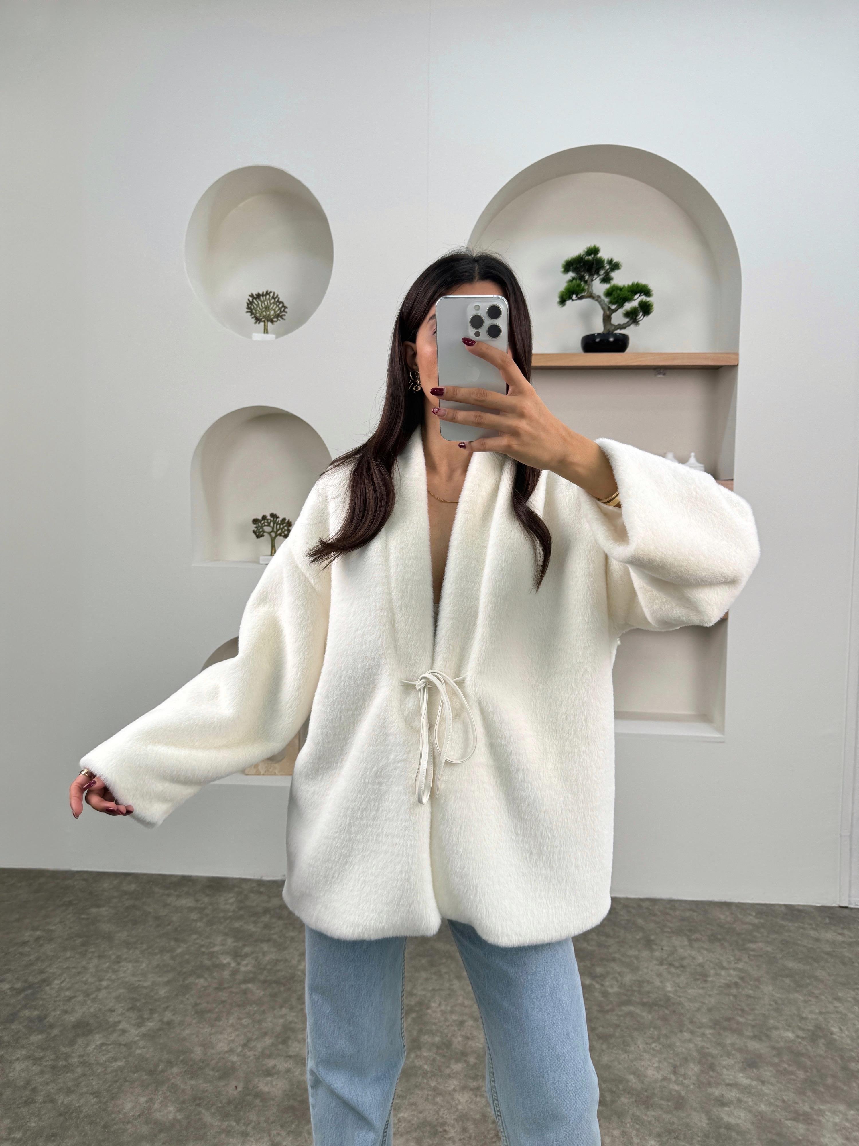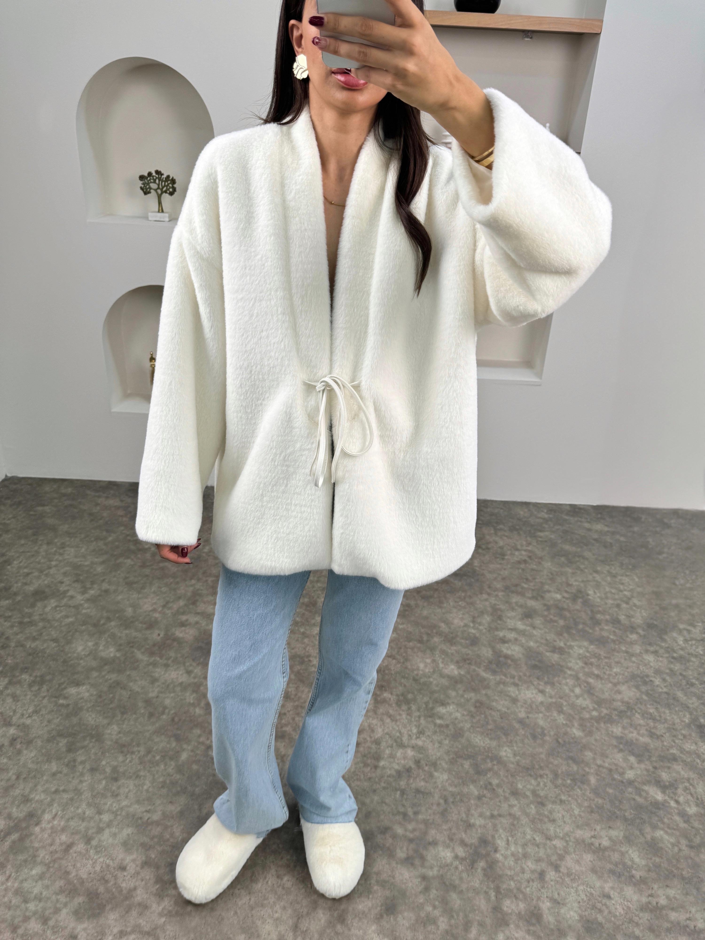 Carol Beyaz Bağlamalı Astarlı Yumuşak Sakallı Kürk Ceket