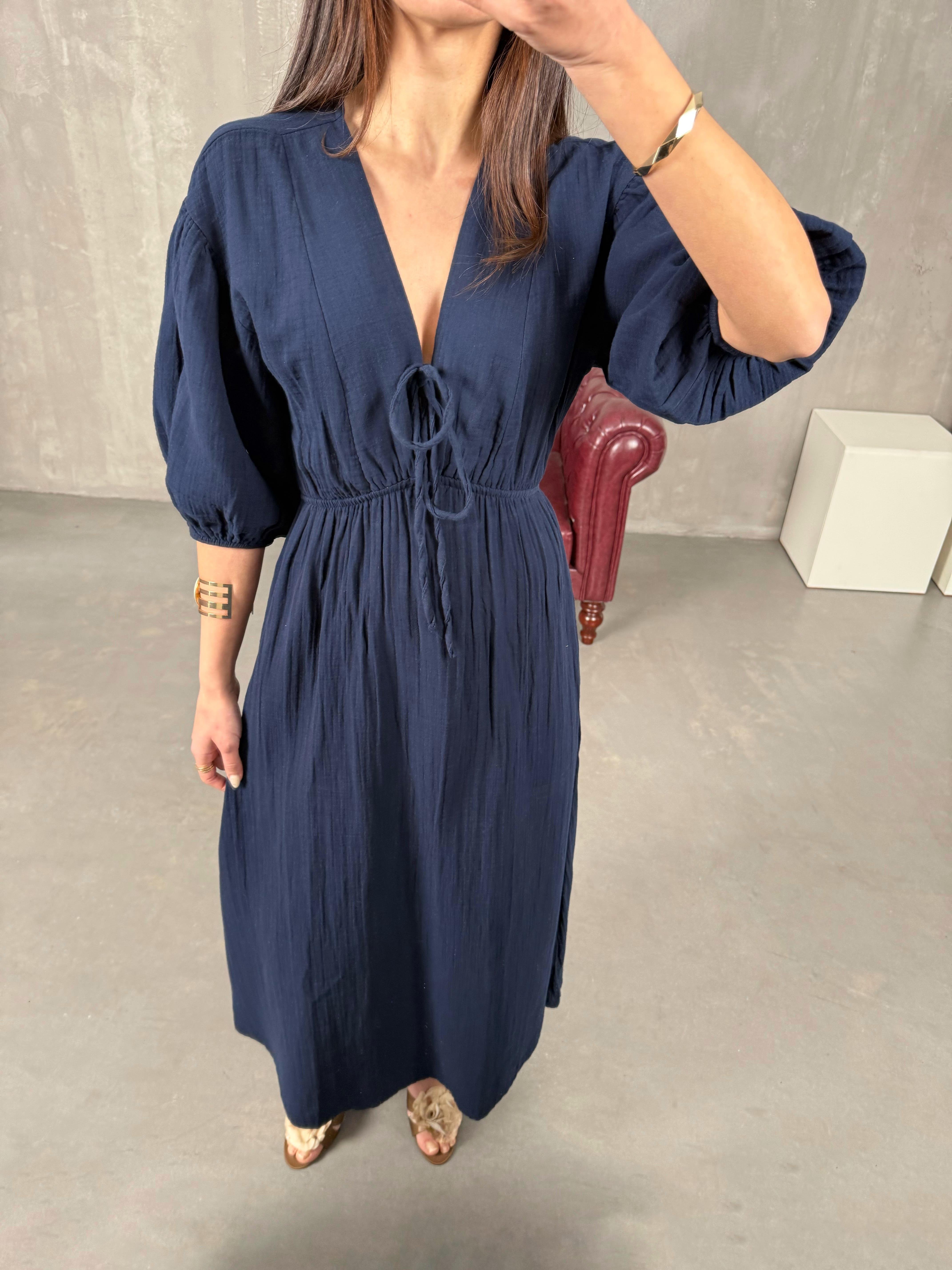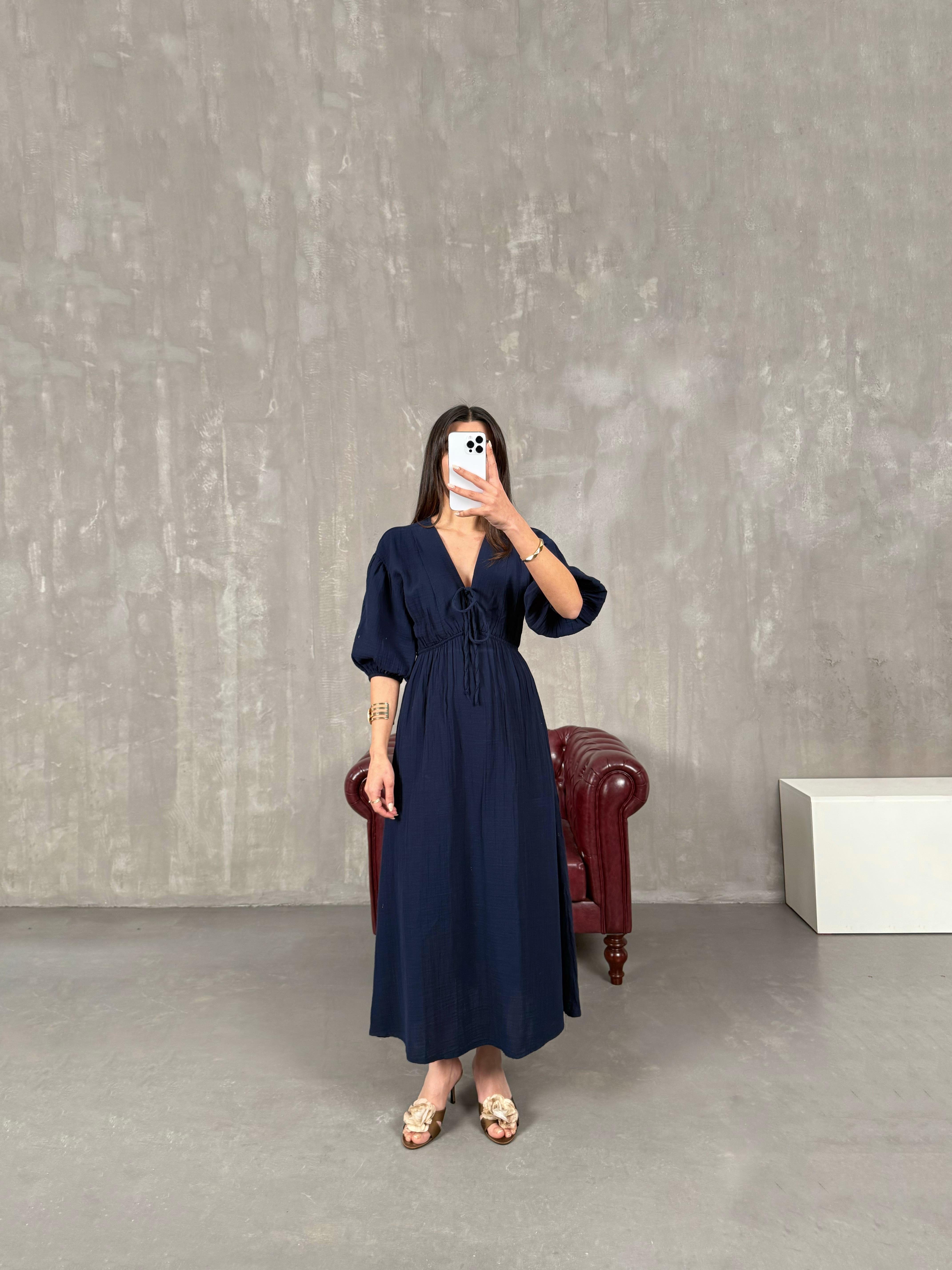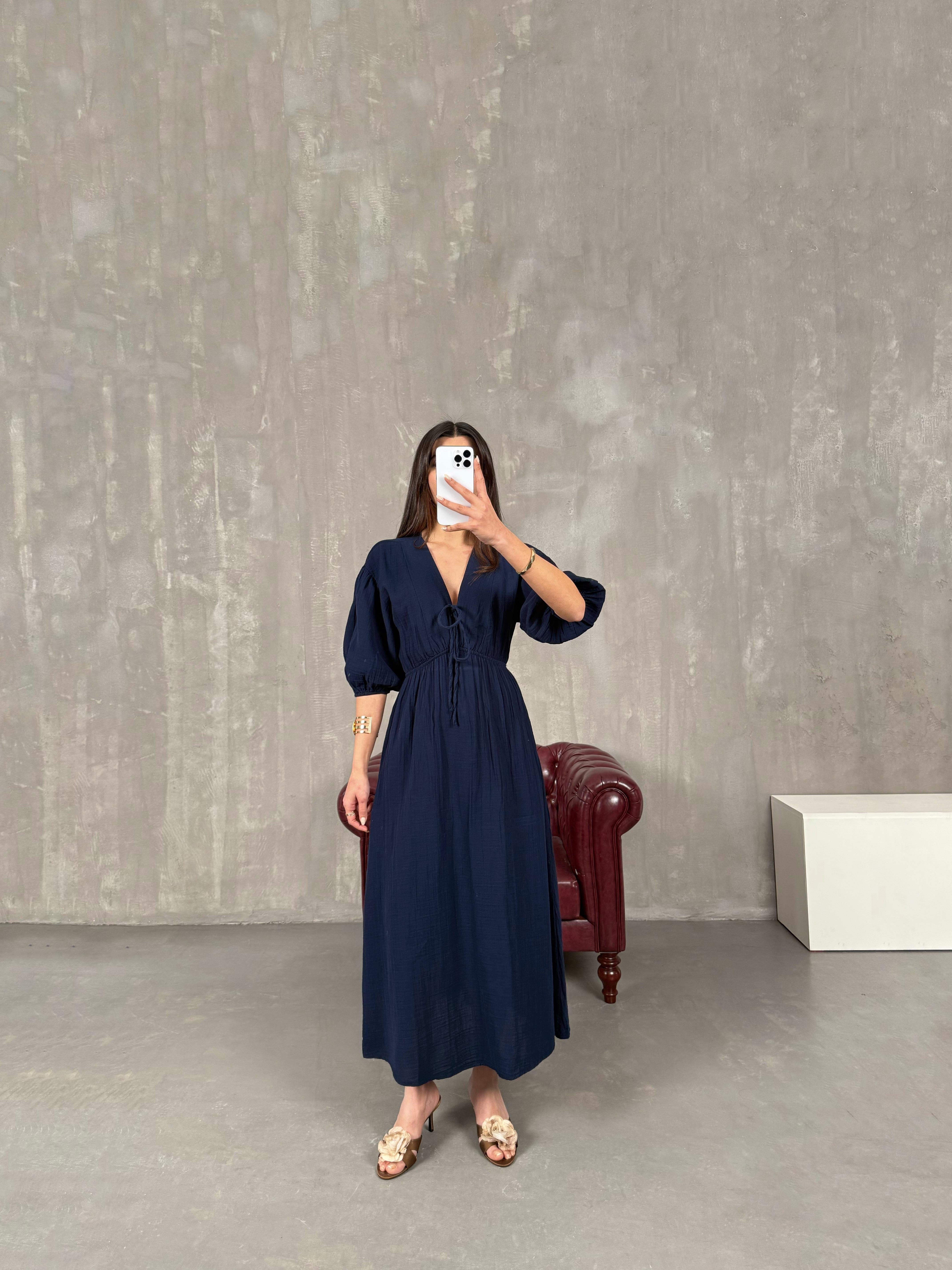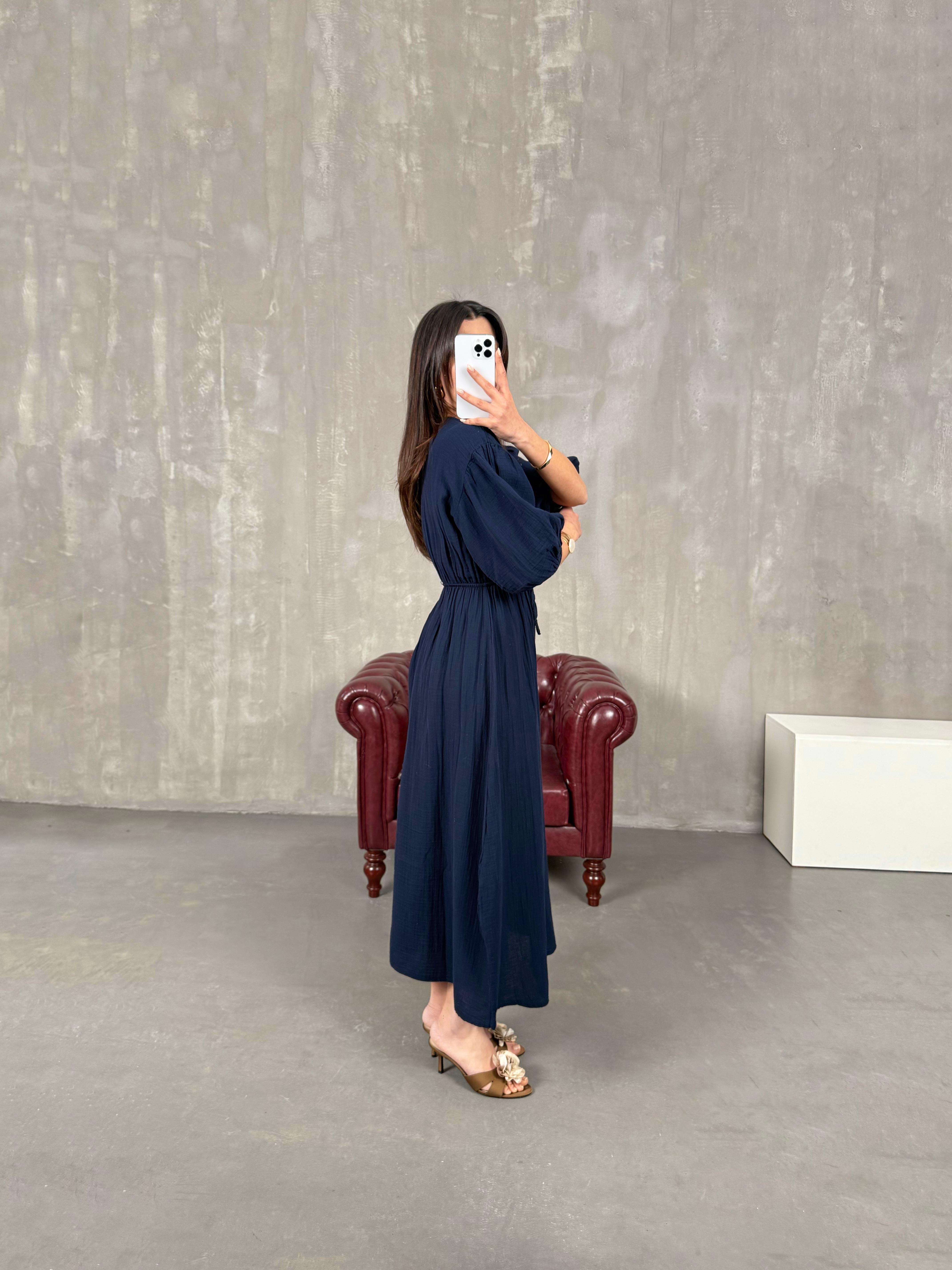 جسيكا فستان كحلي قماش موسلين بياقة شكل V وخصر مطاطي