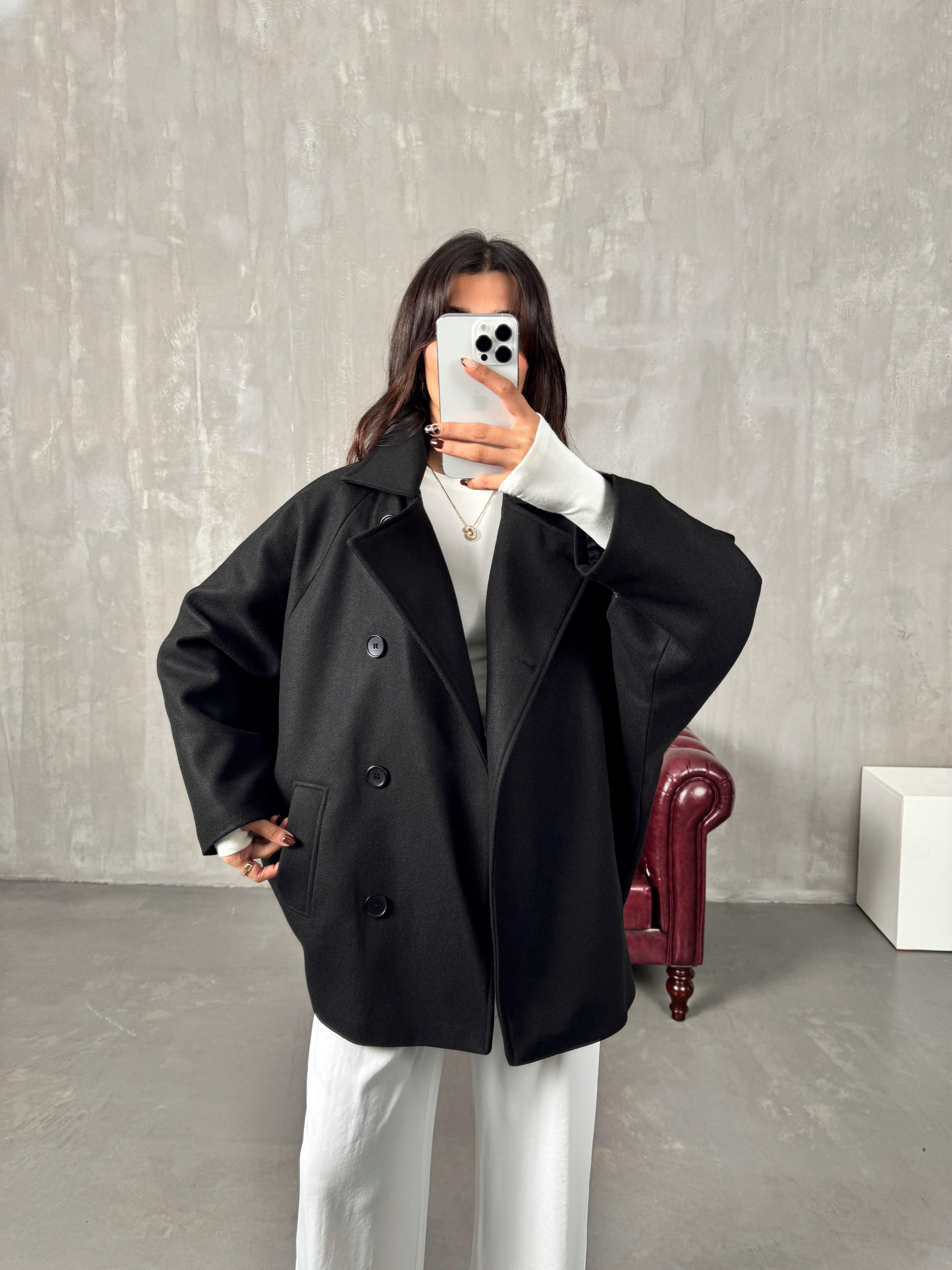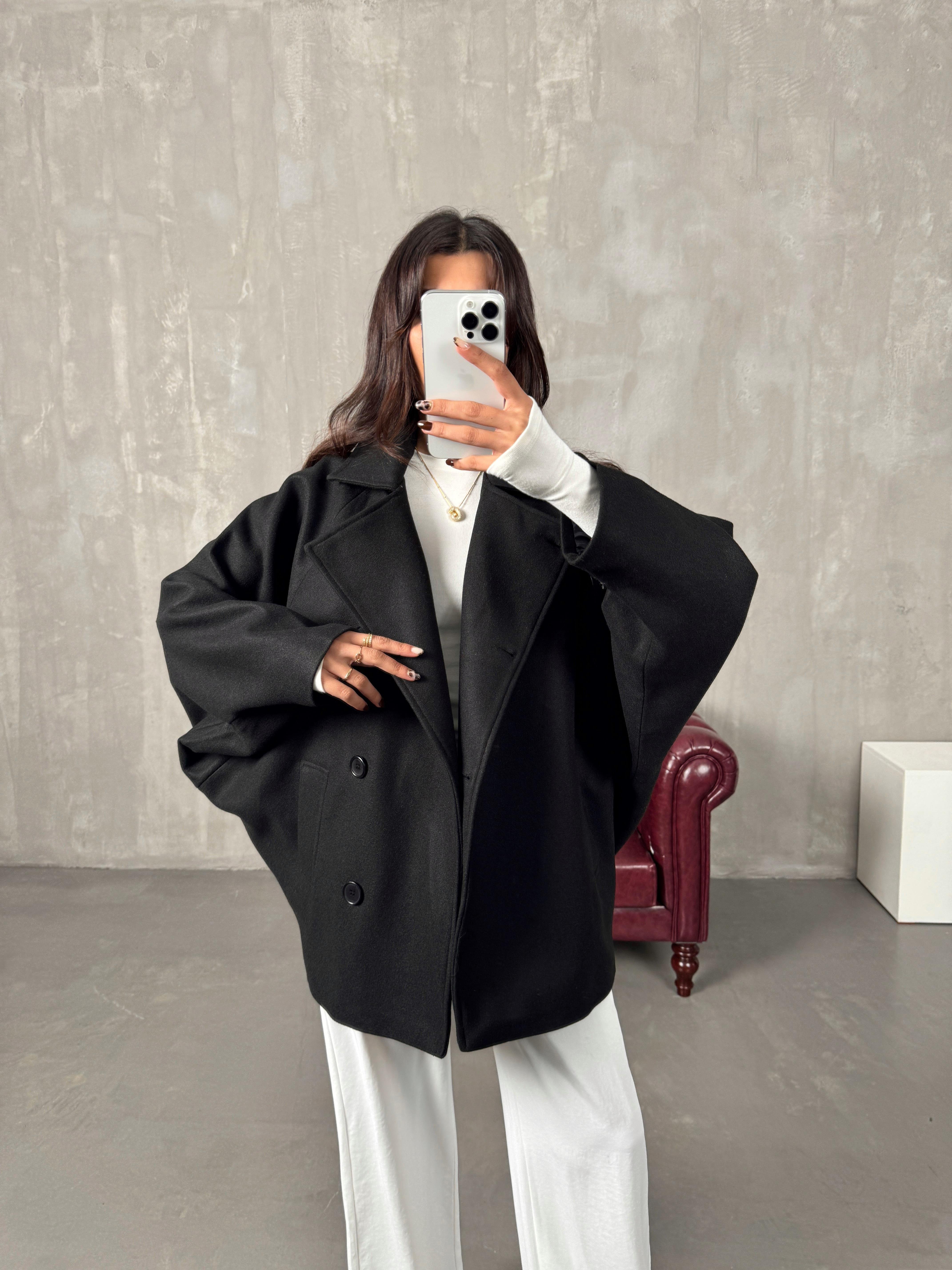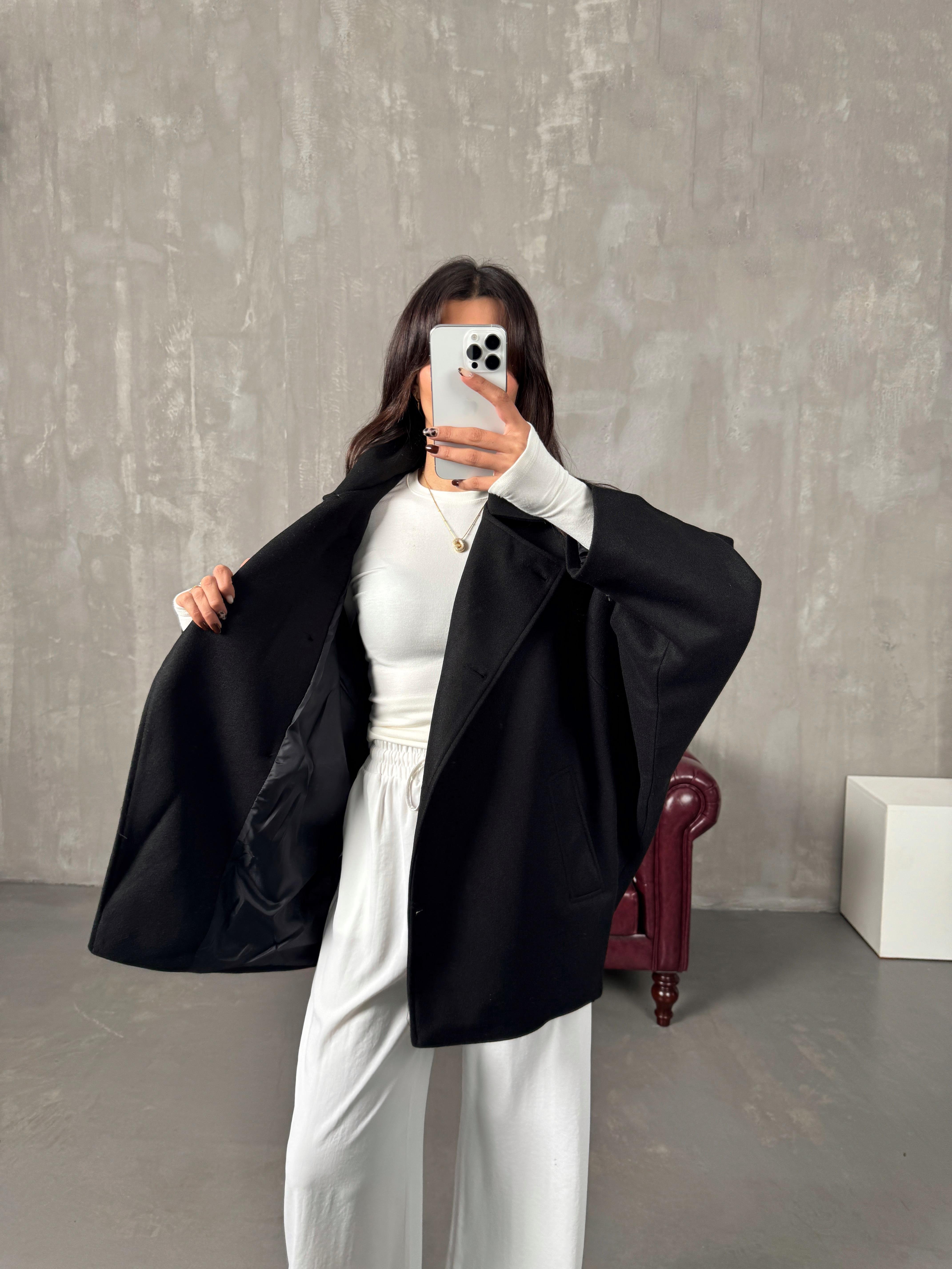 Cowe Siyah Yarasa Model Astarlı Kaşe Kaban