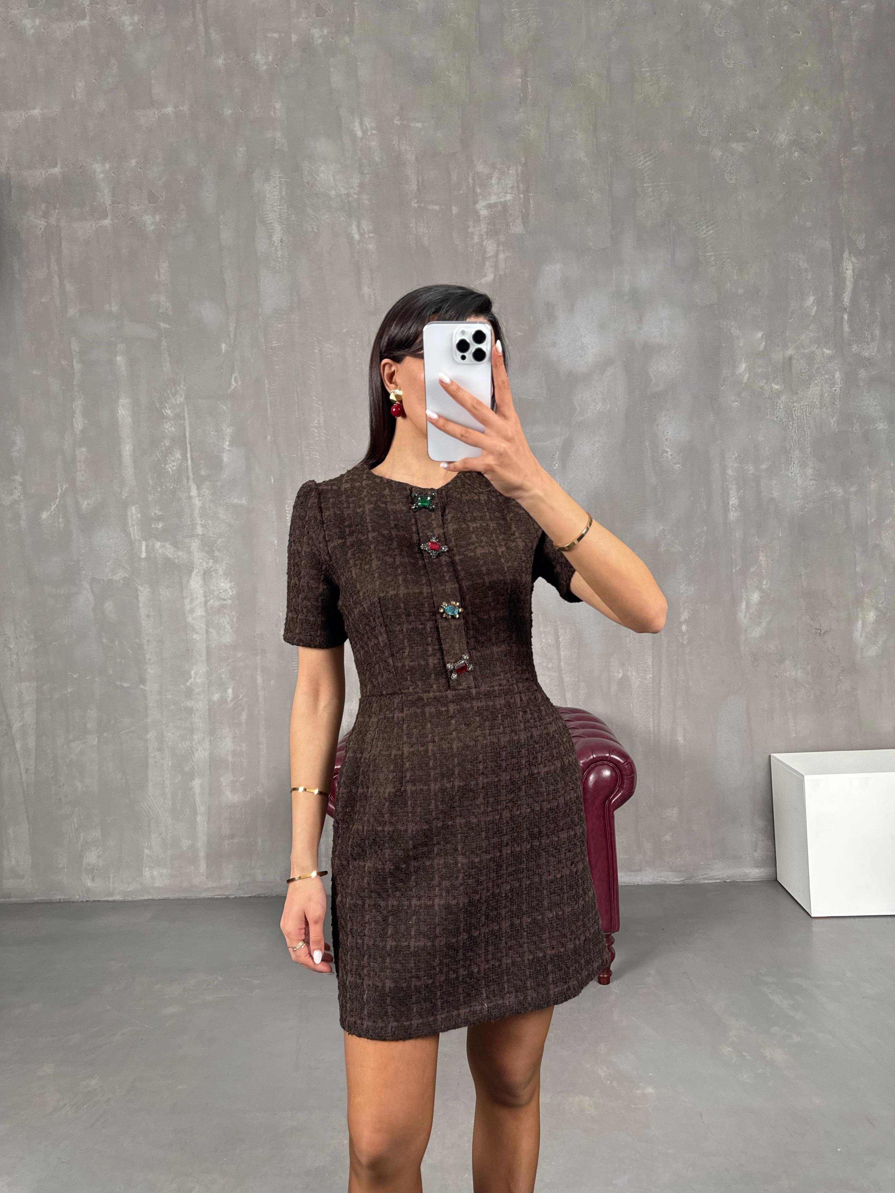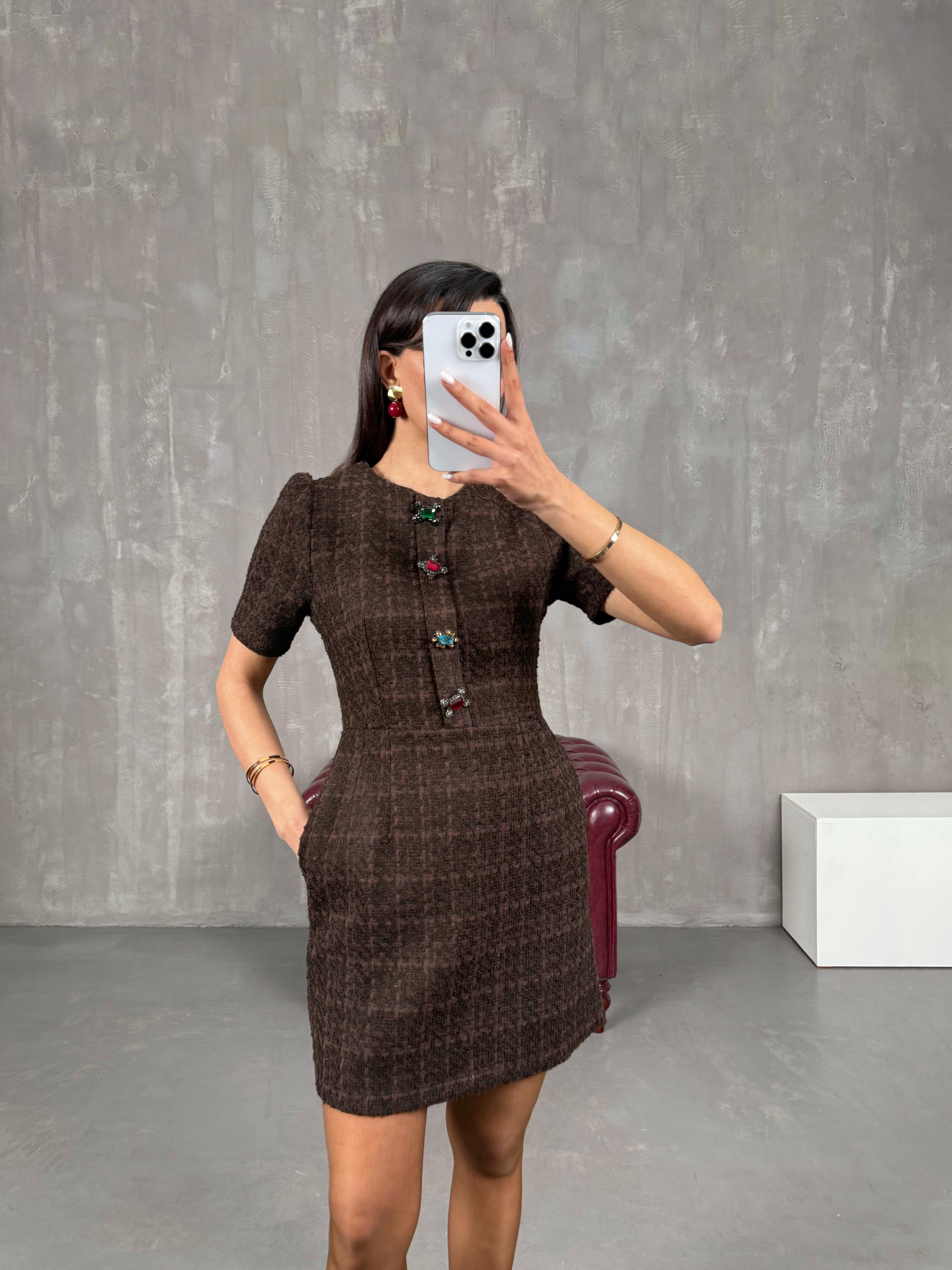 ديرسا فستان تويد مُعادل لون بني داكن بأزرار حجرية