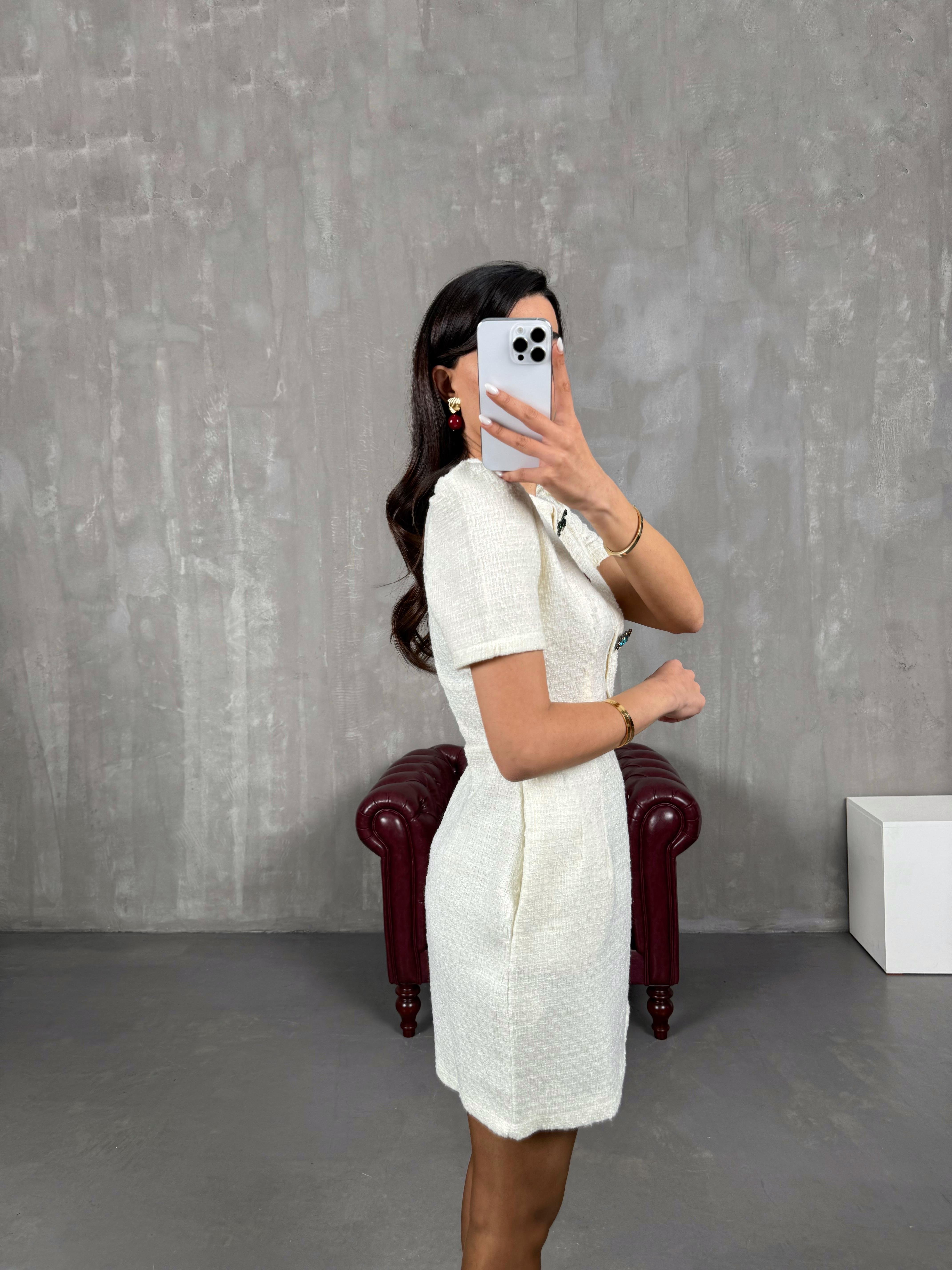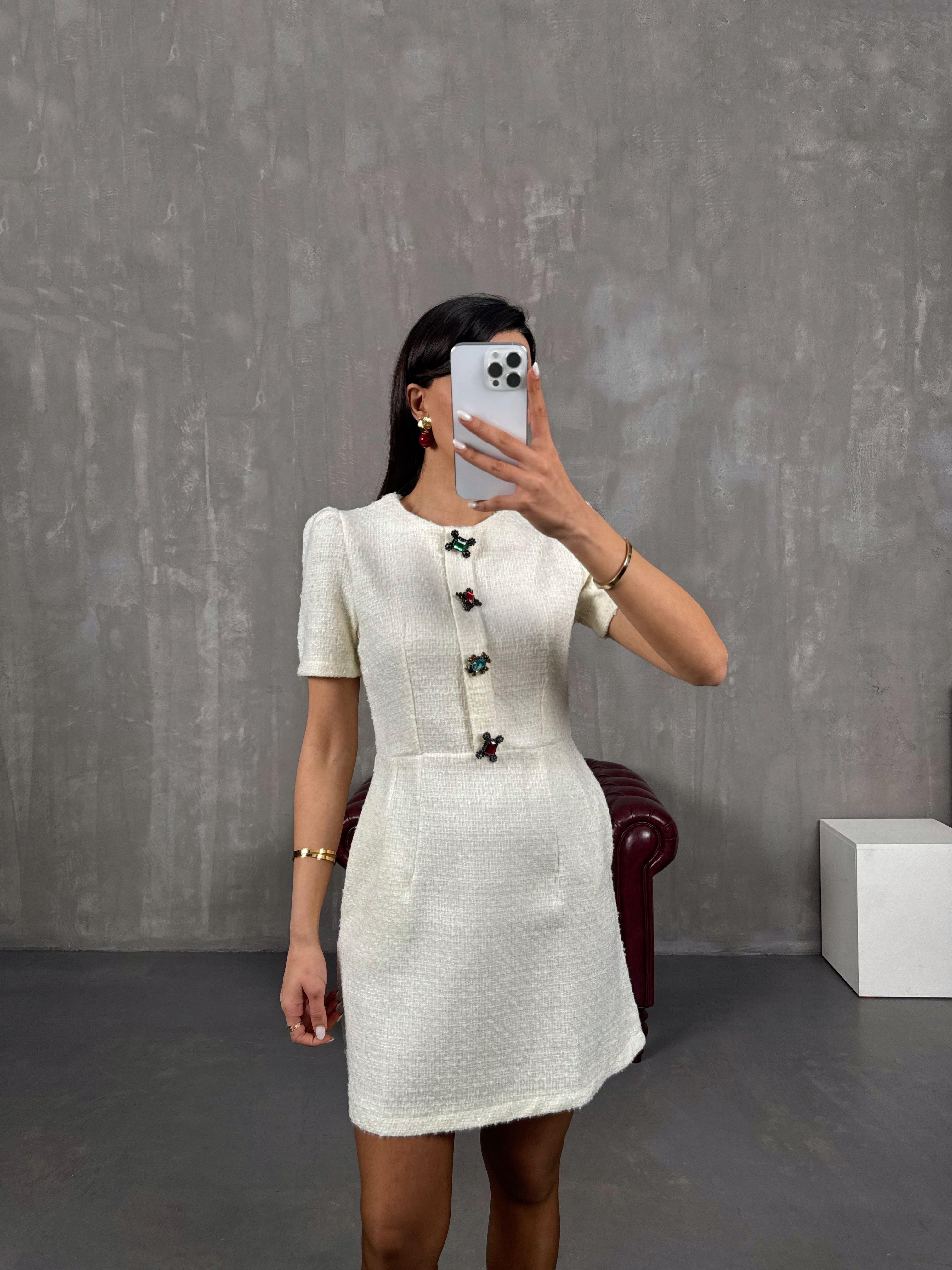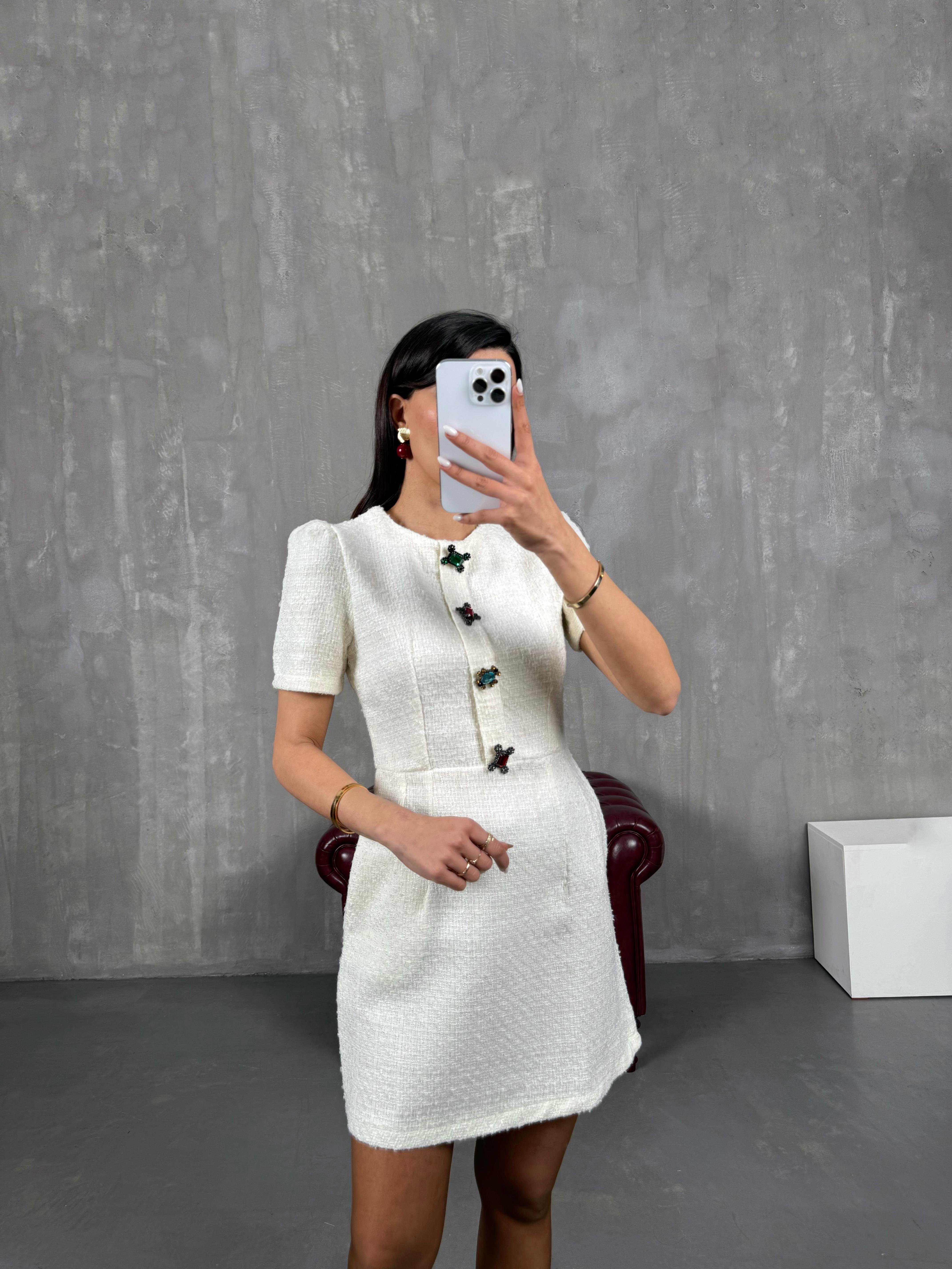 ديرسا فستان تويد مُعادل لون كريمي بأزرار حجرية