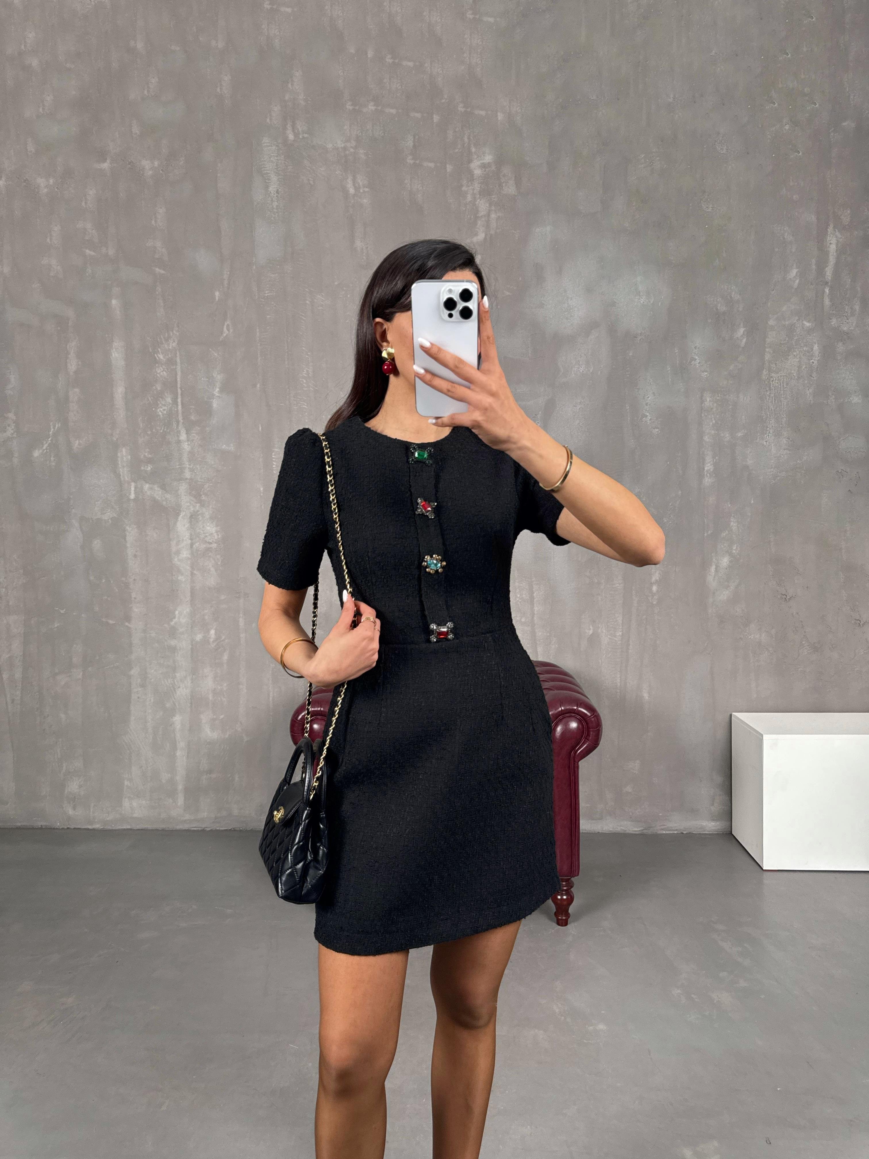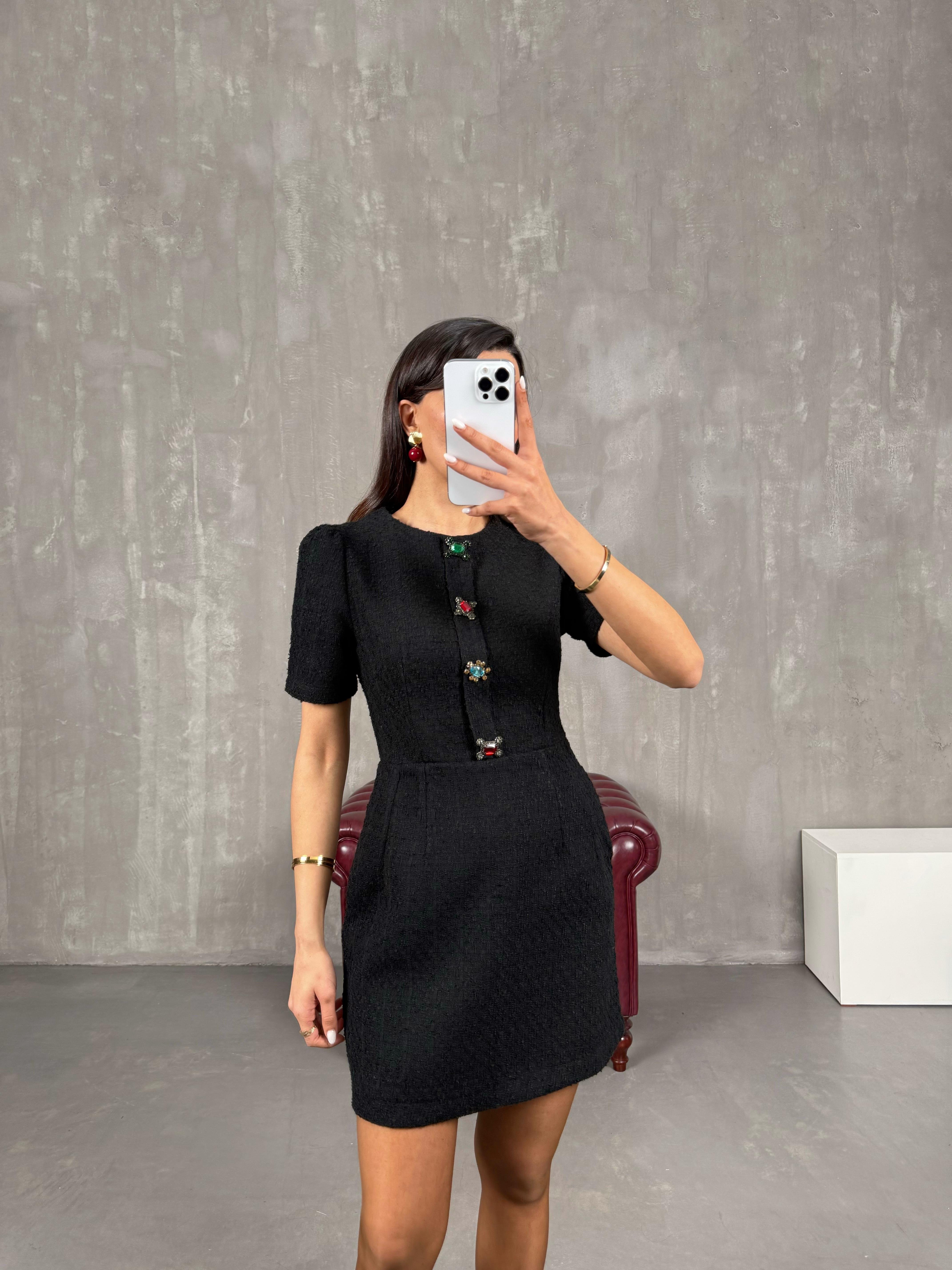 ديرسا فستان تويد مُعادل لون أسود بأزرار حجرية