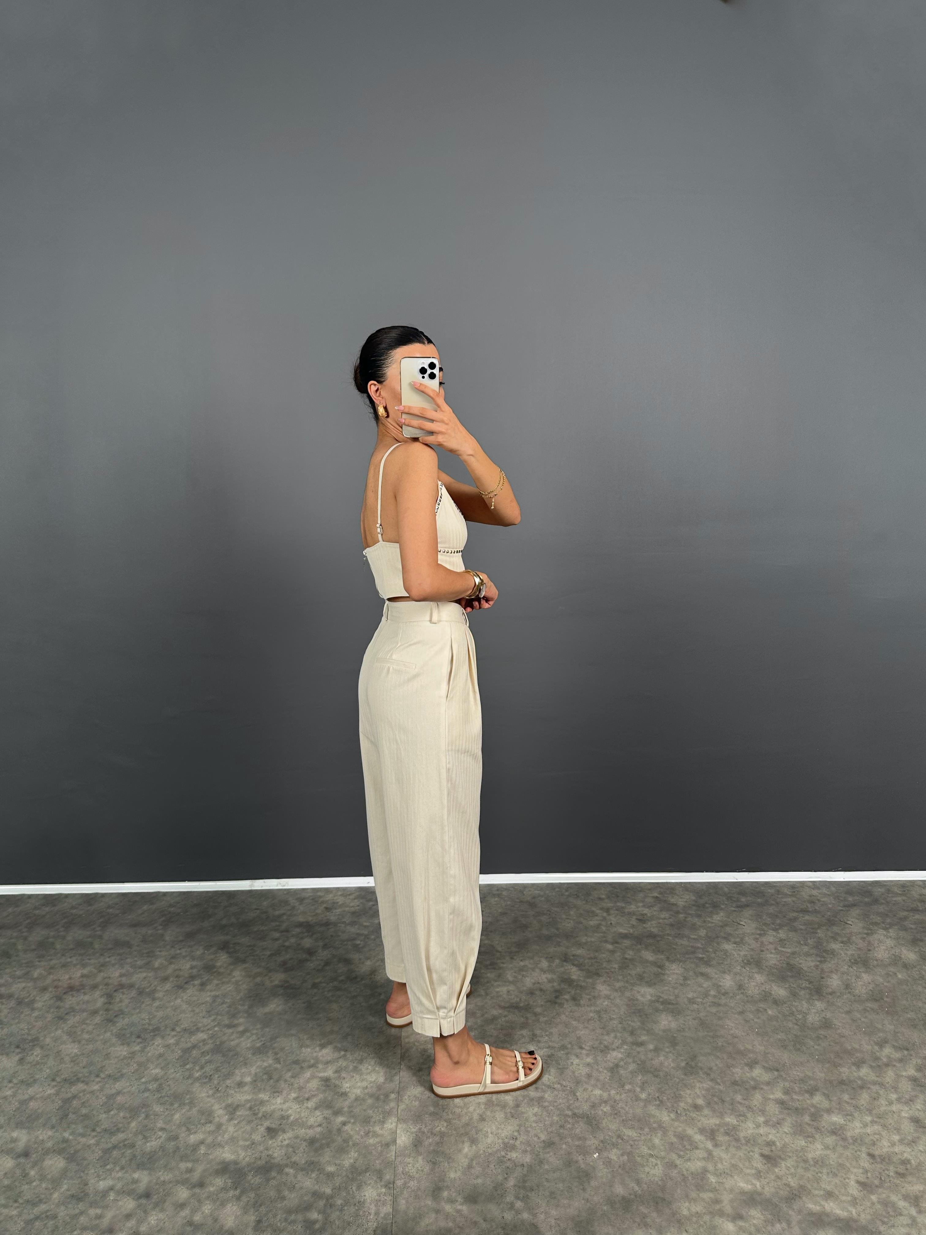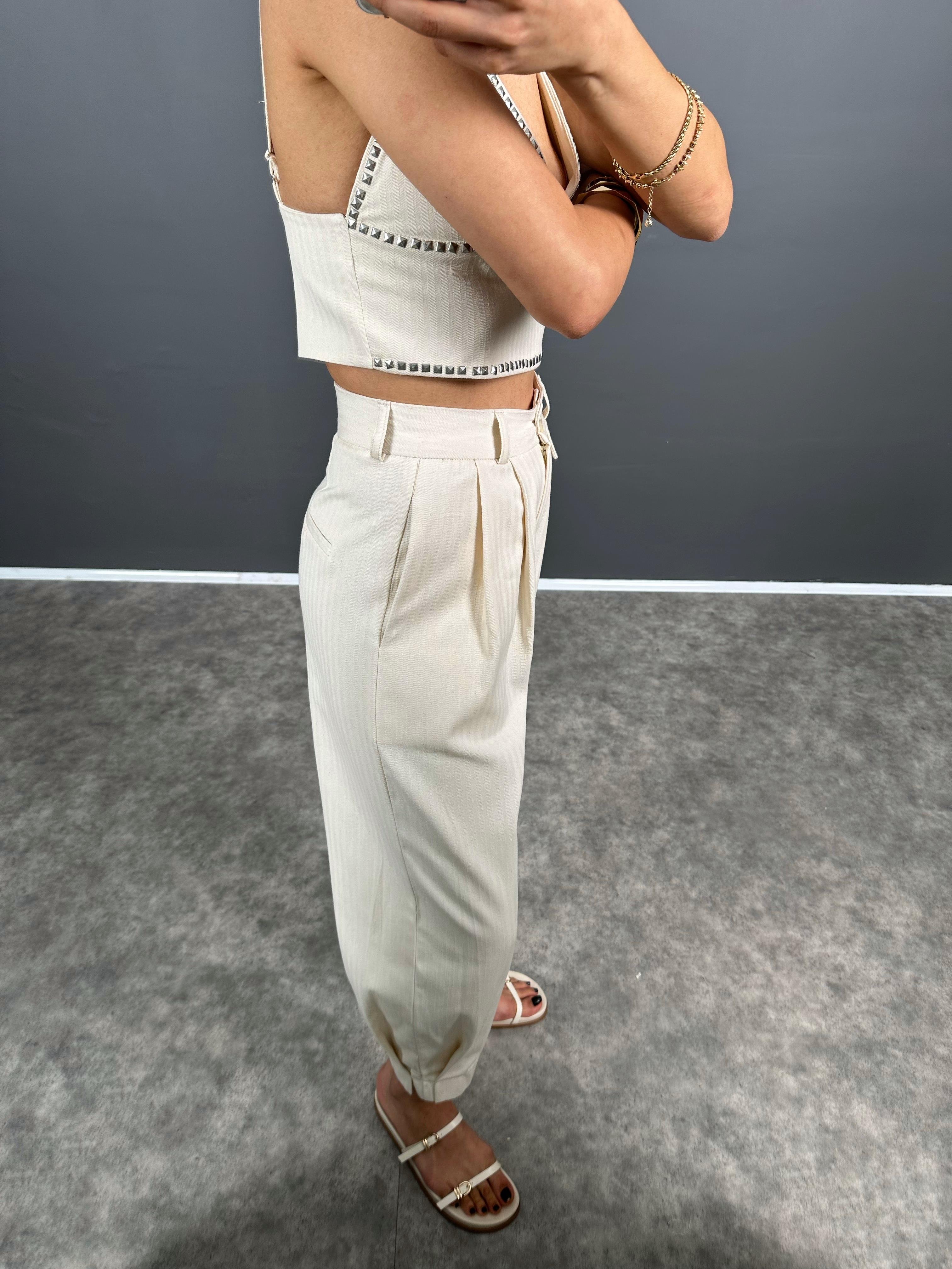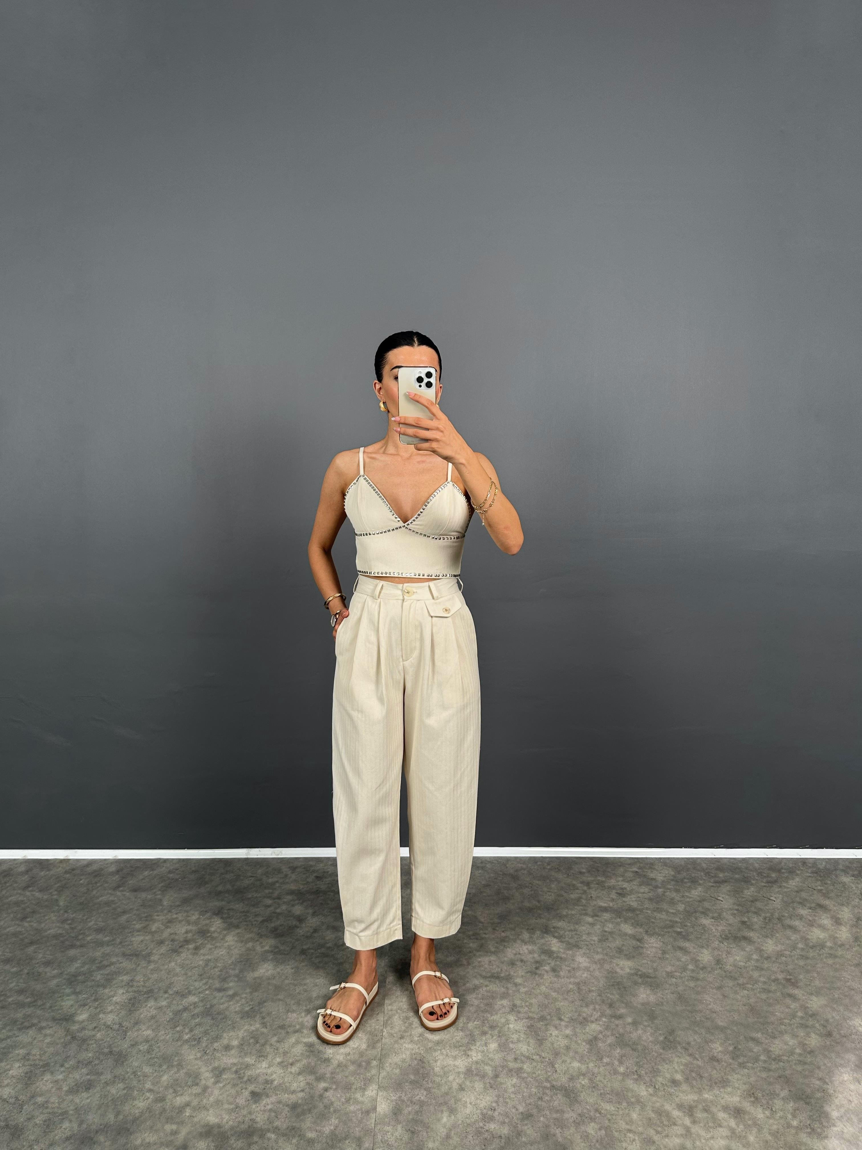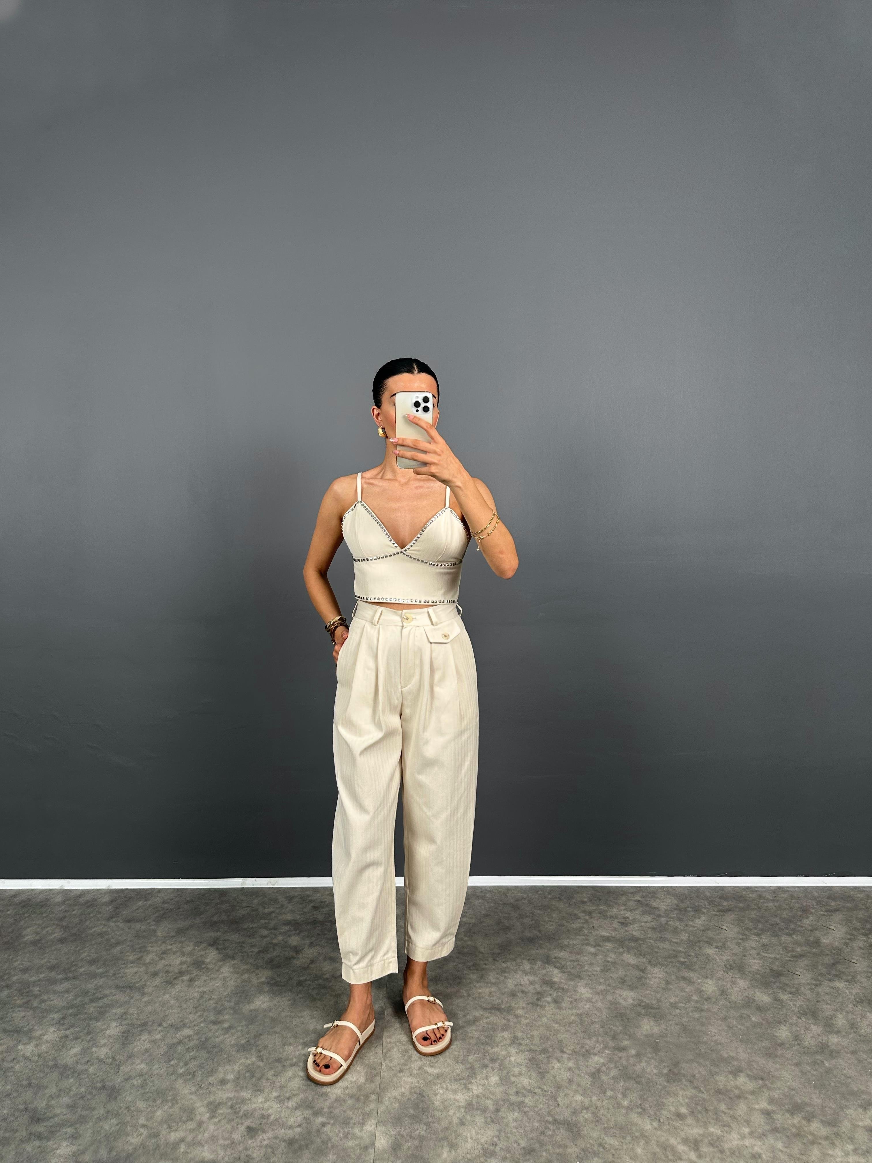Disy Krem Gabardin Dokuma Paça Detaylı Pantolon