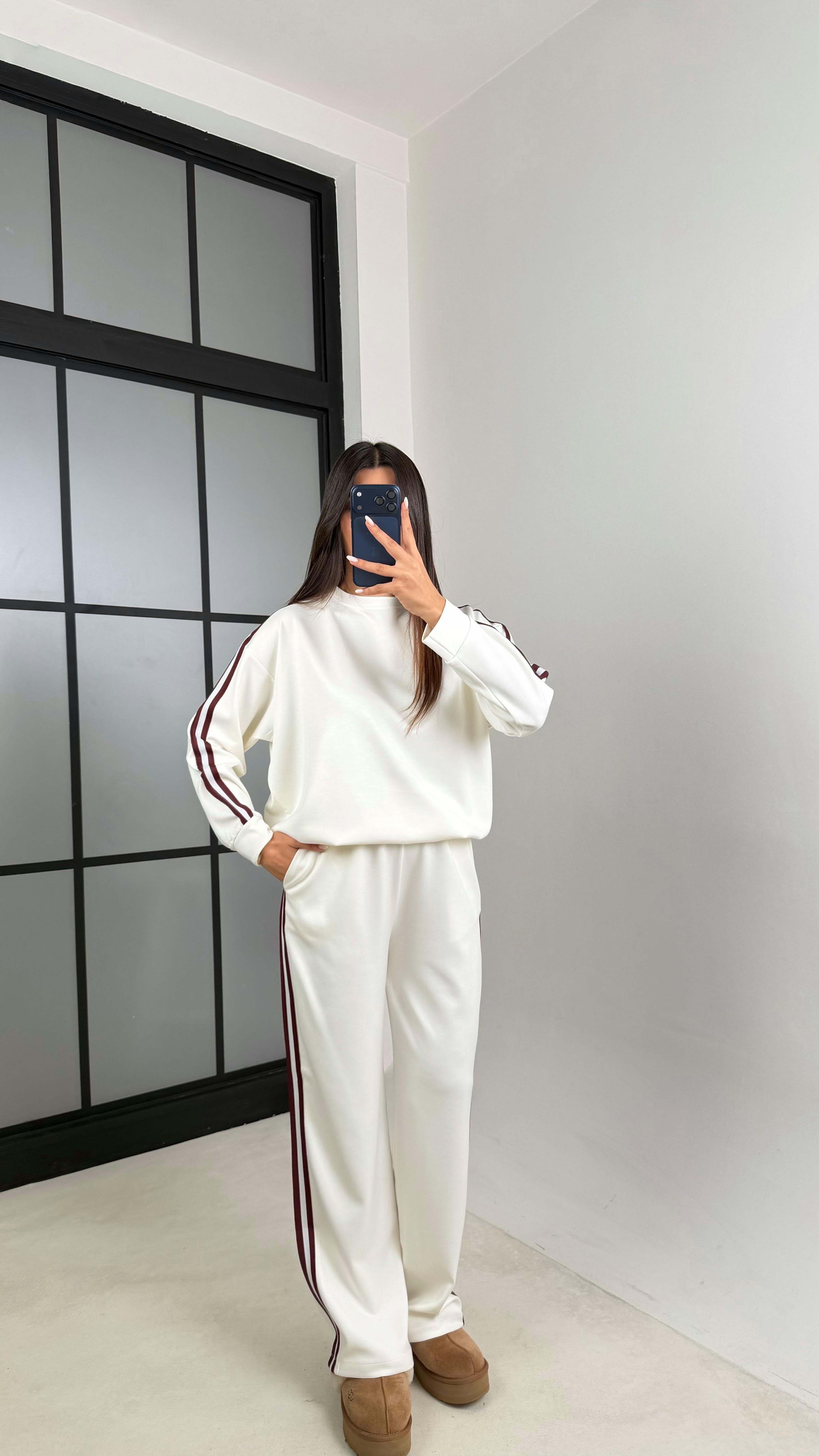 Ekru Şerit Detaylı Sweatshirt Beli Lastikli Eşofman İkili Modal Takım GAUS-00621
