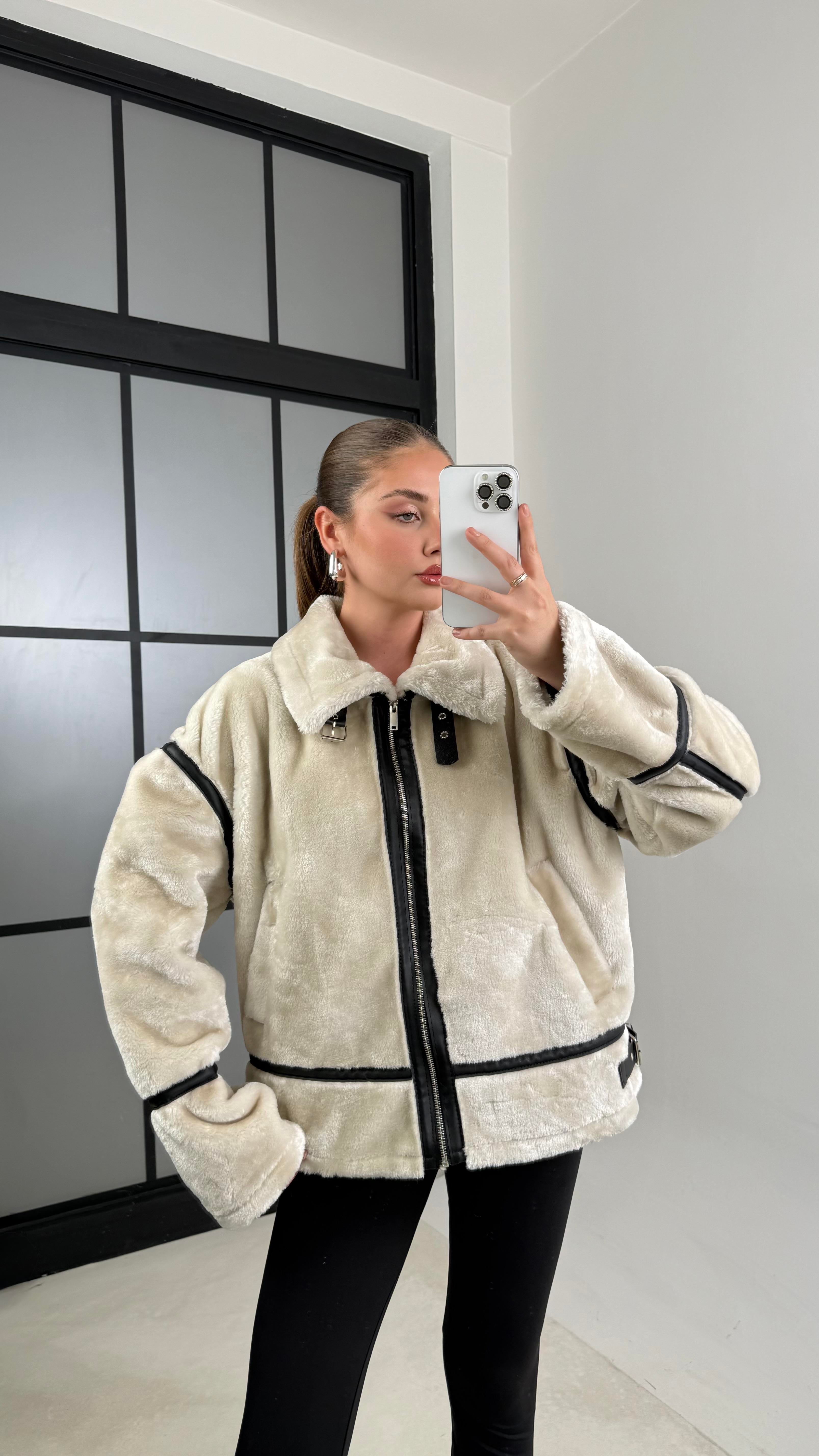 Ekru Tavşan Tüylü Görünümlü Yakalı Kürk Mont GAUS-00614GAUS الجواكيت GAUS-00614