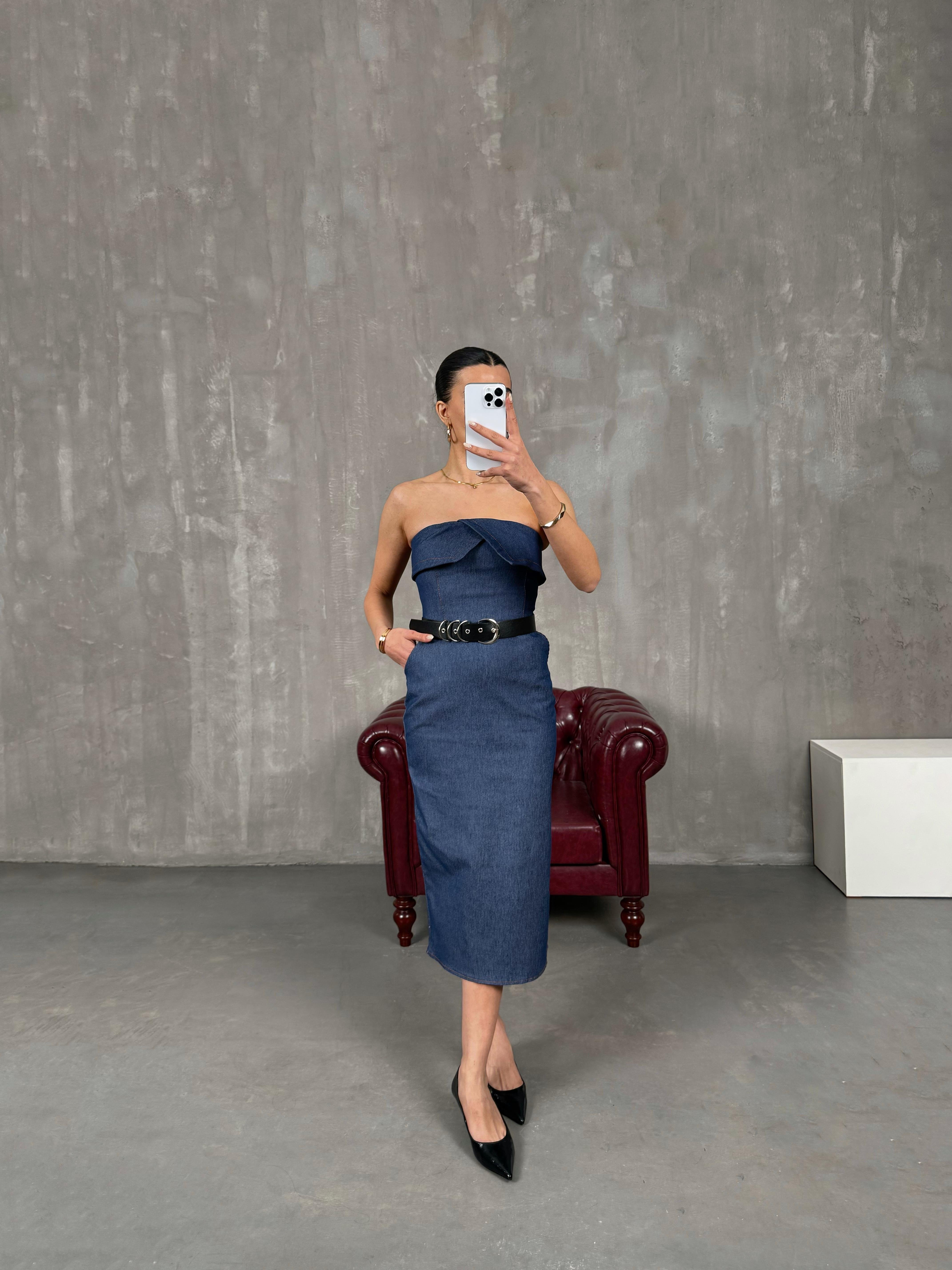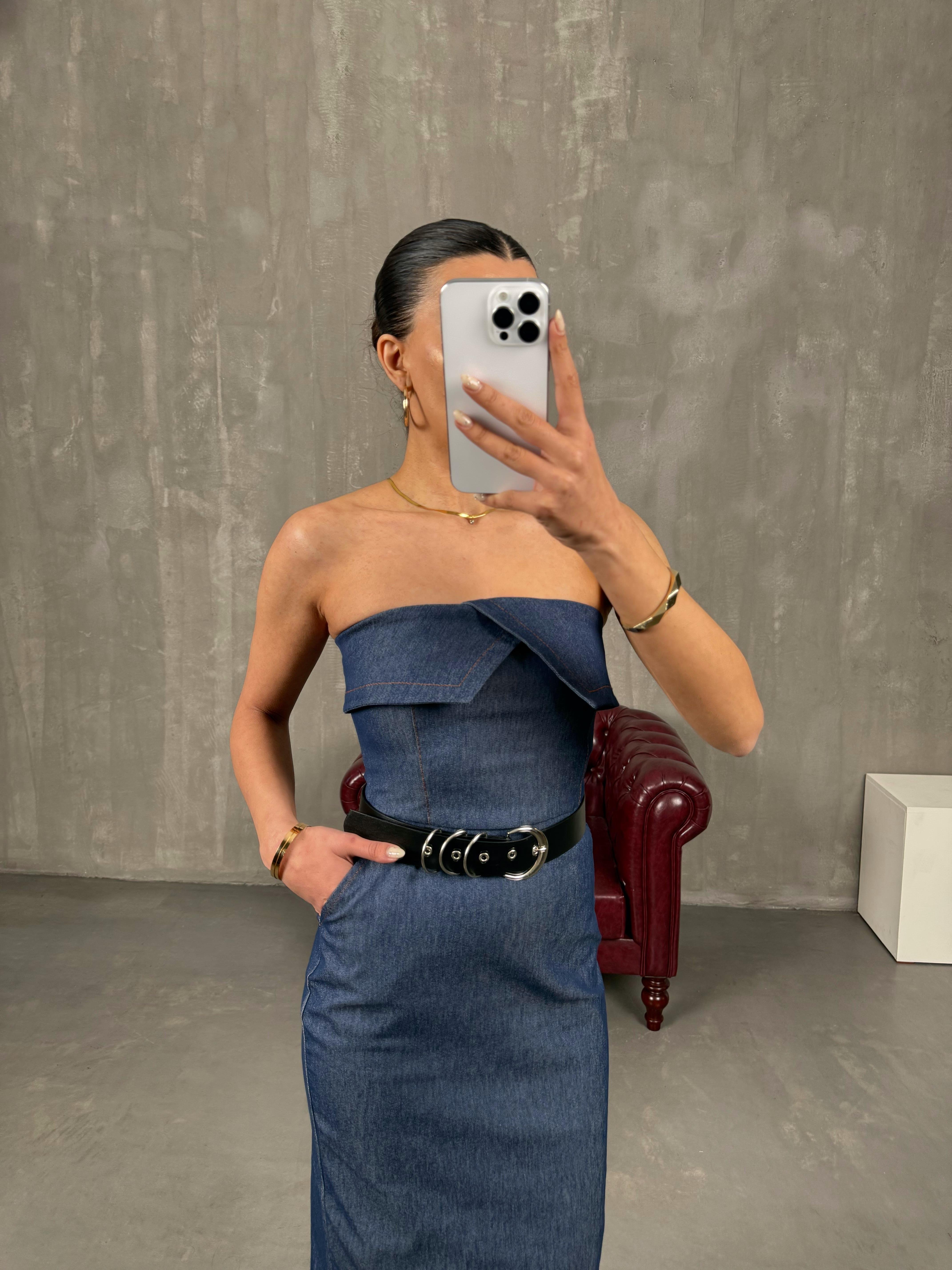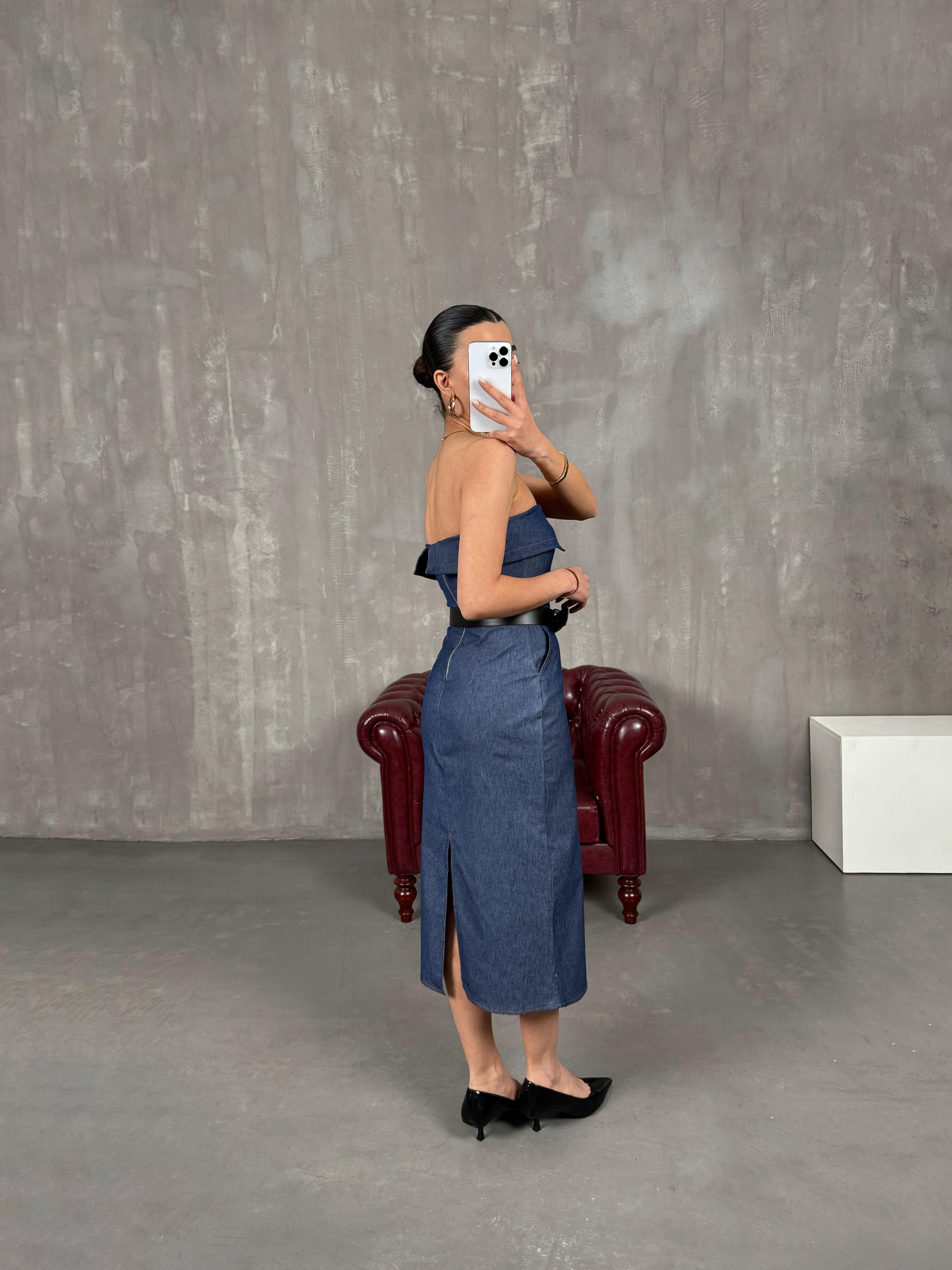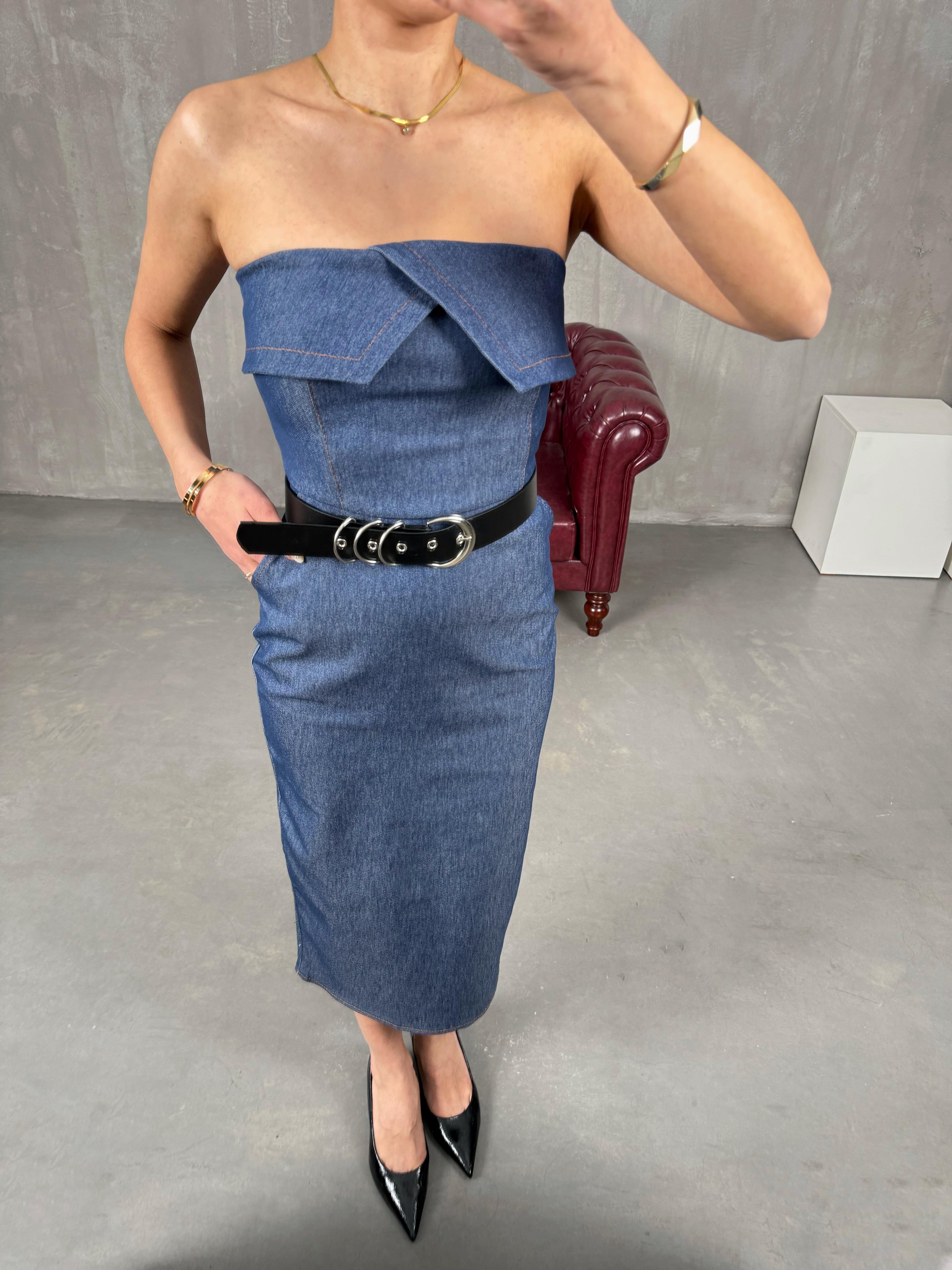 إليتا فستان دينيم تينسيل أزرق مع حزام بدون حمالات