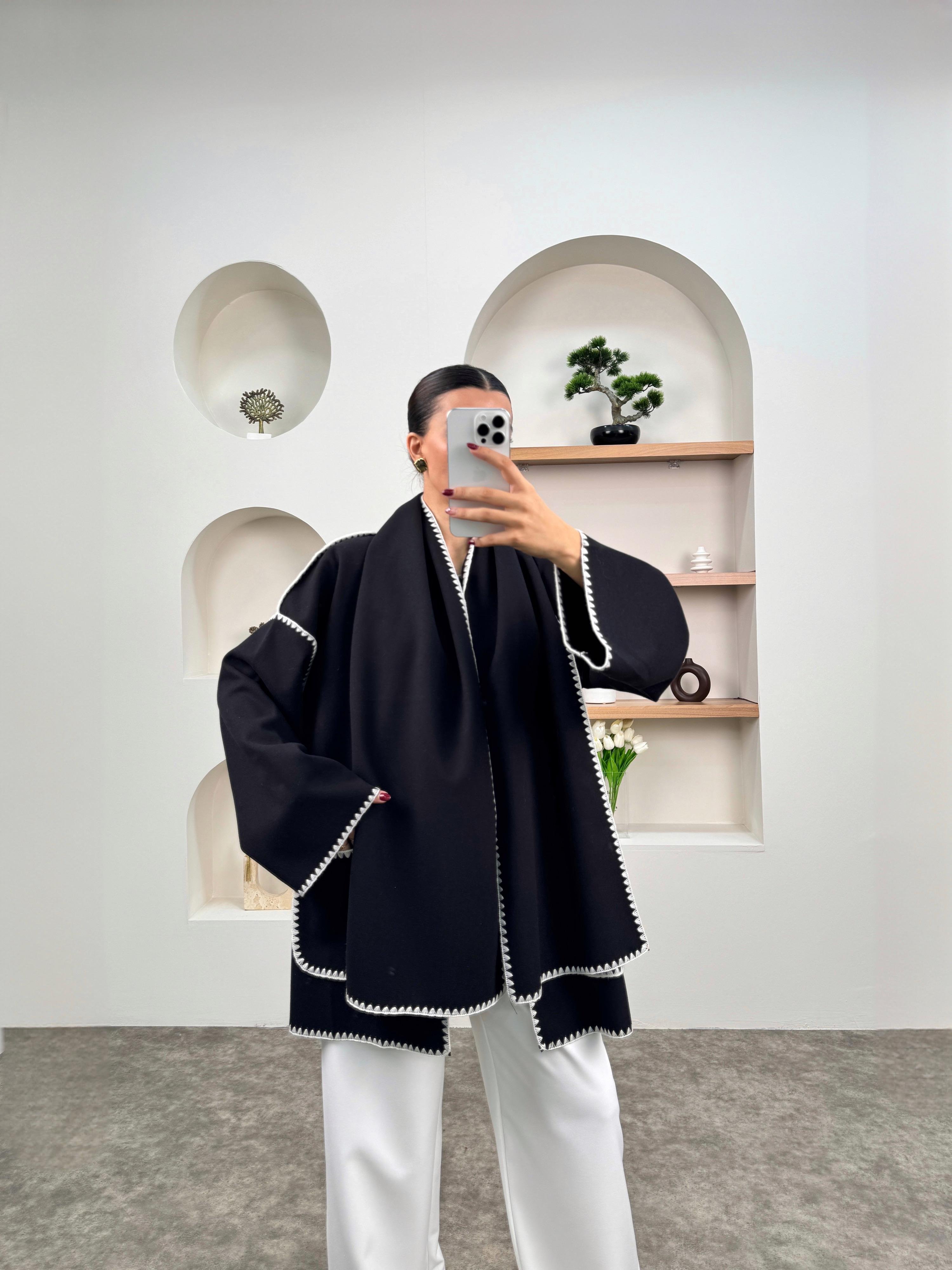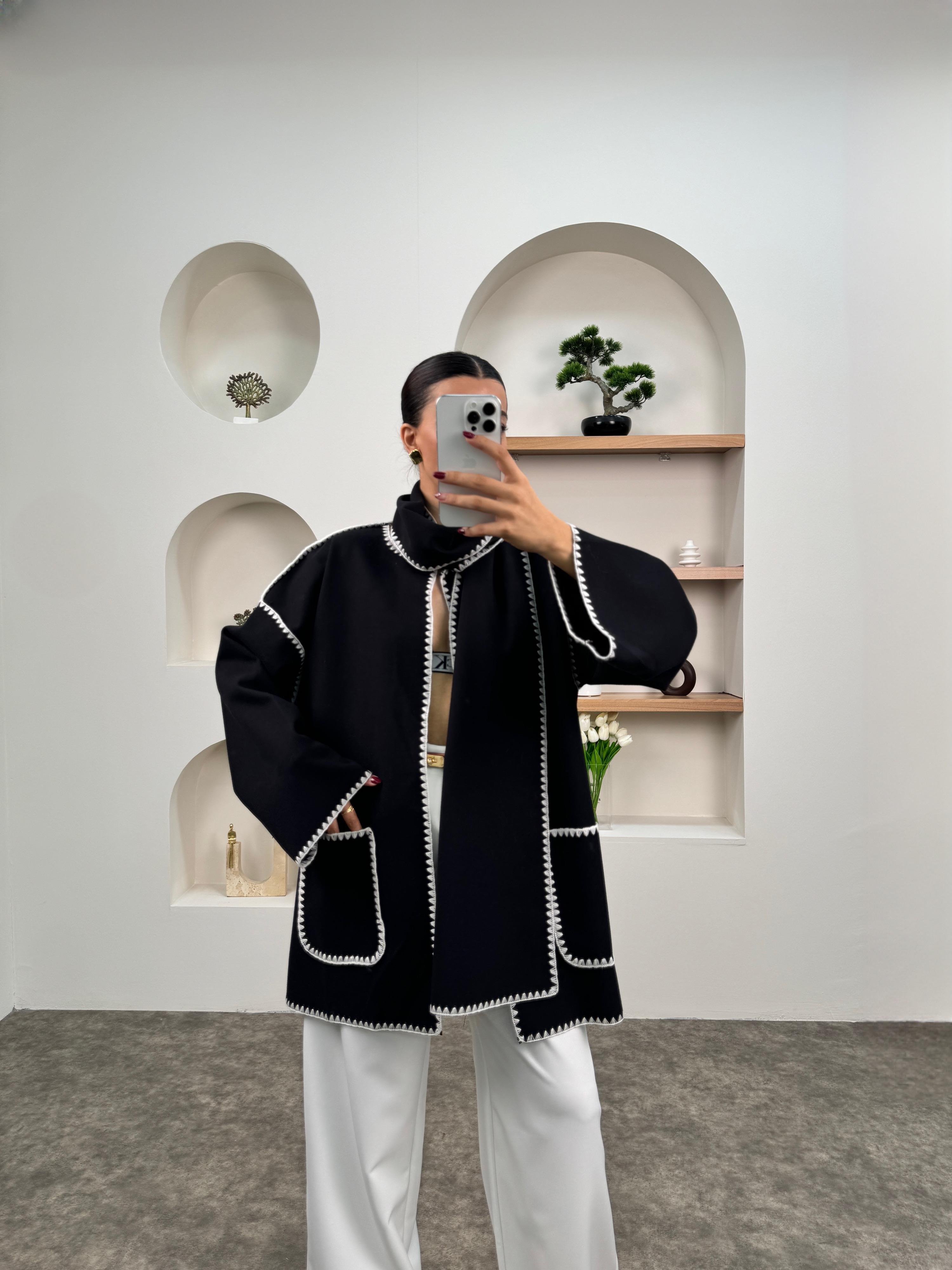Elos Siyah Beyaz İşlemeli Cepli Atkı Detaylı  Ceket