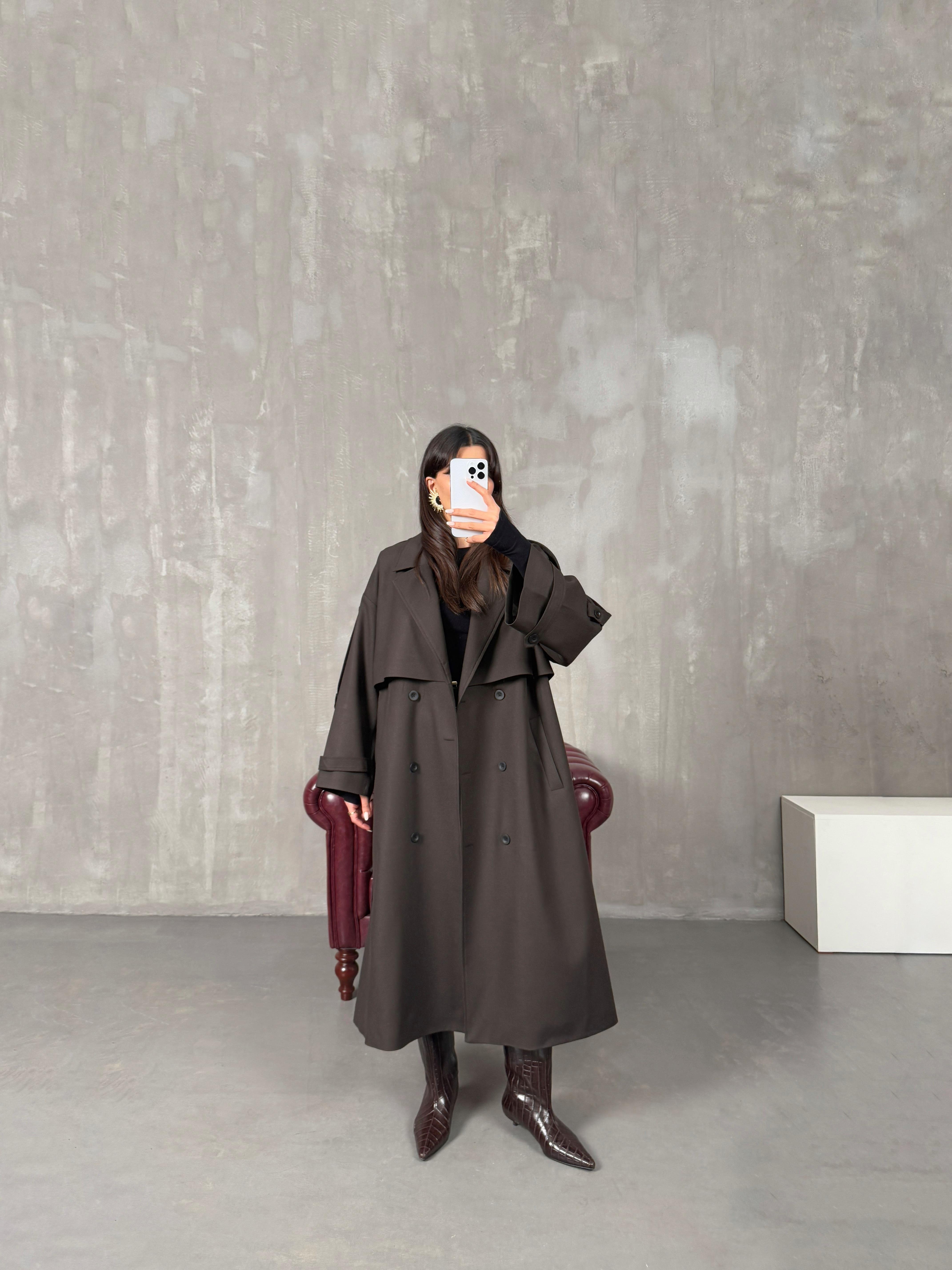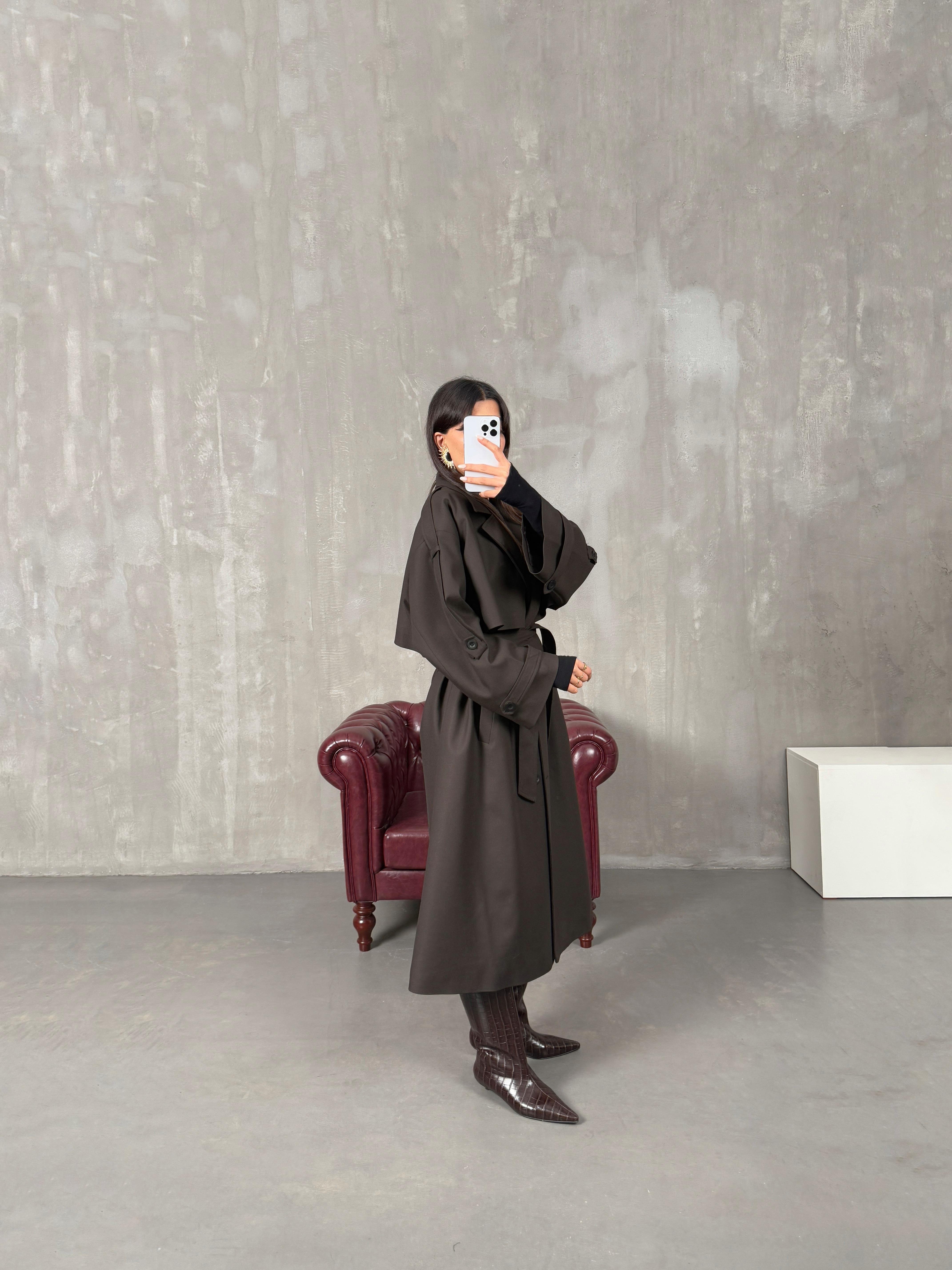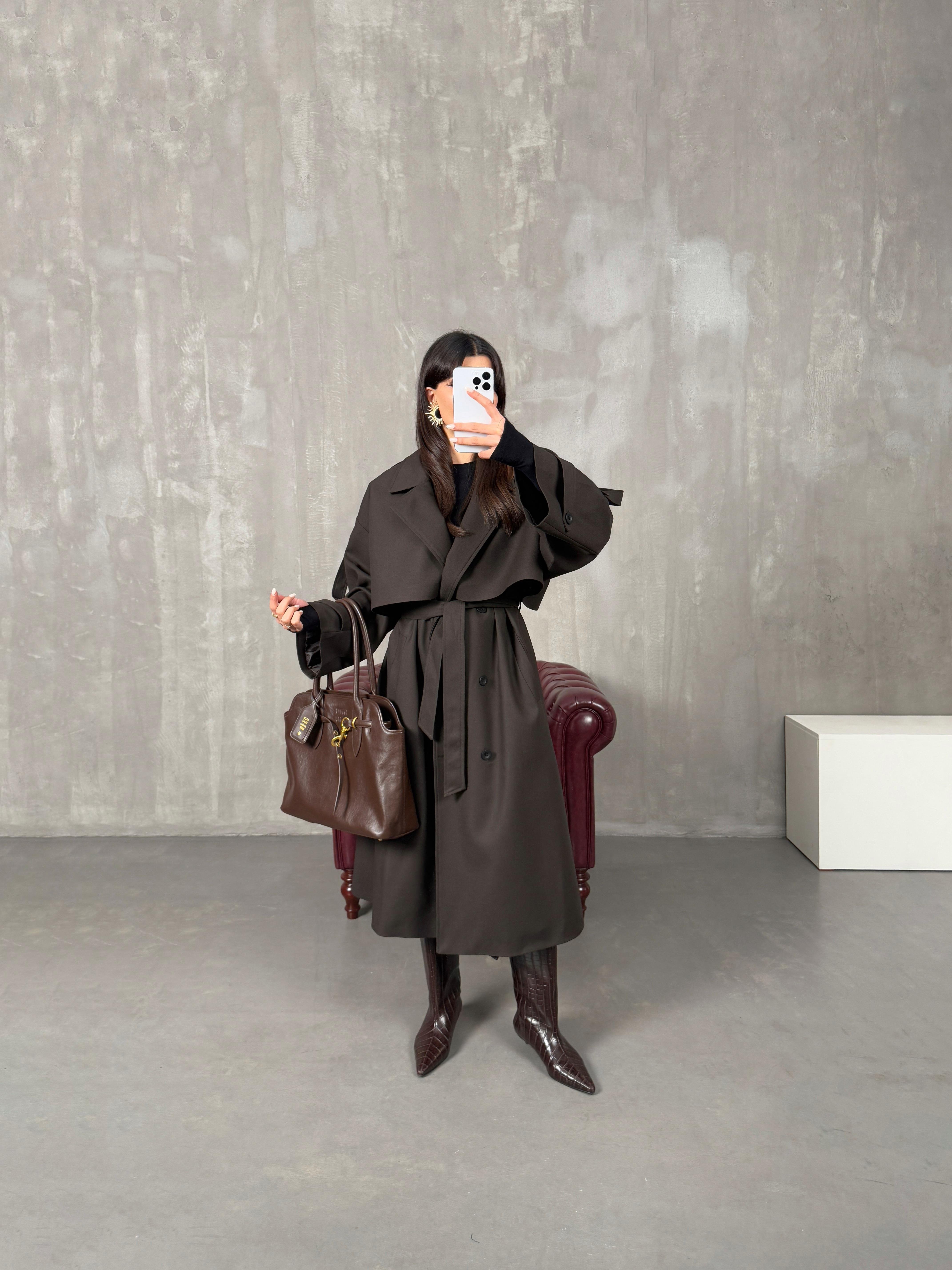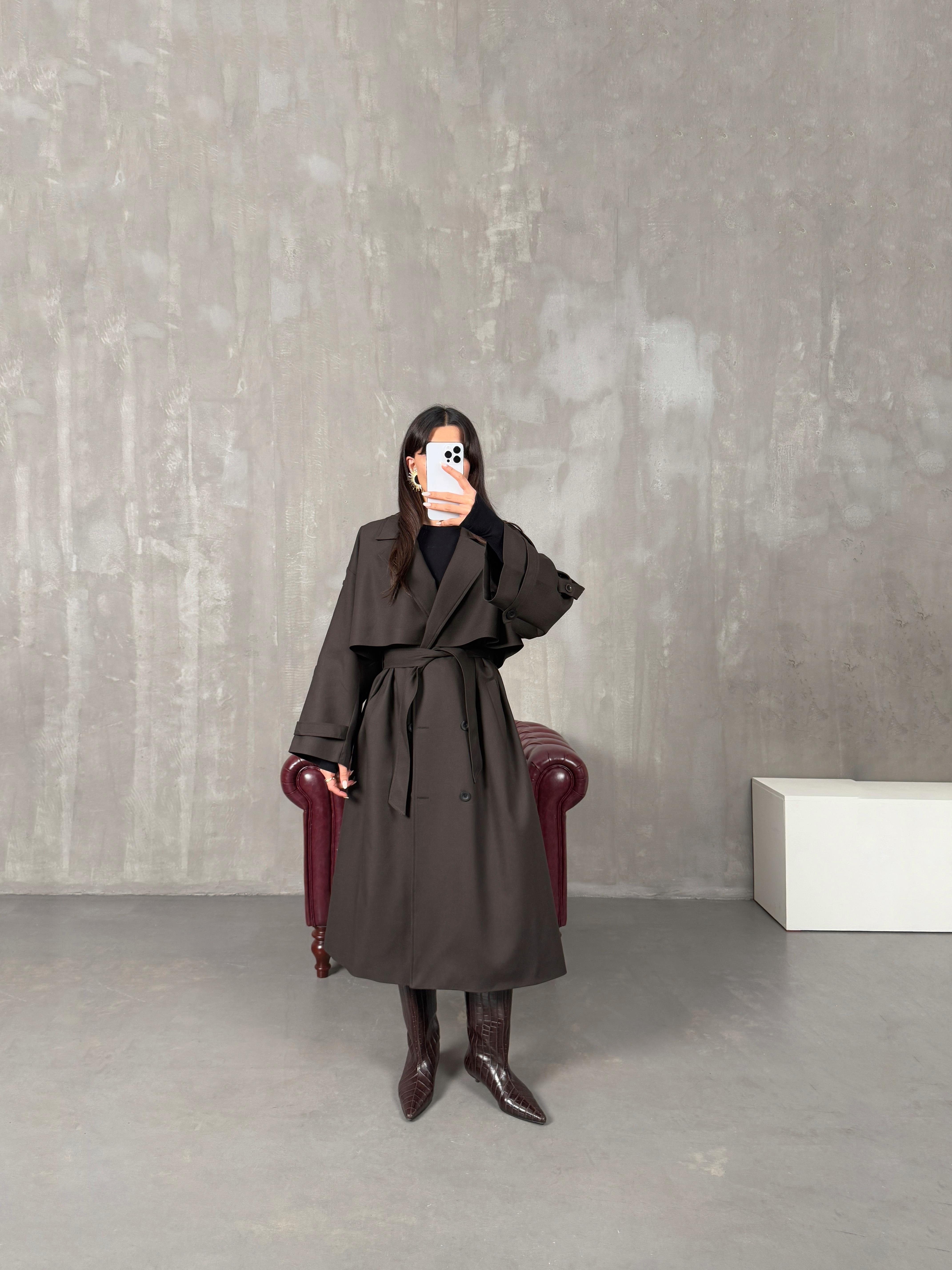 Elsa Acı Kahve Kuşaklı Poliviskon Astarlı Tasarım Premium Trençkot