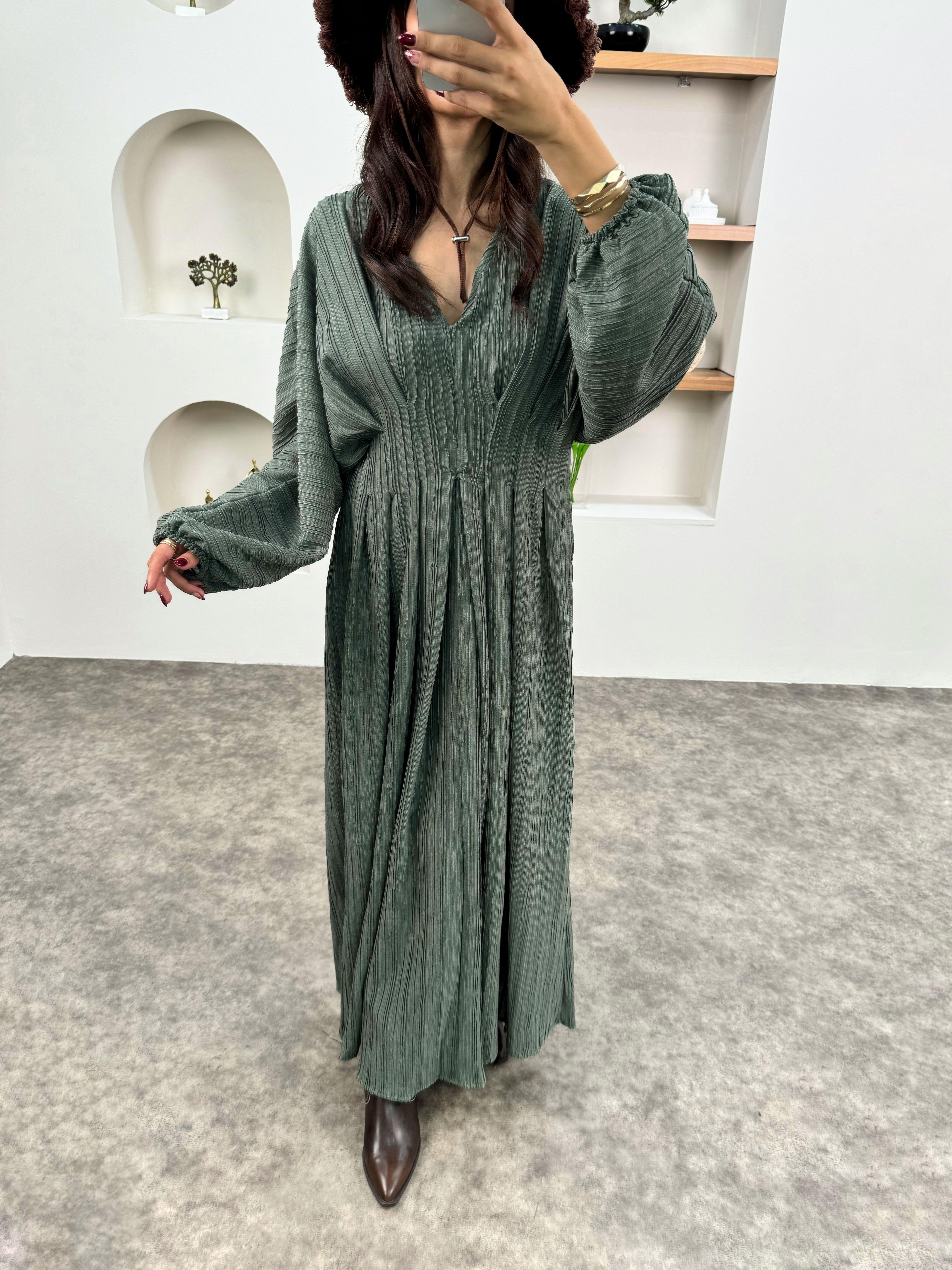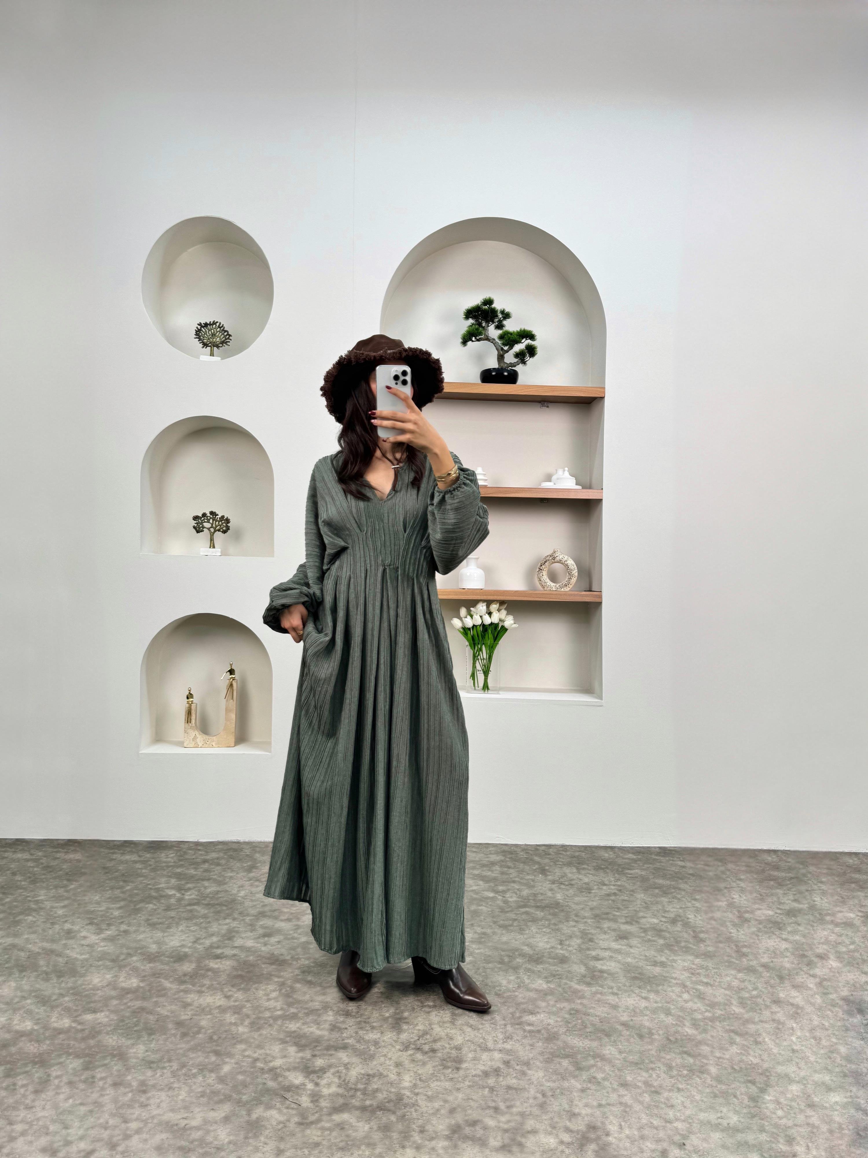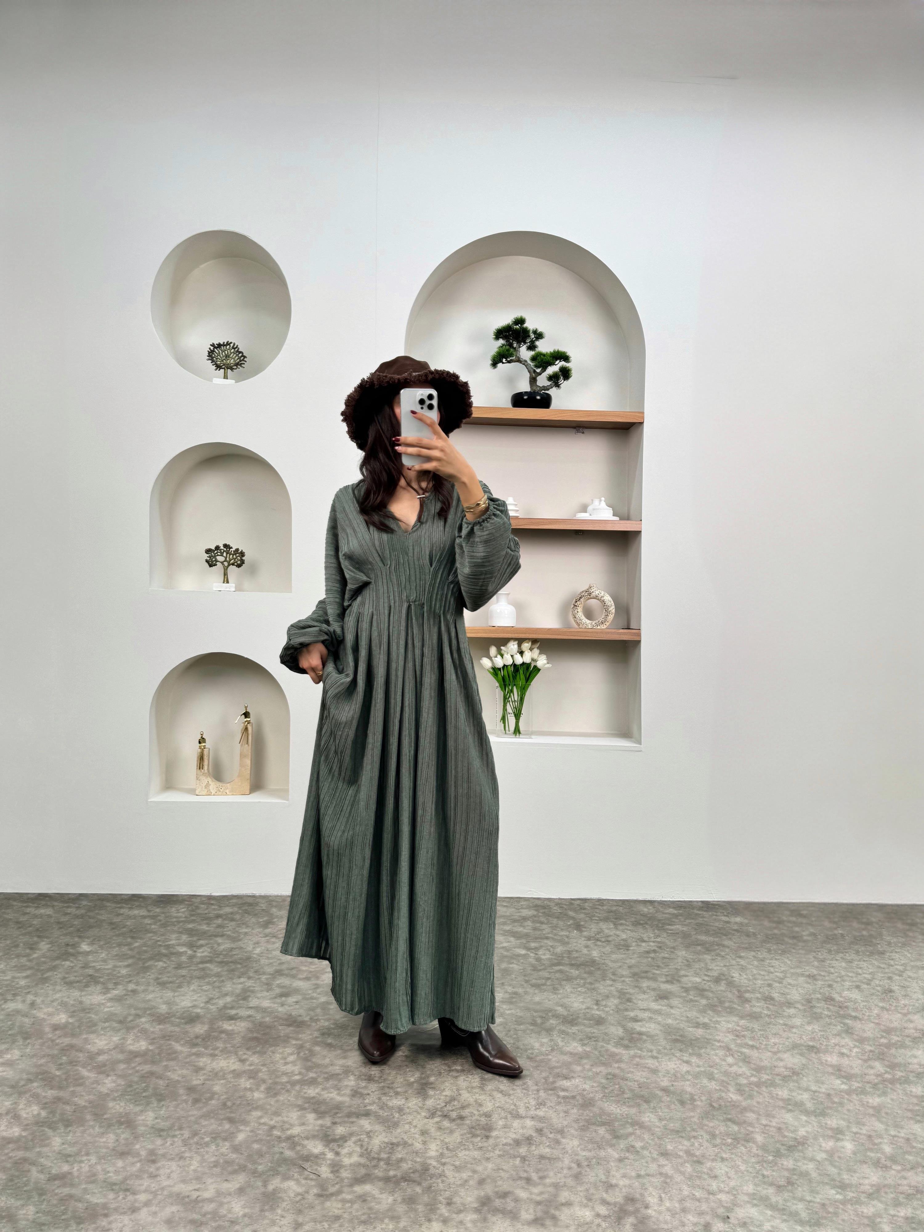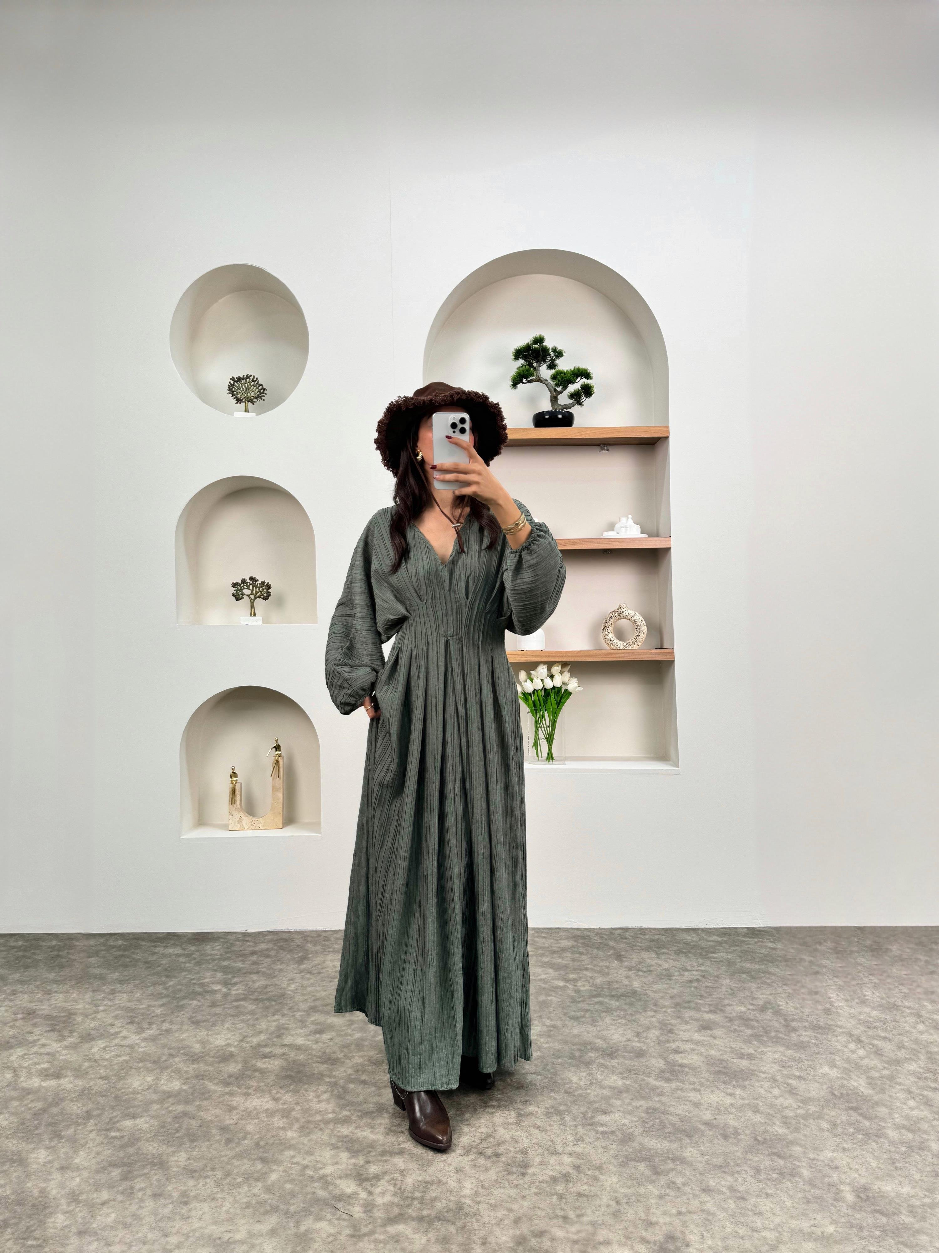 Emily Haki V Yaka Beli Büzgülü Raşel Kumaş Elbise
