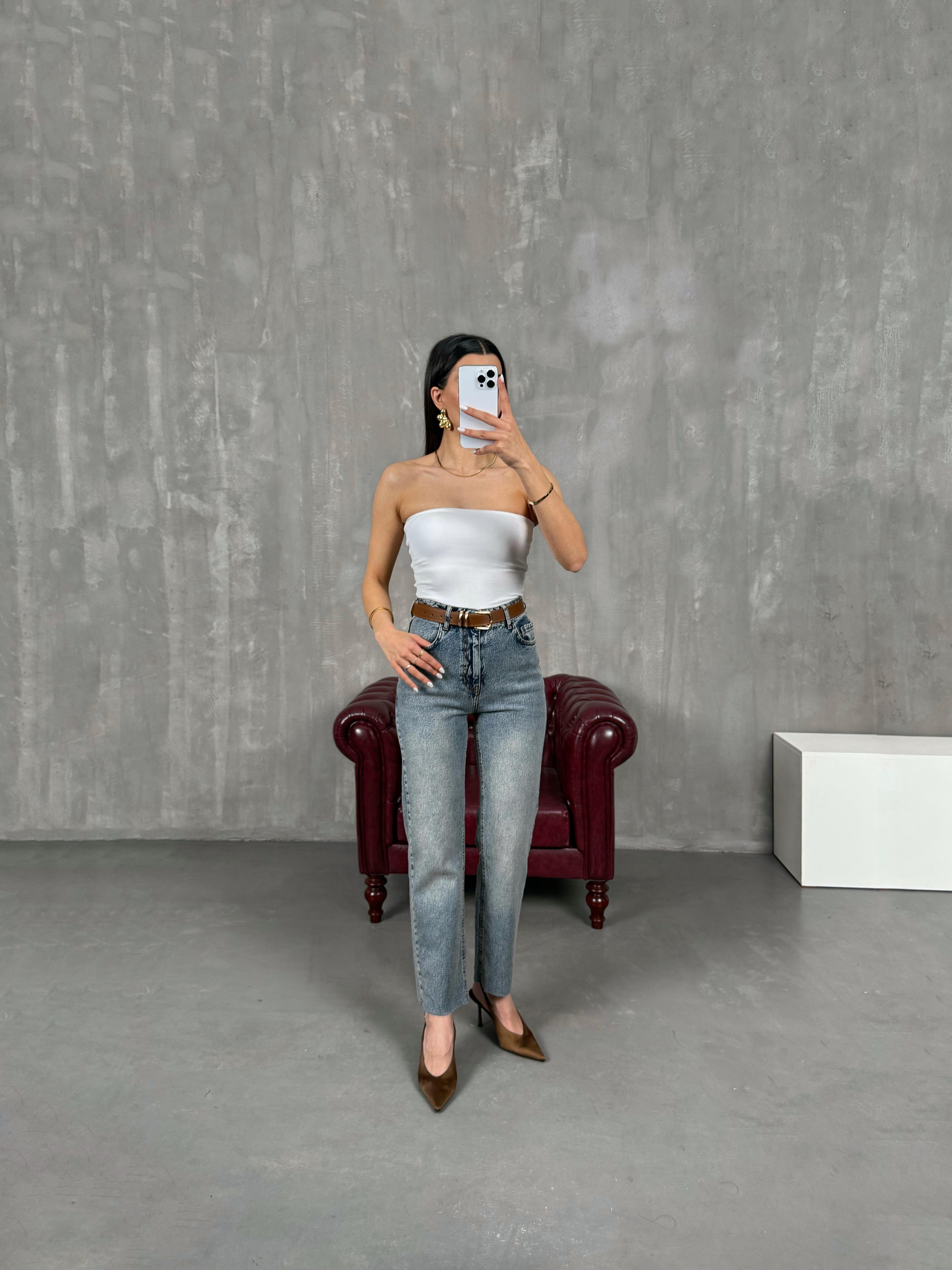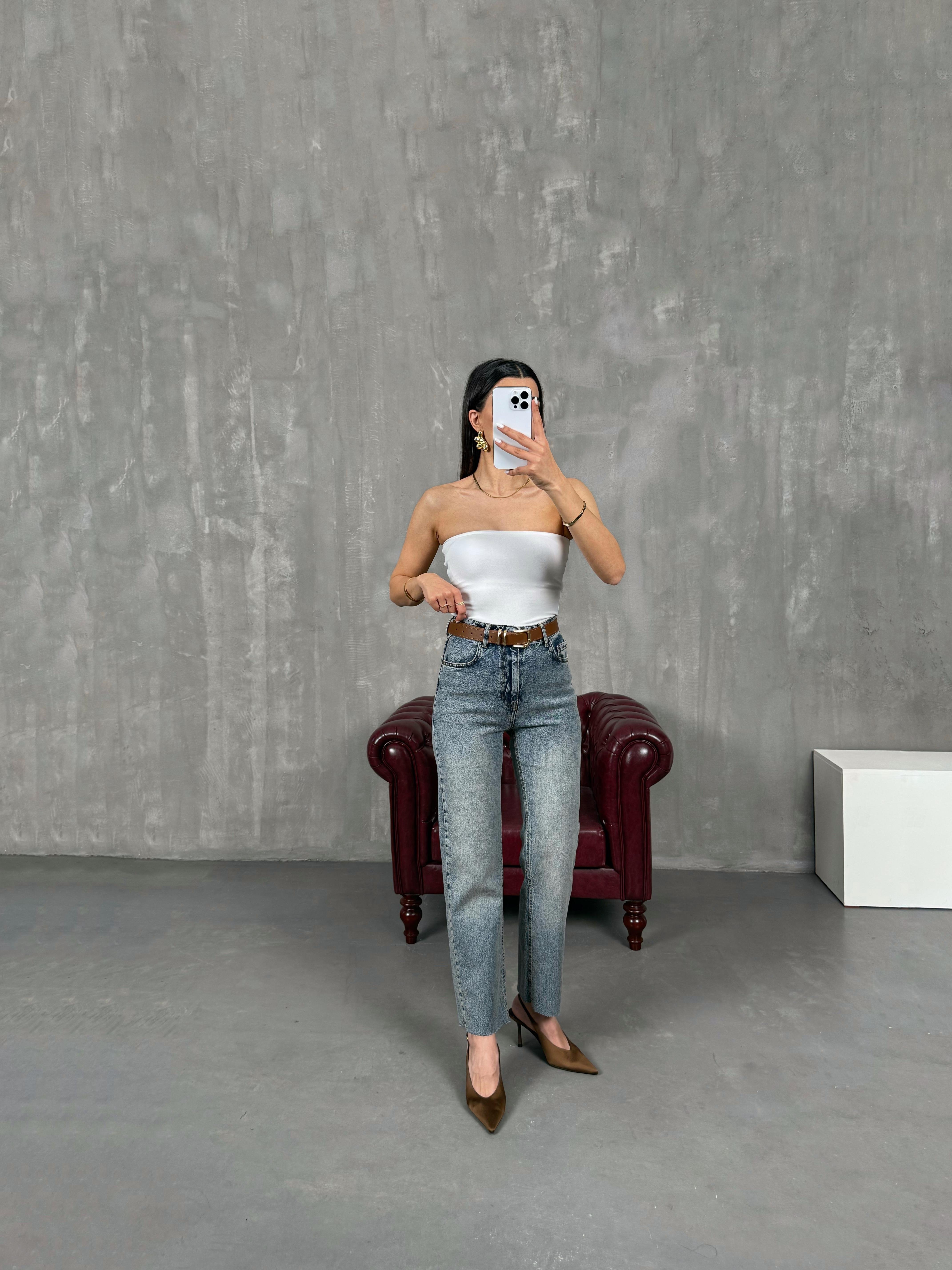 Eris Koyu Mavi Kemerli Kesik Paça Jean