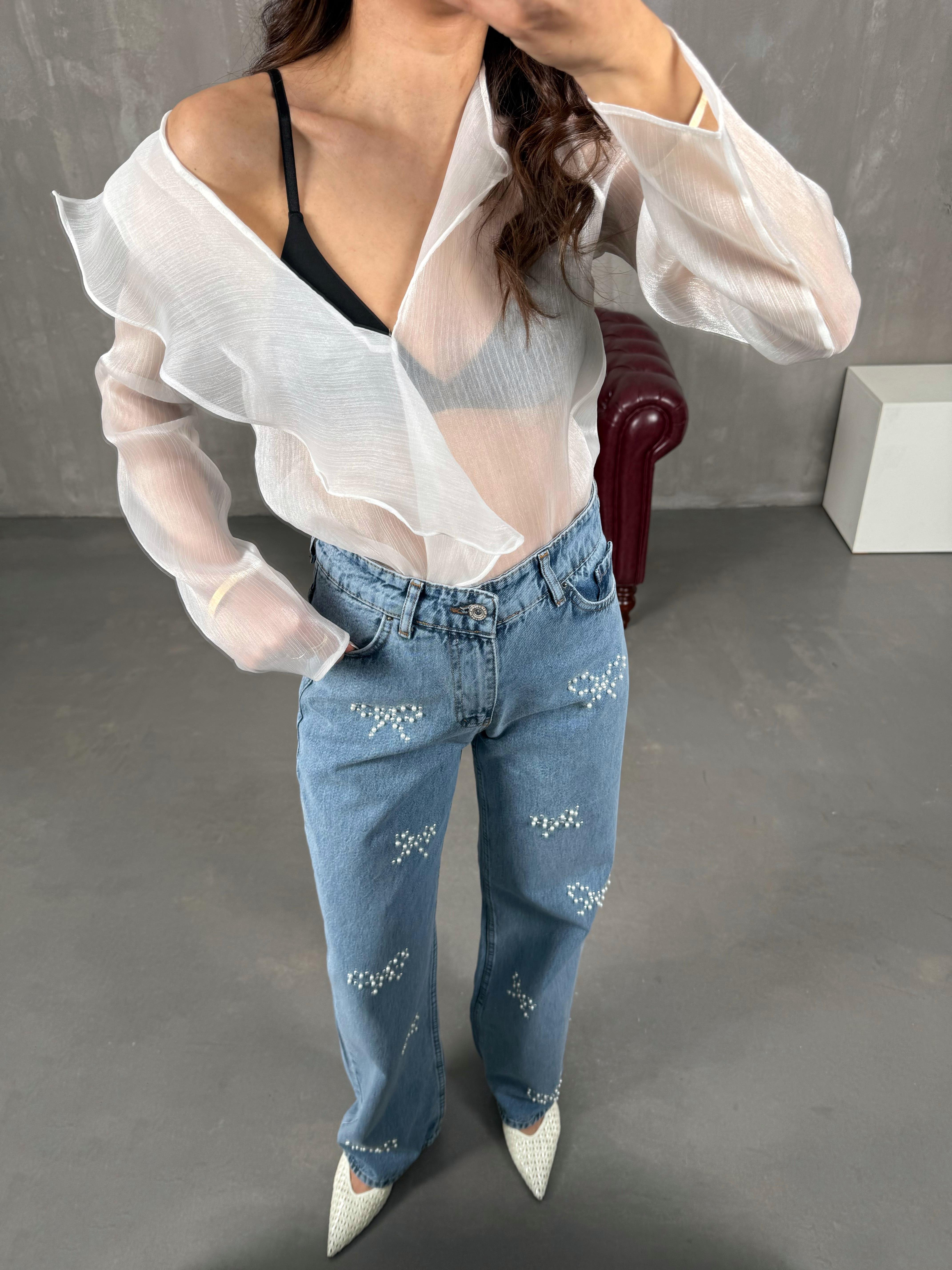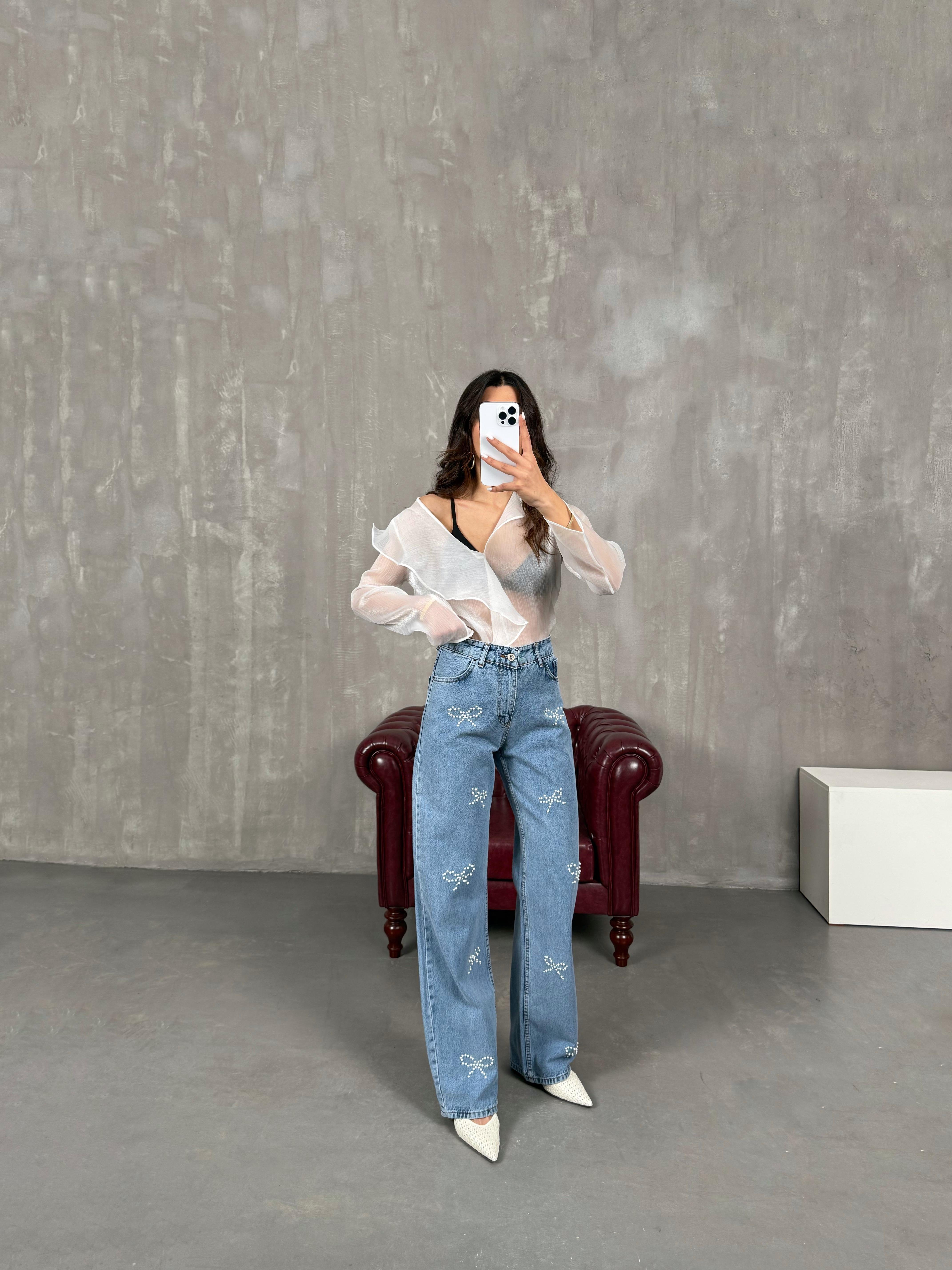 إيزي جينز أزرق مع تفاصيل فيونكة لؤلؤية