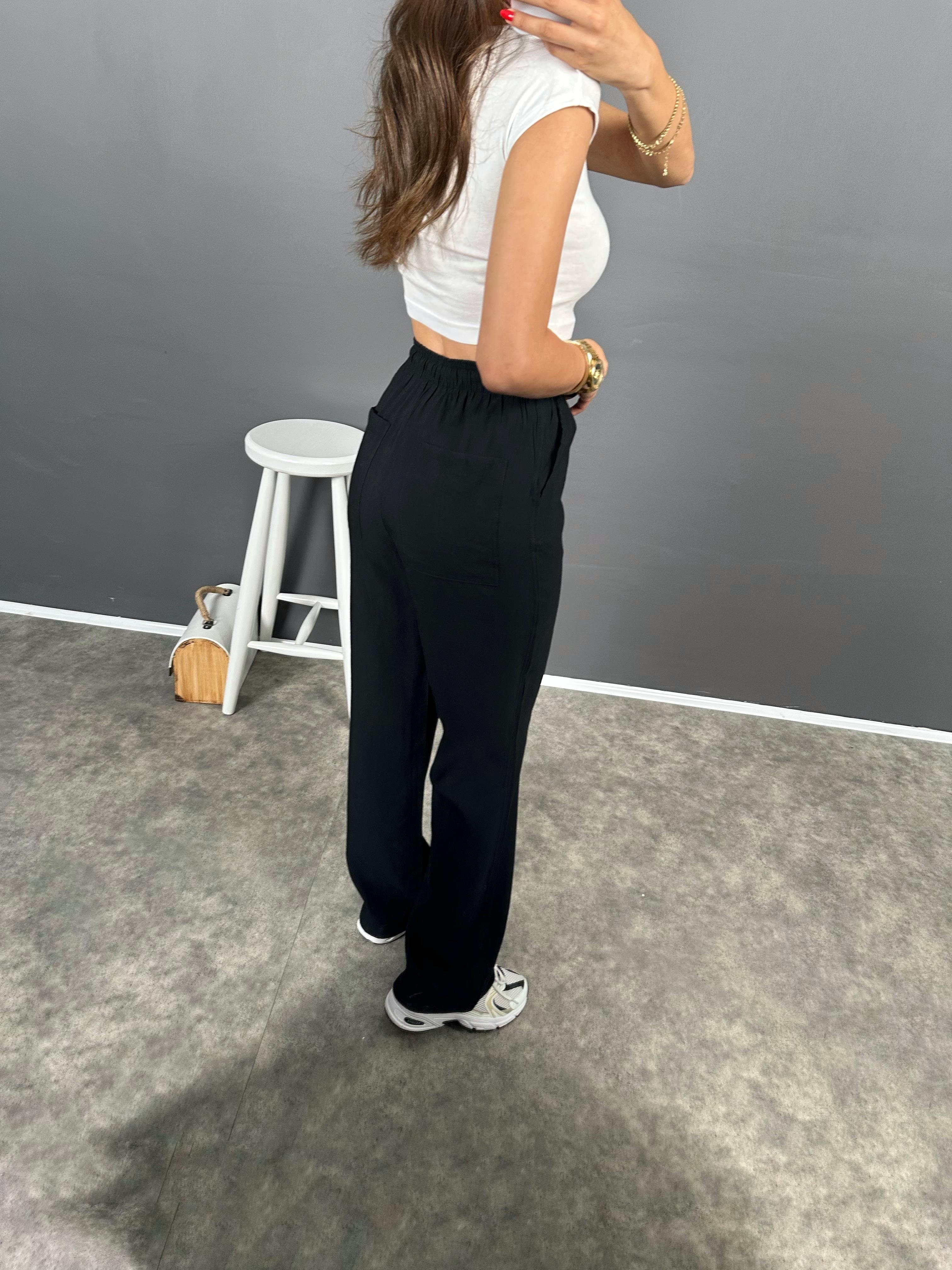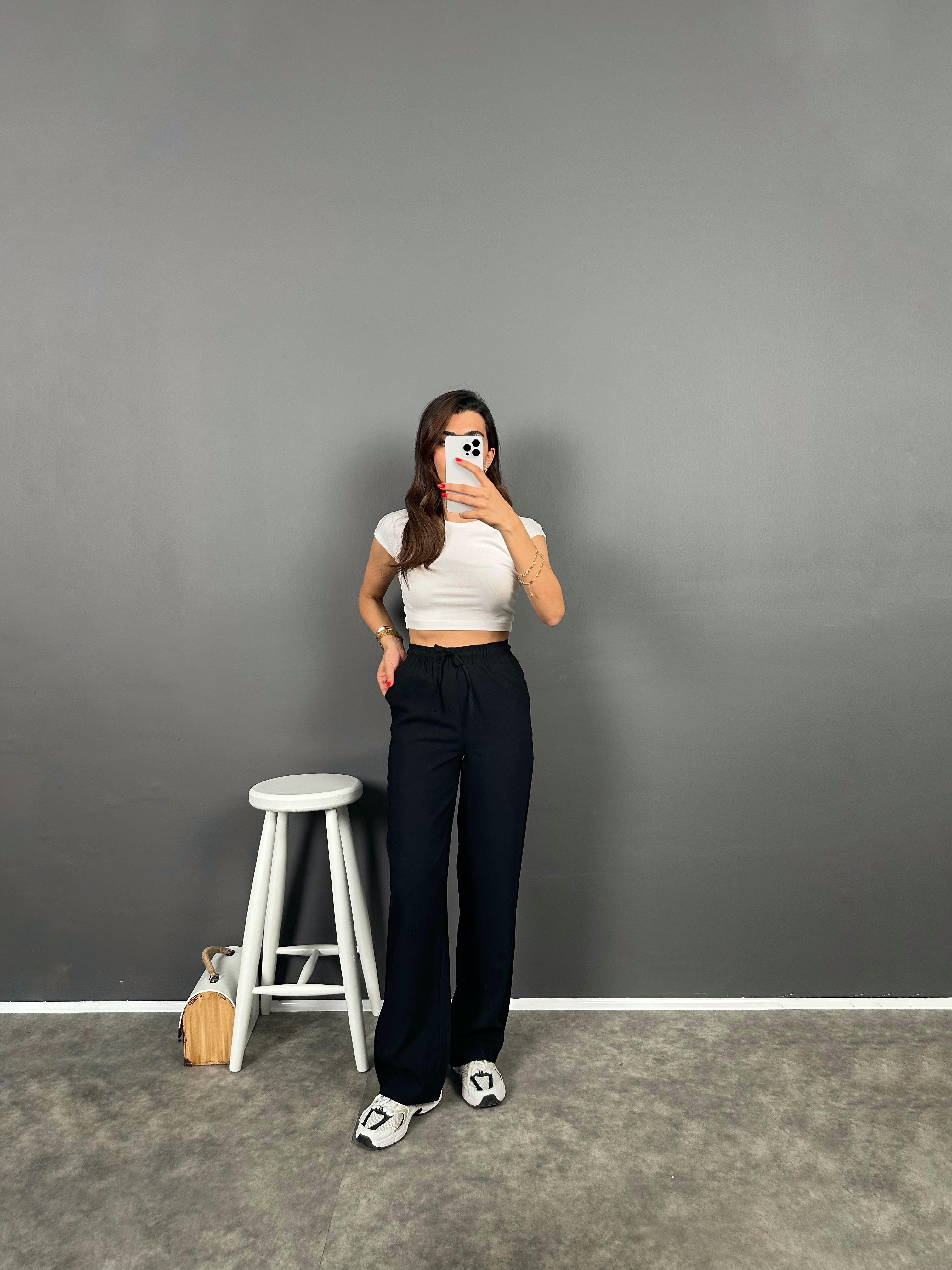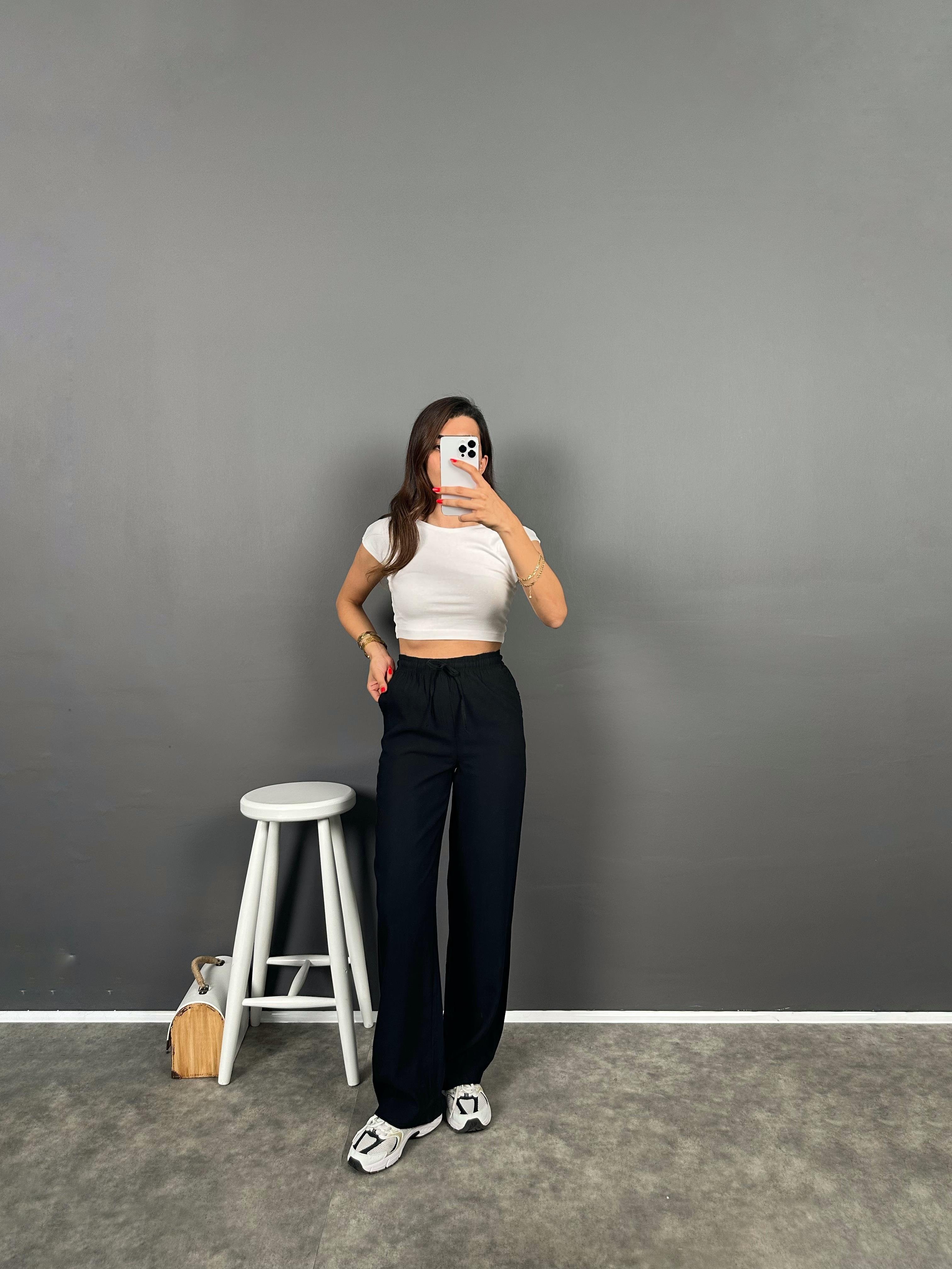 Flay Siyah İthal Kumaş ZR Model Bel Bağlamalı Rahat Pantolon