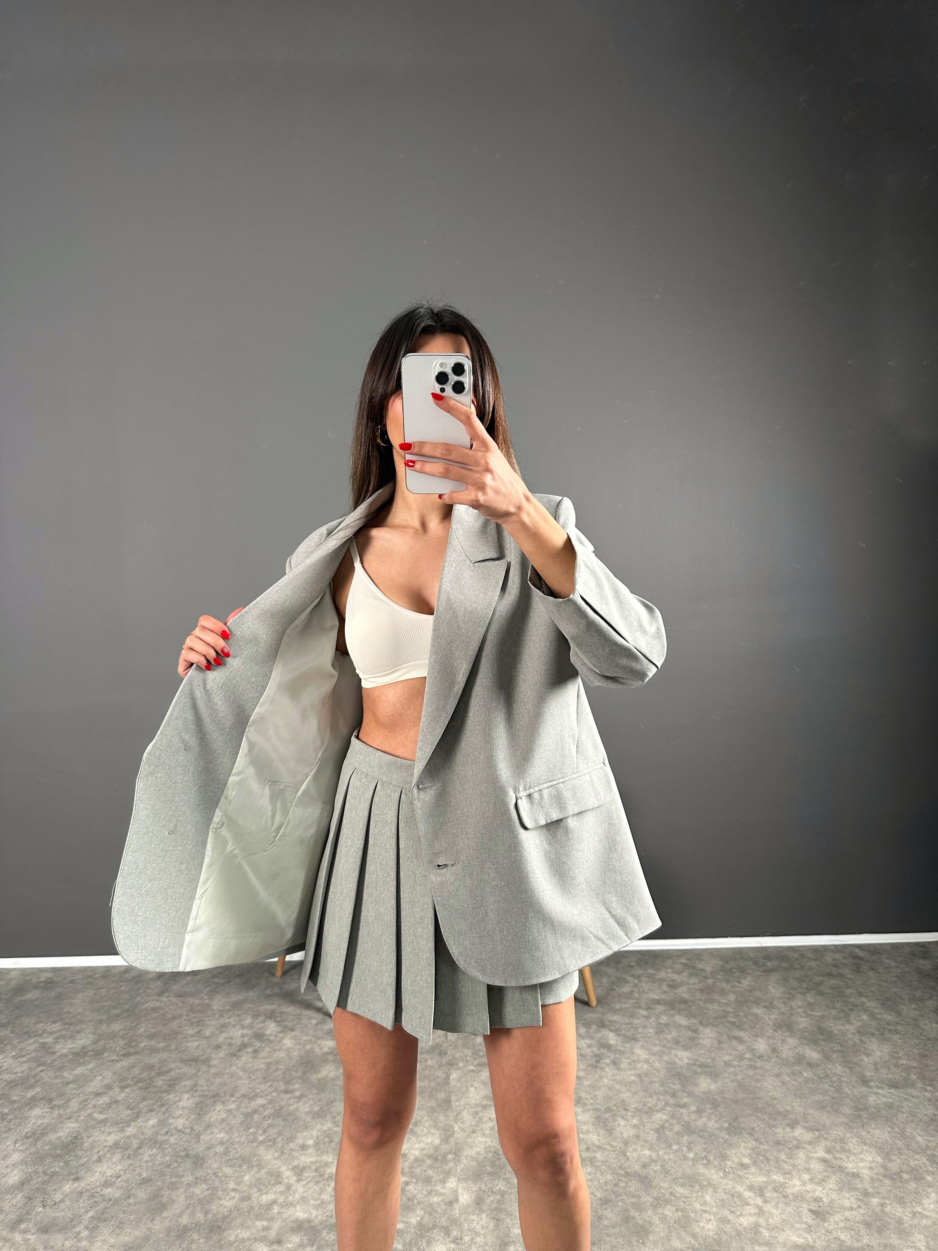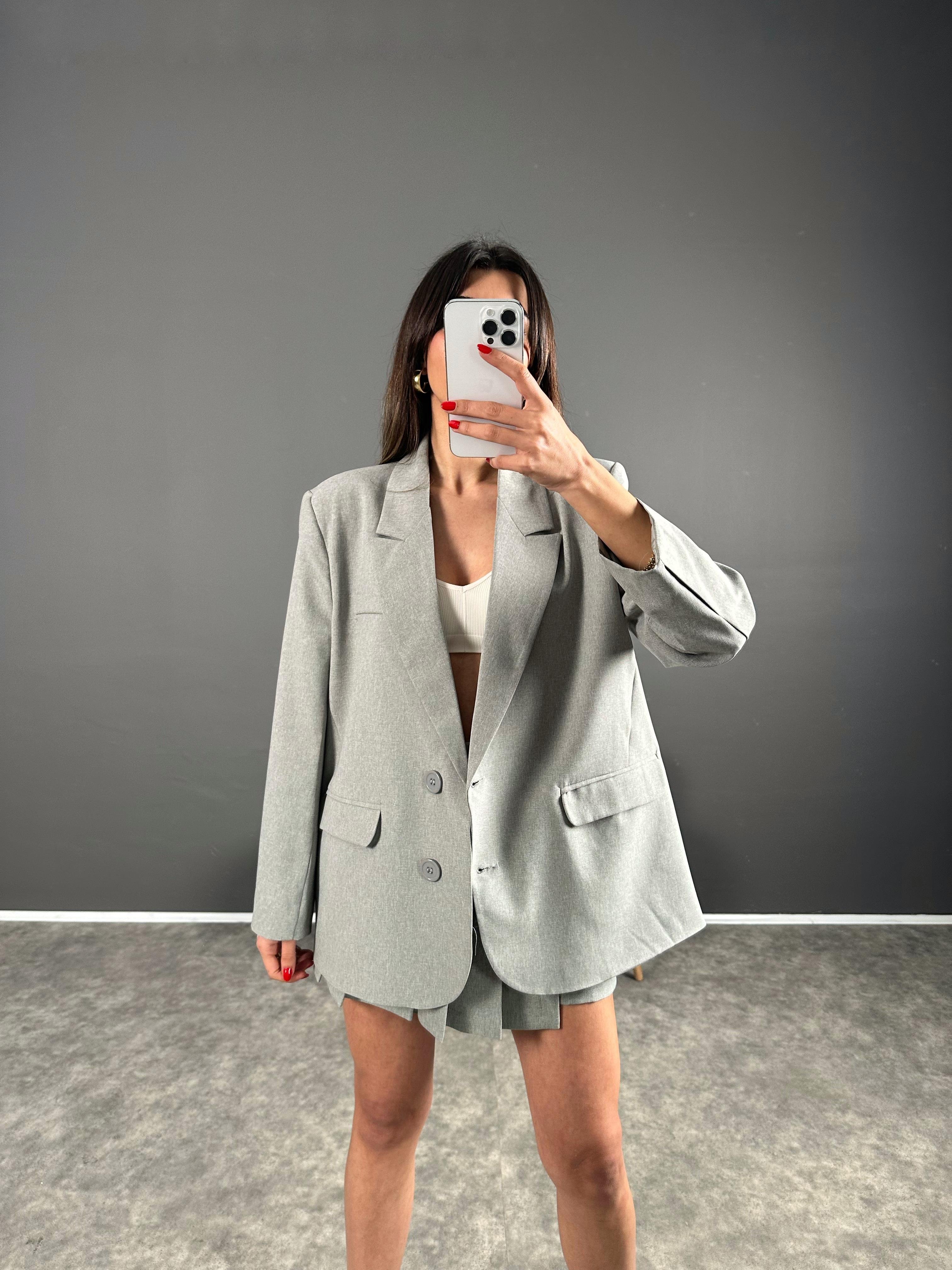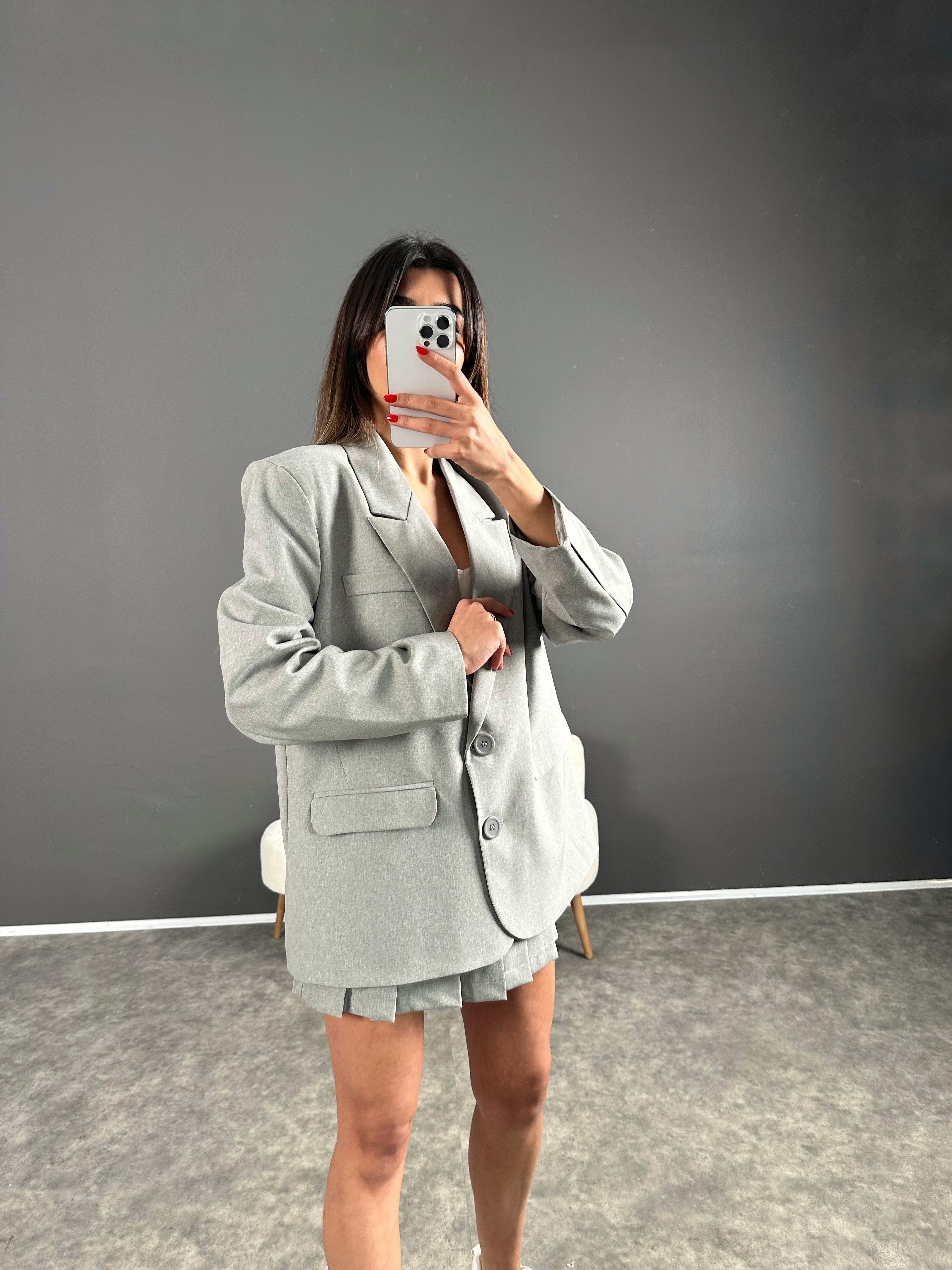 Gri Sırt Baskılı Oversize Blazer Ceket