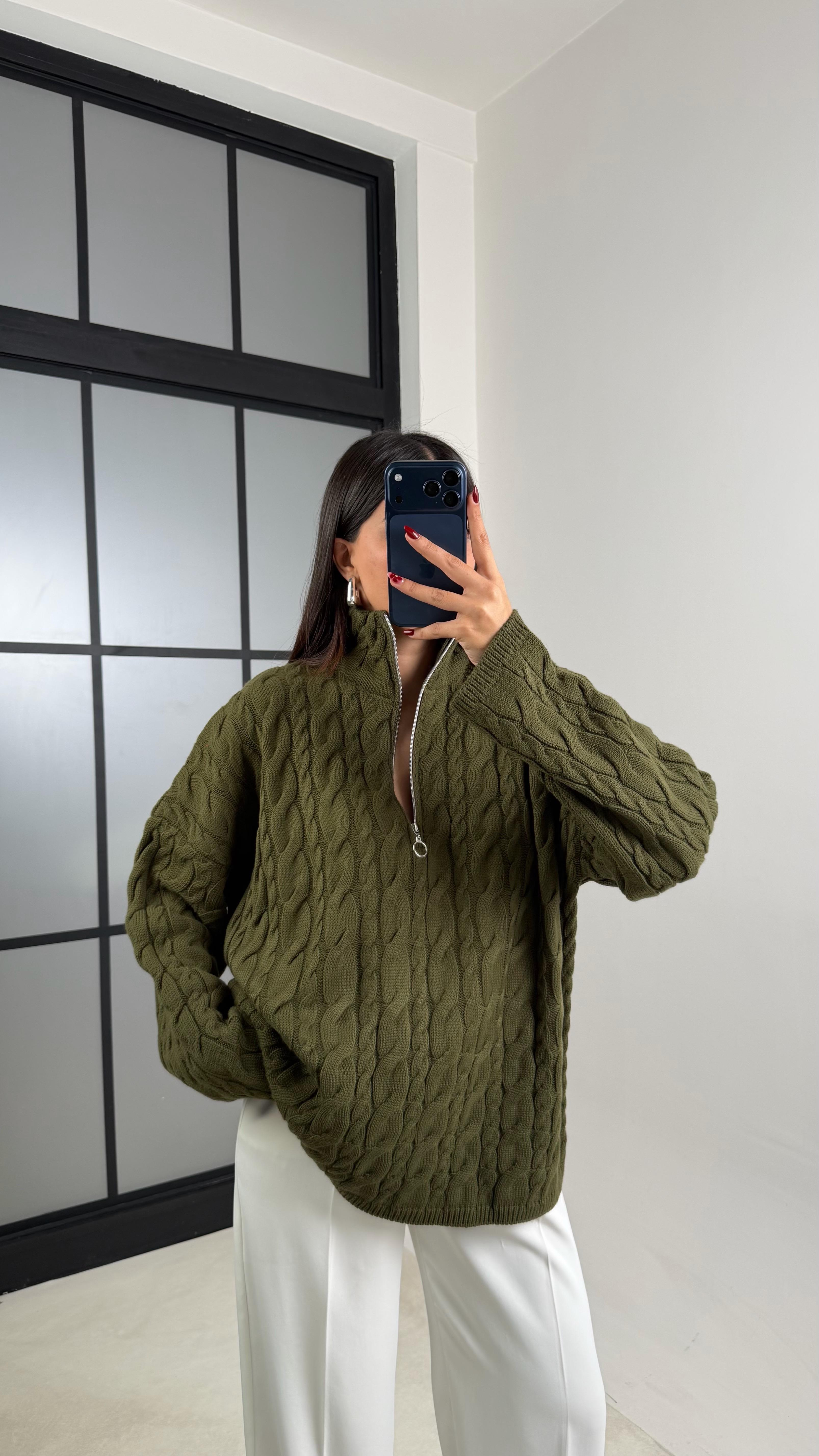 Haki Fermuarlı Örgü Kazak GAUS-00213