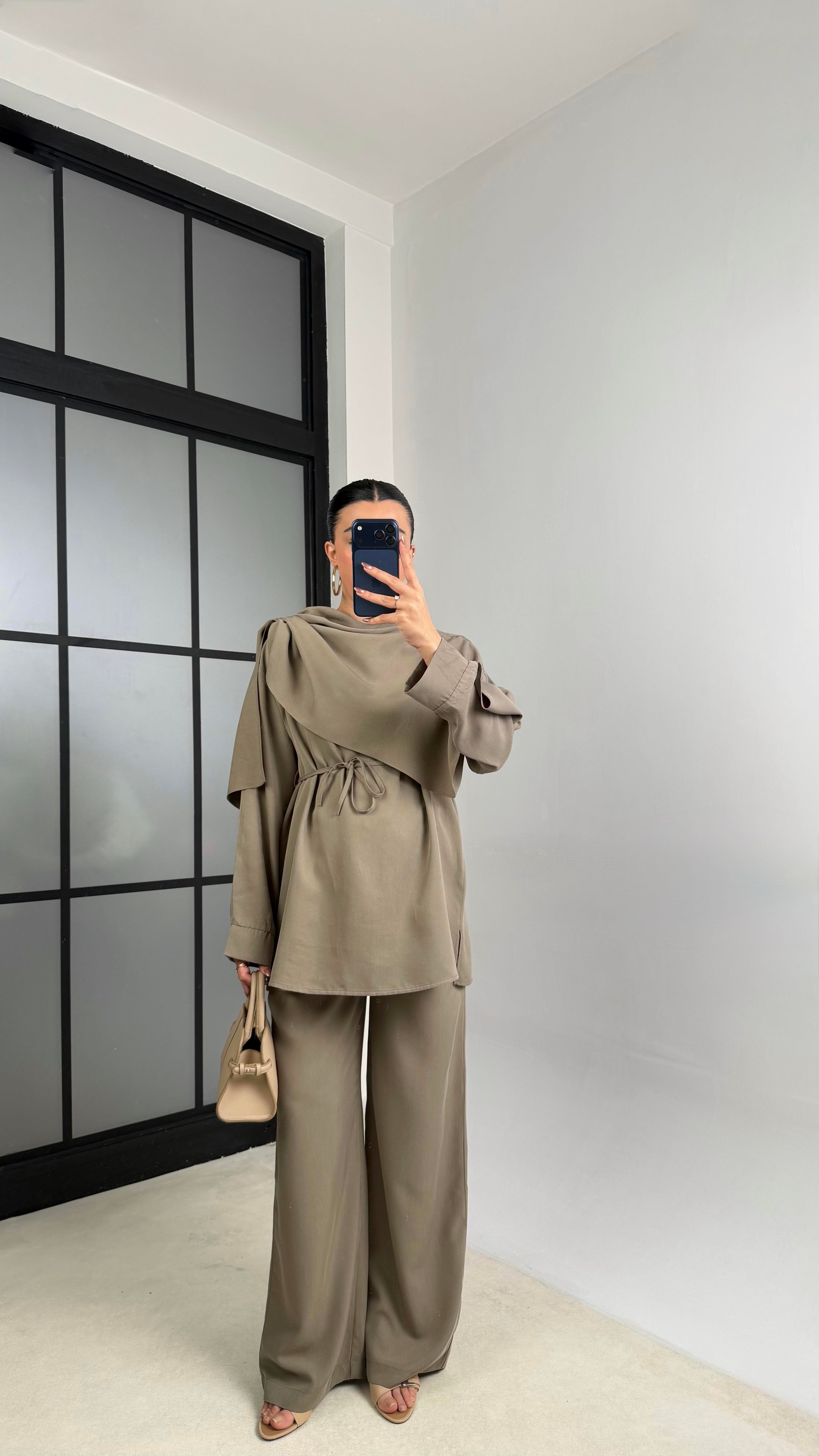 Haki Şal Detaylı Belden Kuşaklı Beli Lastikli İthal Kumaş İkili Takım GAUS-01154