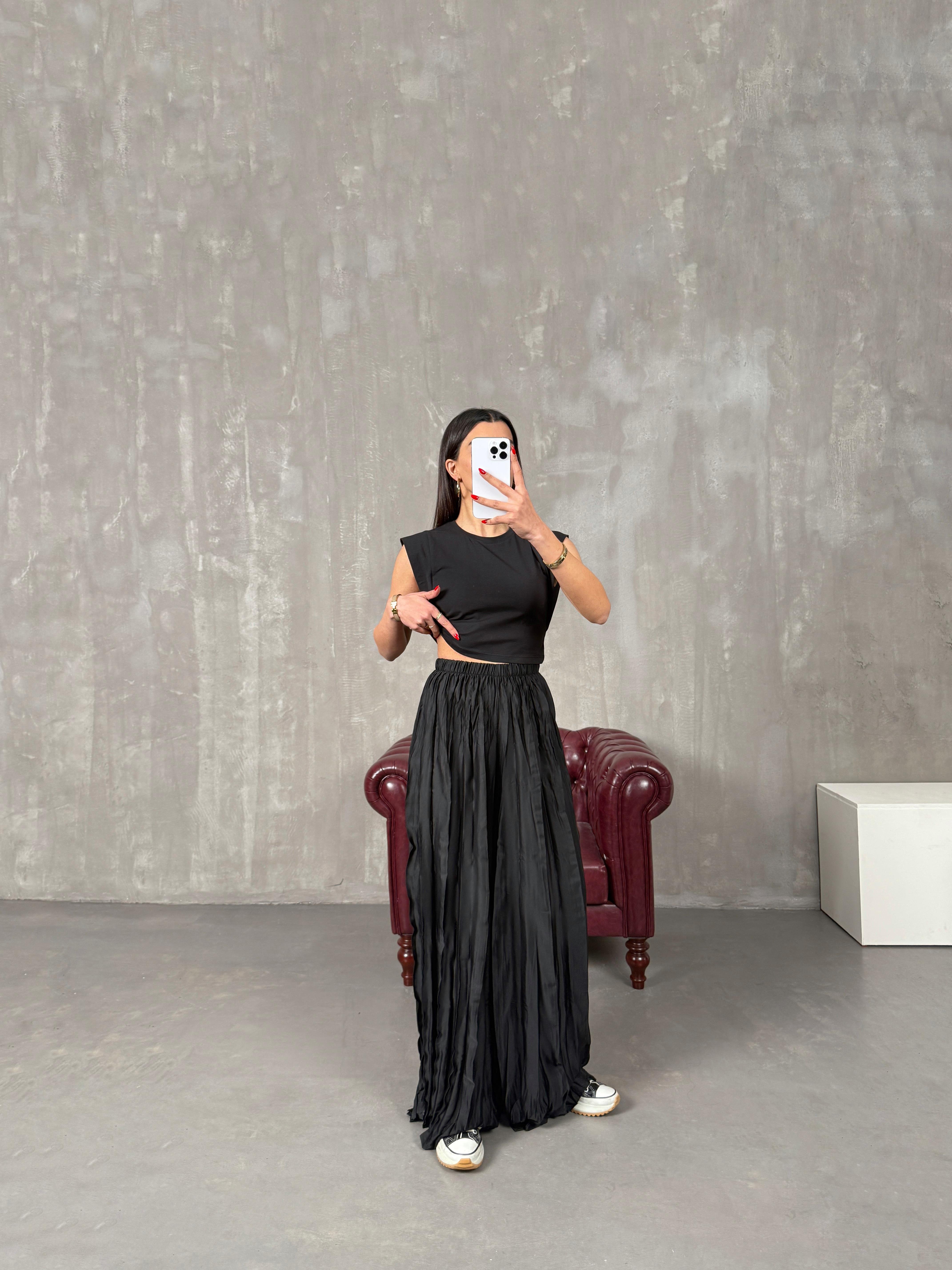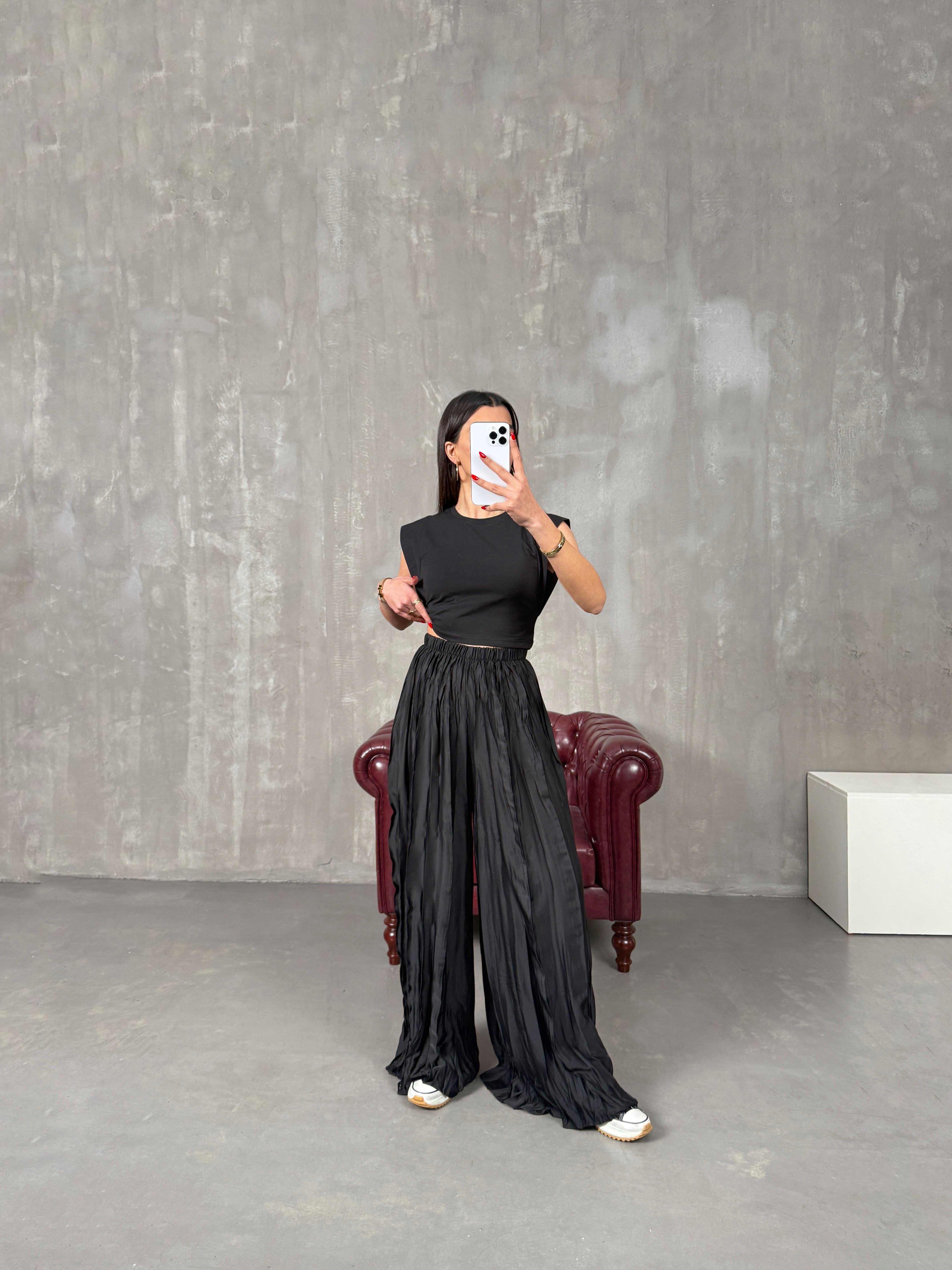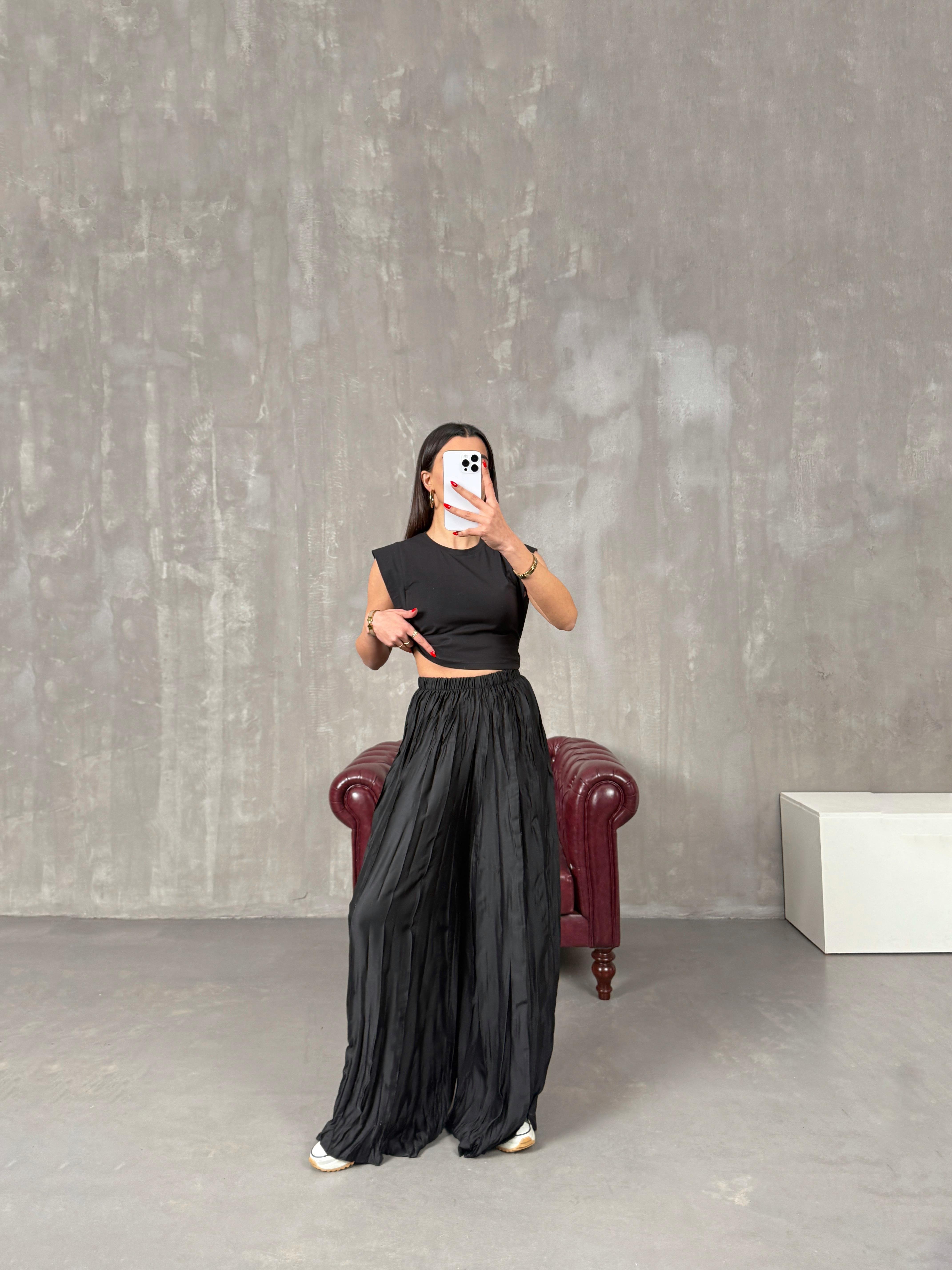 Helori Siyah Rahat Kırışık Pantolon