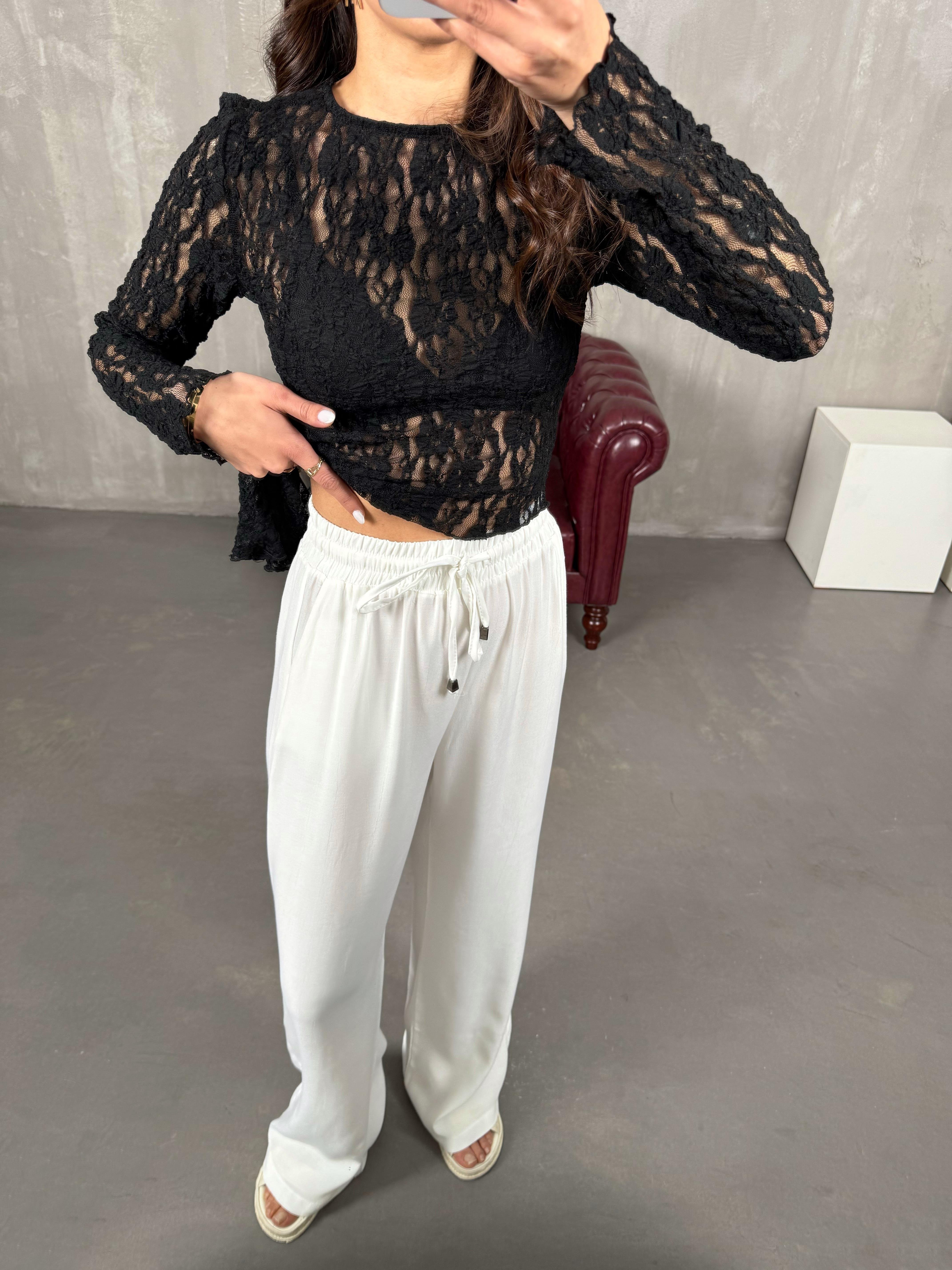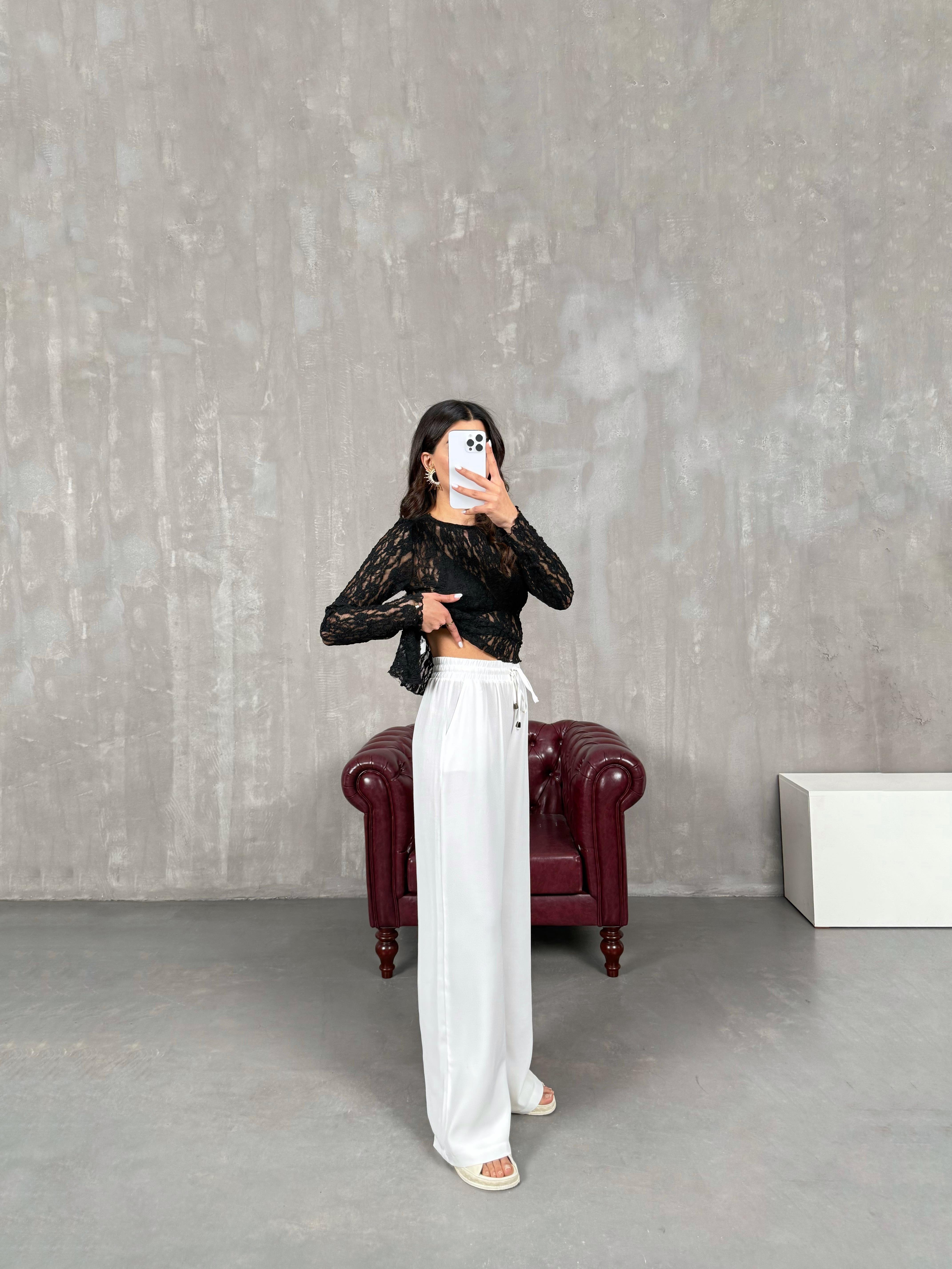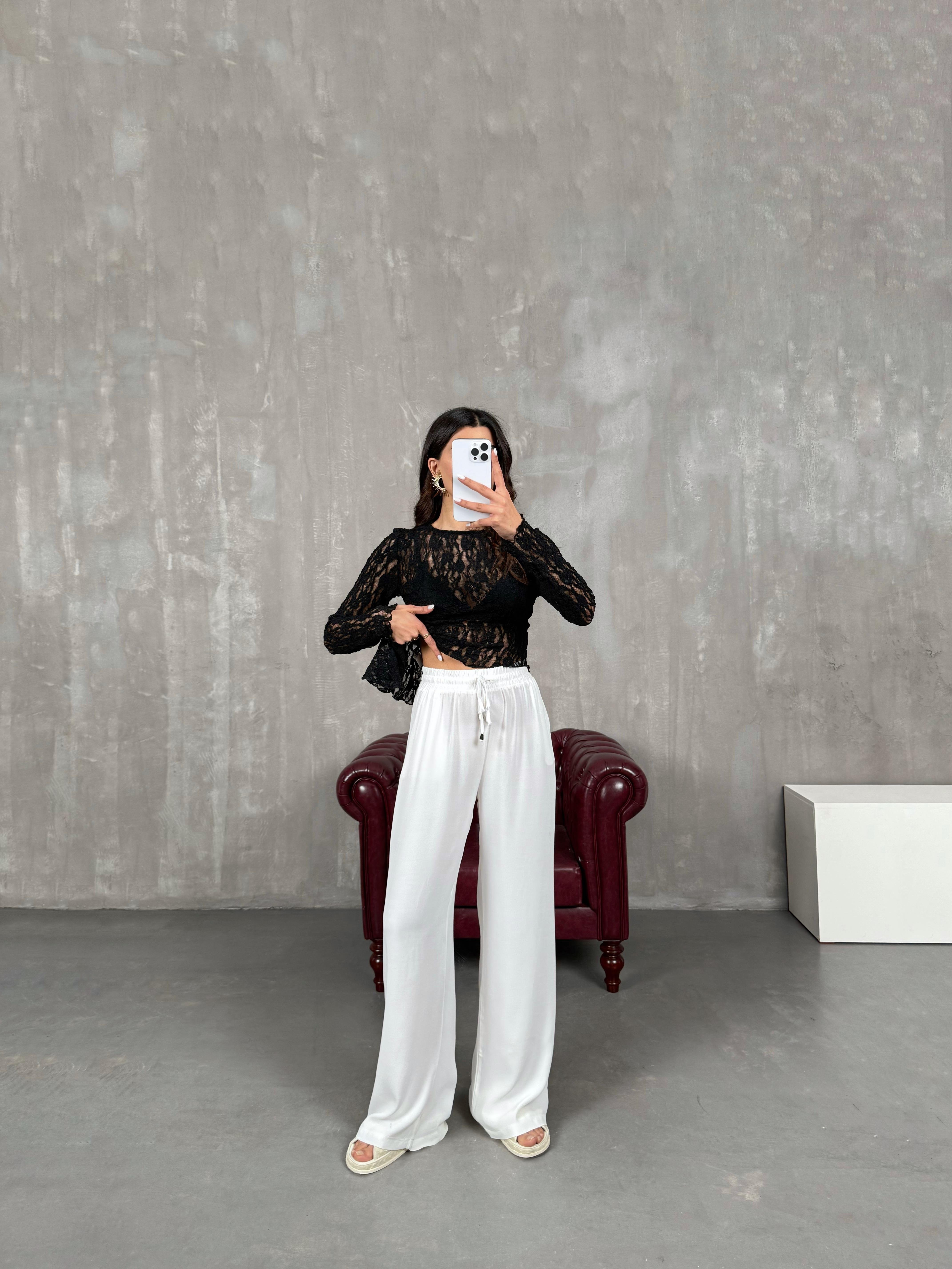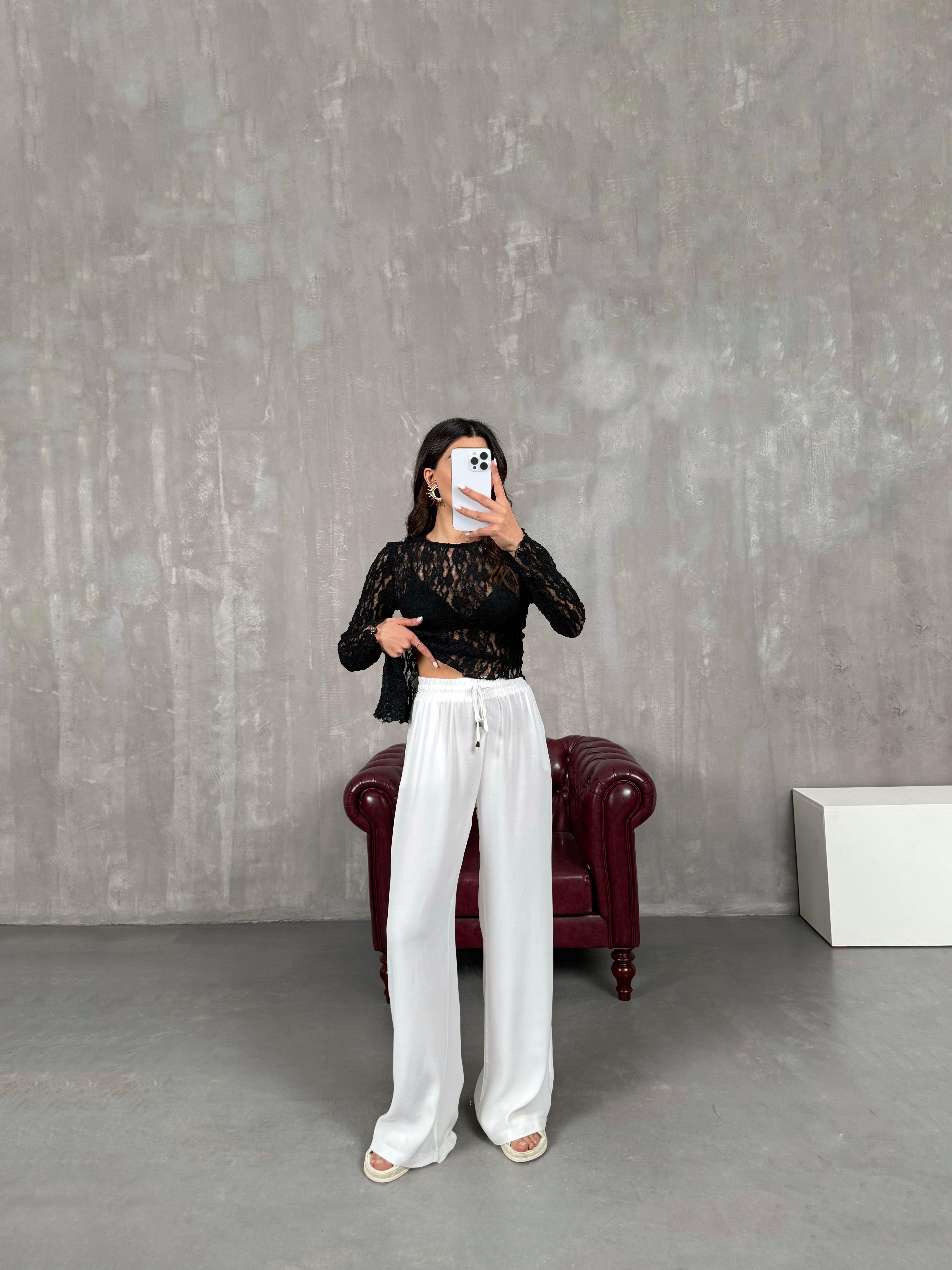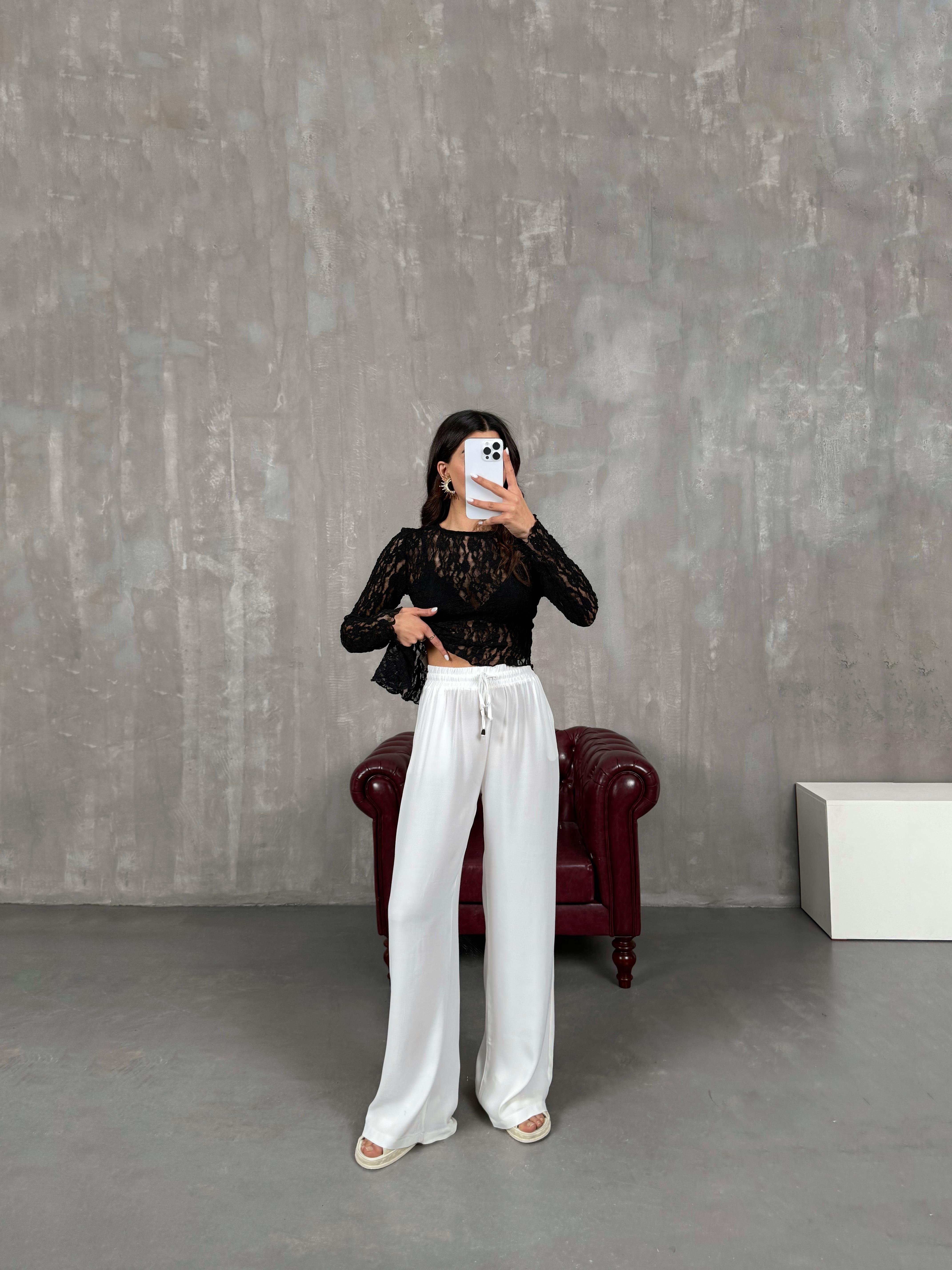 İvo Beyaz Belden İpli Viskon Karışımlı Pantolon