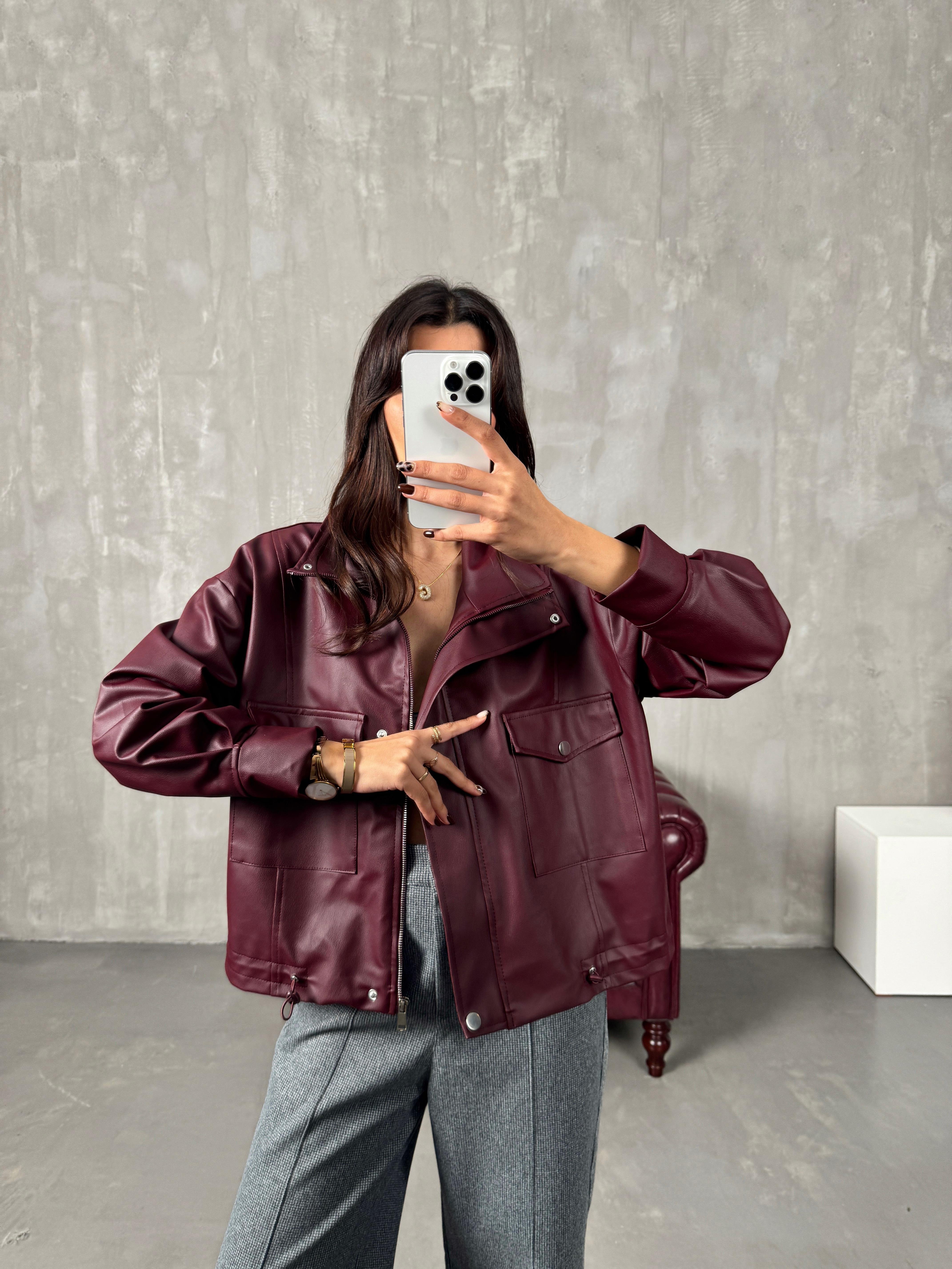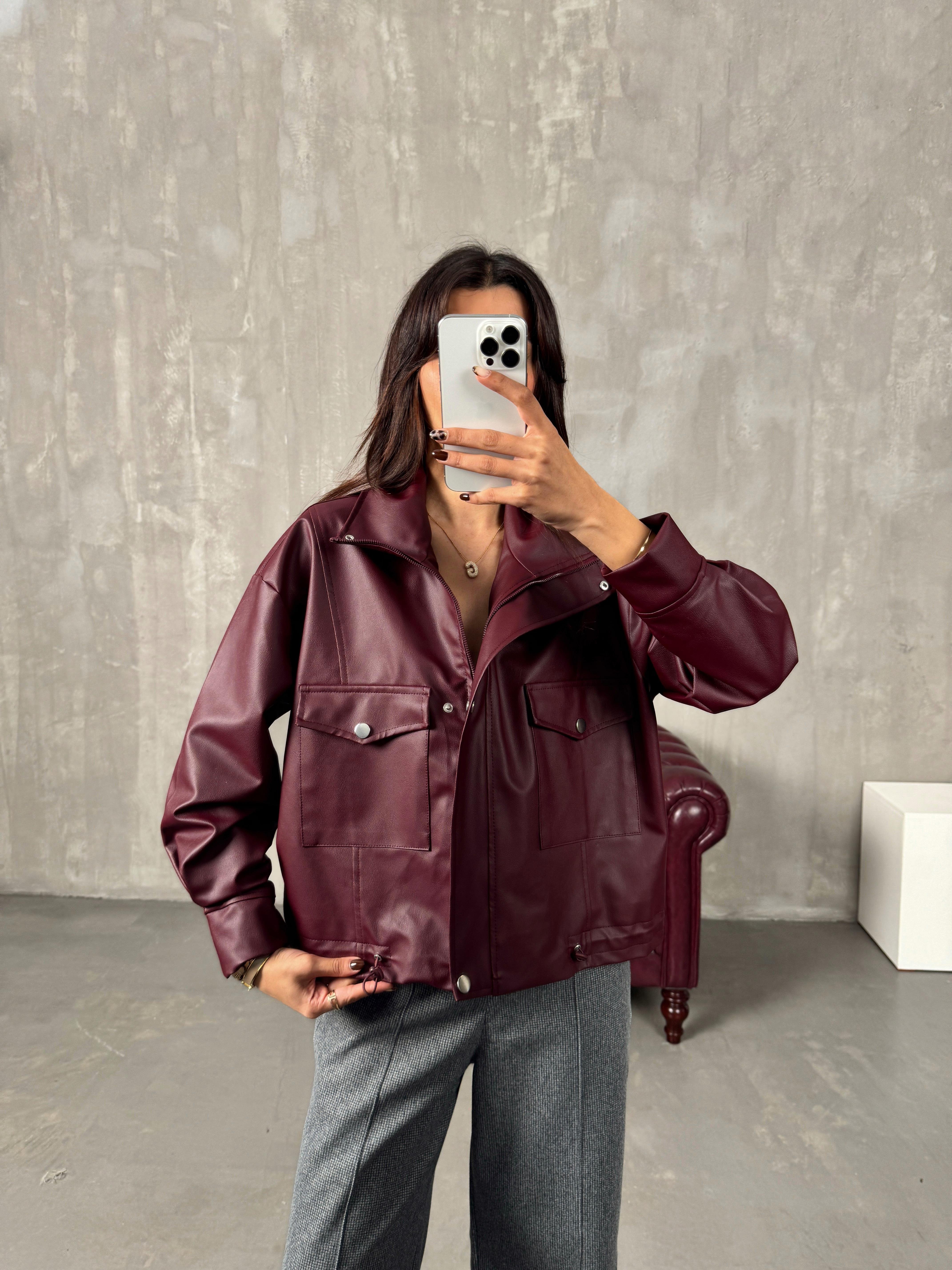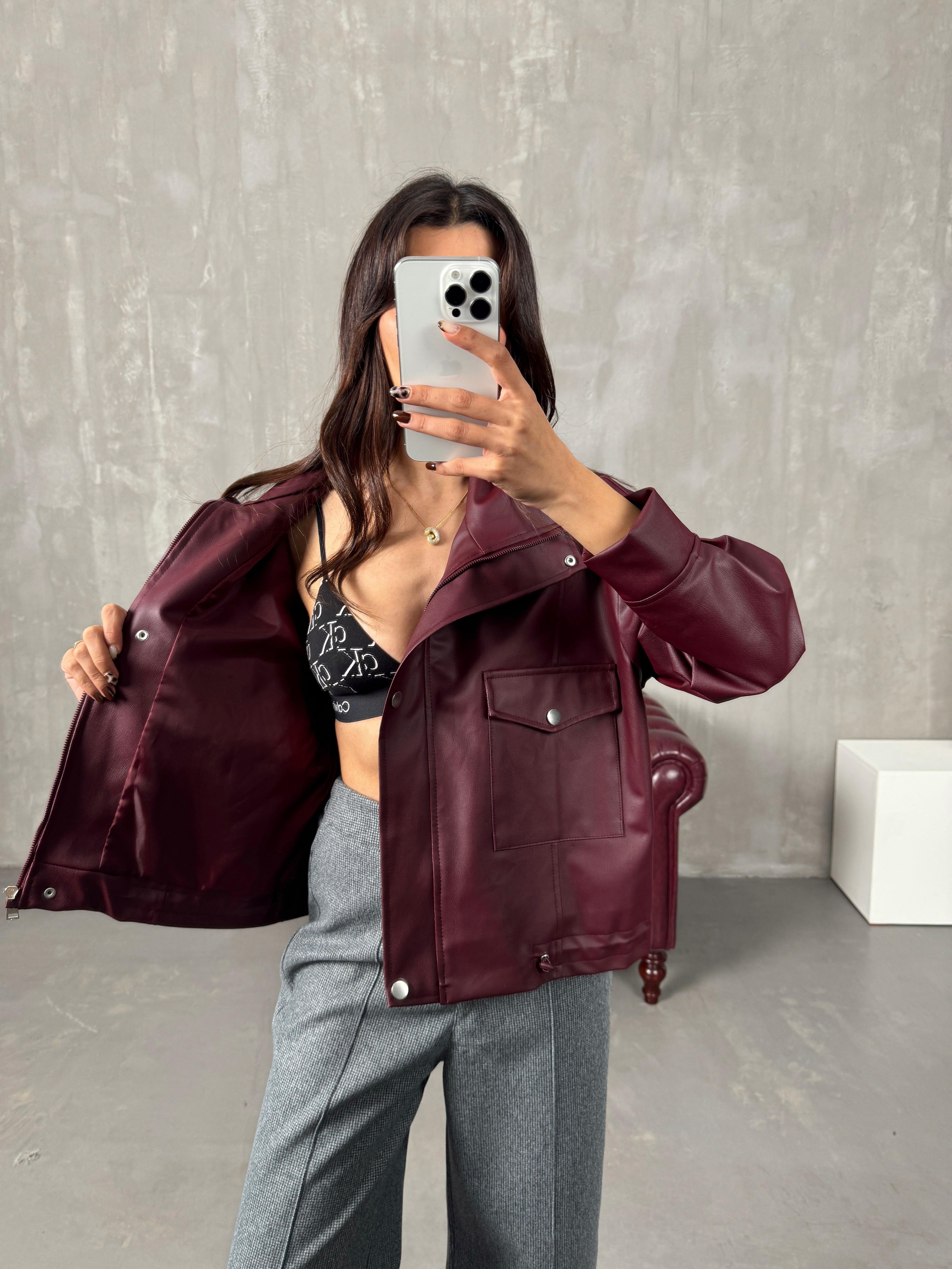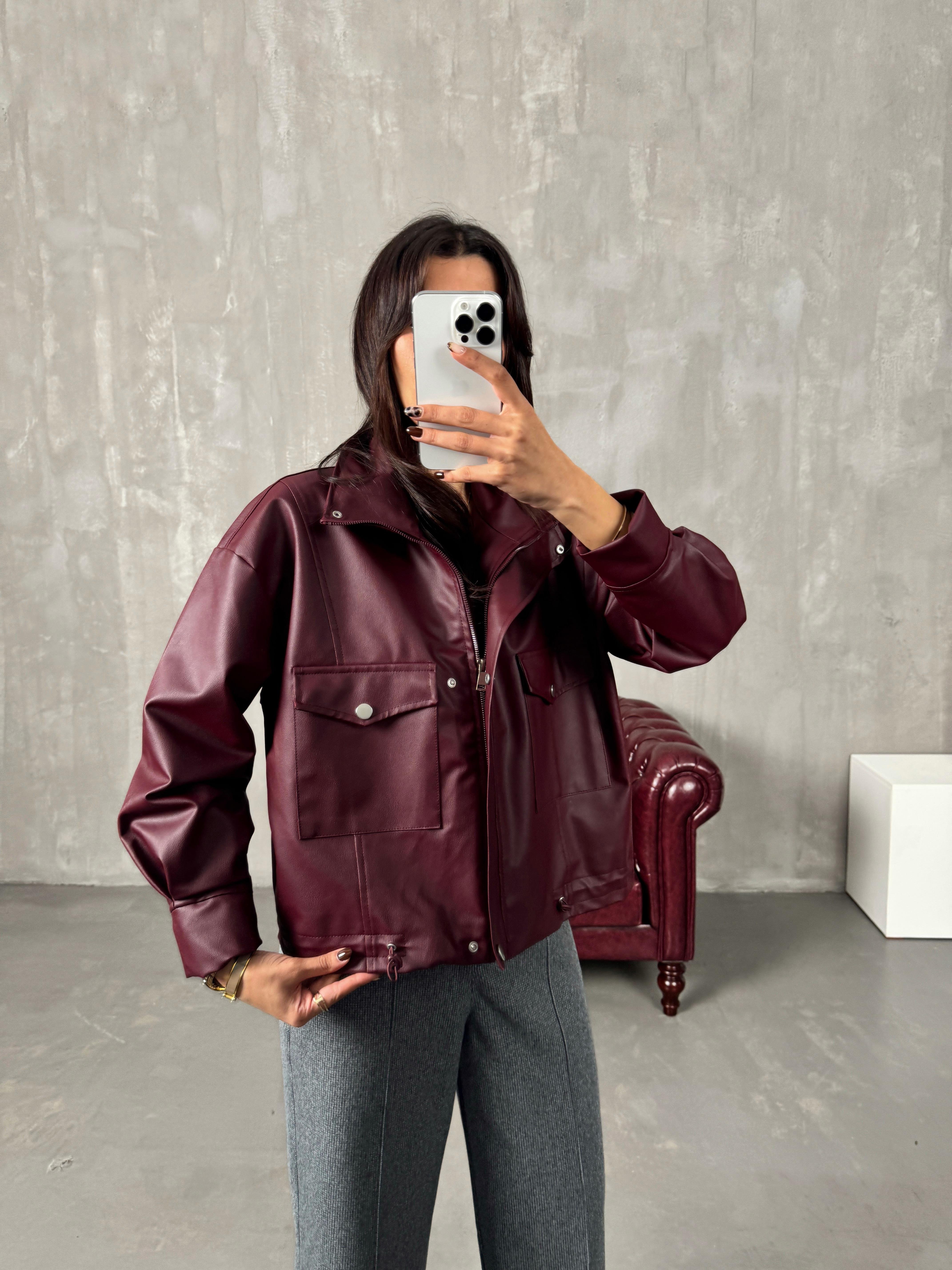 Julya Bordo Cepli Fermuarlı Astarlı Deri Ceket