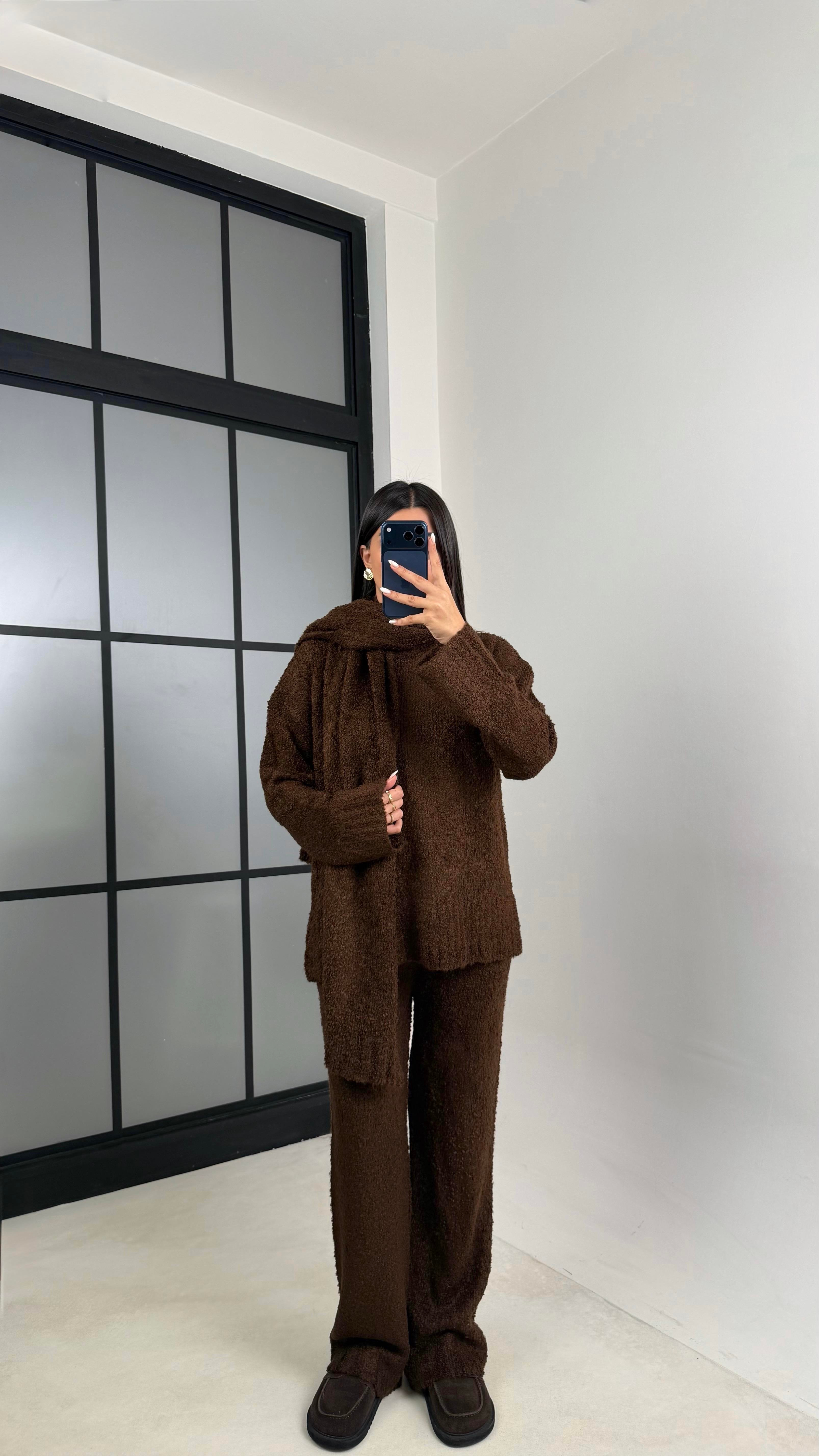 Kahve Atkı Detaylı Kazak Beli Lastikli Pantolon 3'Lü Yumuşak Dokulu Triko Takım GAUS-00654GAUSTAKIMGAUS-00654