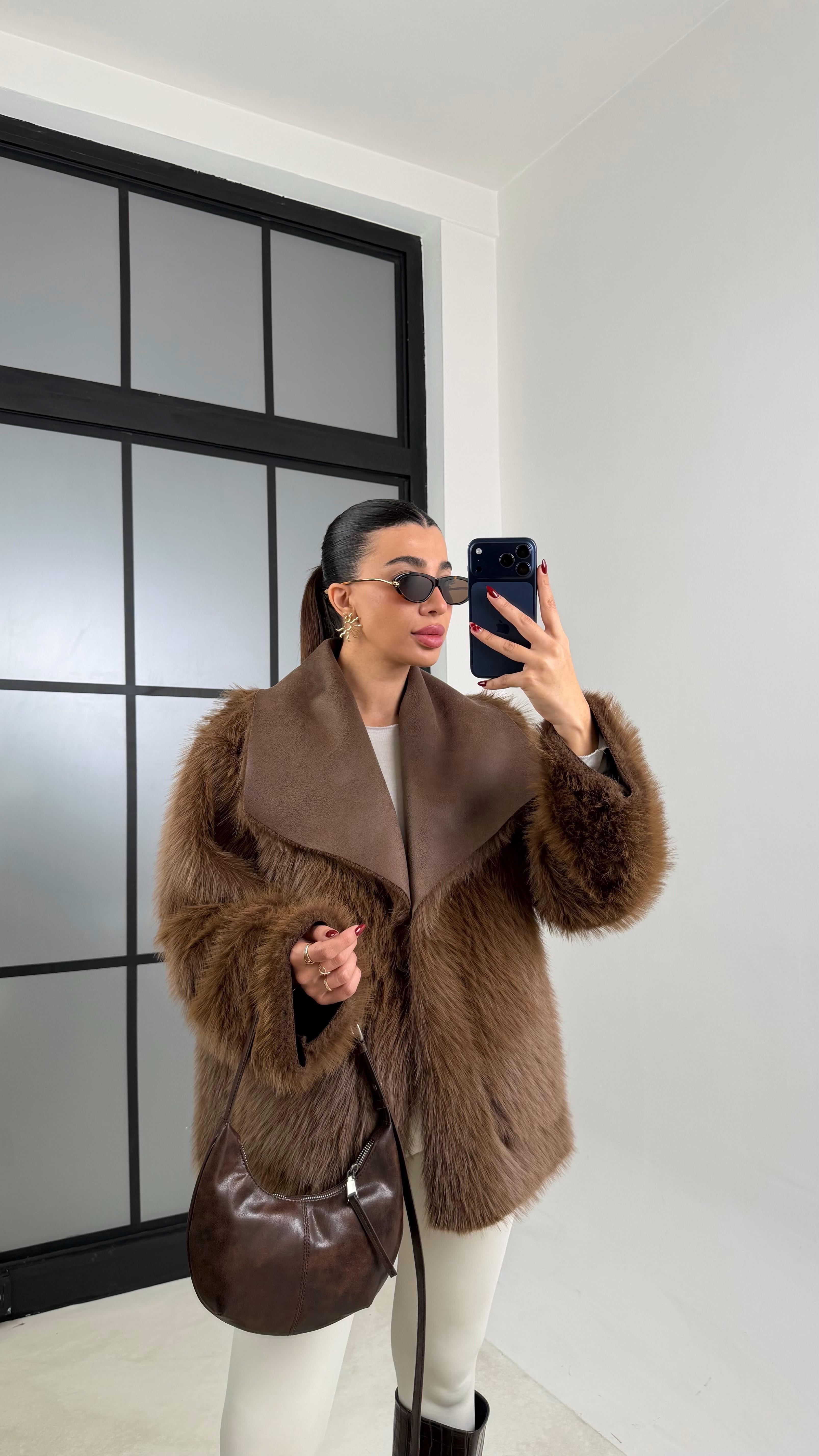 Kahve Çift Taraflı Tasarım Kürk Mont GAUS-00691